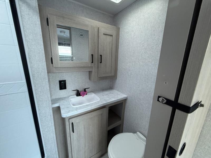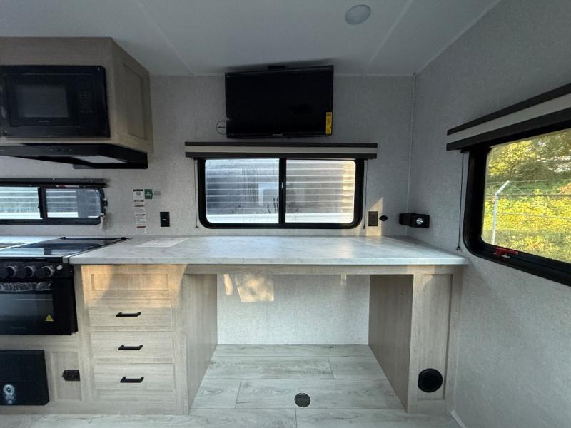 You will feel right at home in this travel trailer! For sleeping, there is a king-size bed with storage on both sides at the very front of this unit giving you privacy from the rest, and wardrobes on either side of the bed for your clothes. You will find storage beneath the bed for larger items or extra blankets, plus a space saving sliding door. The jiffy sofa and bar top with two bar stools offer comfortable seating as well as an extra sleeping space for an overnight guest, and the TV is a nice feature to enjoy on a rainy day. On the outside, an 16' awning provides a large outdoor living area protected from the elements, and the pass-through storage area will house all of your exterior gear like lawn chairs, outdoor games and rugs, plus so much more!