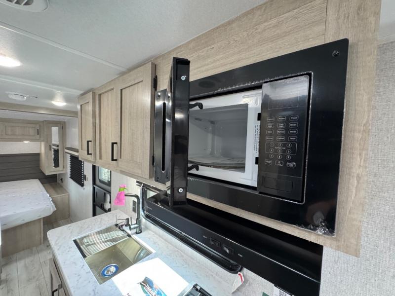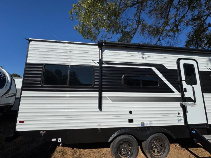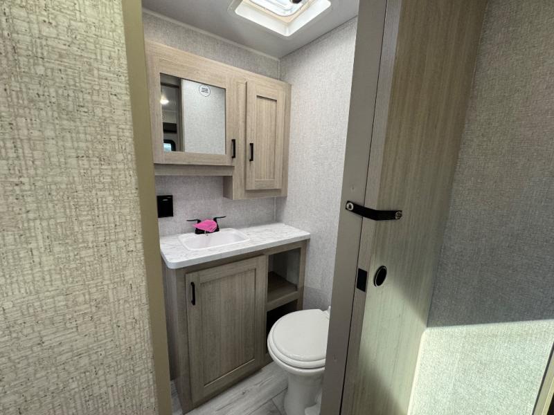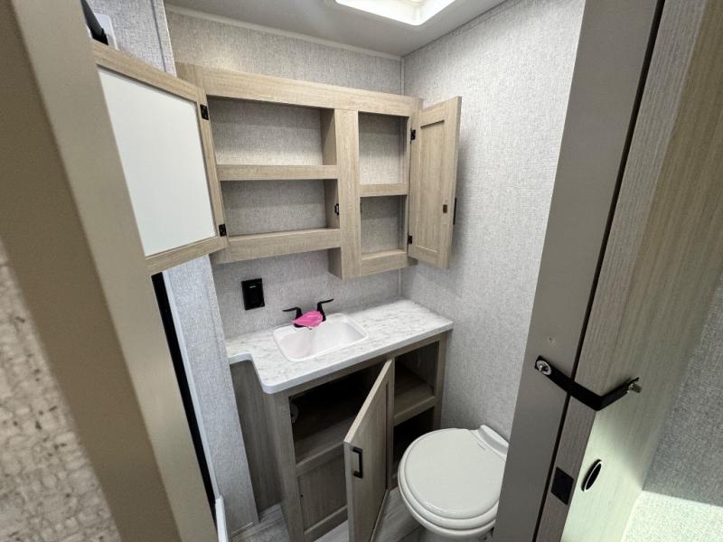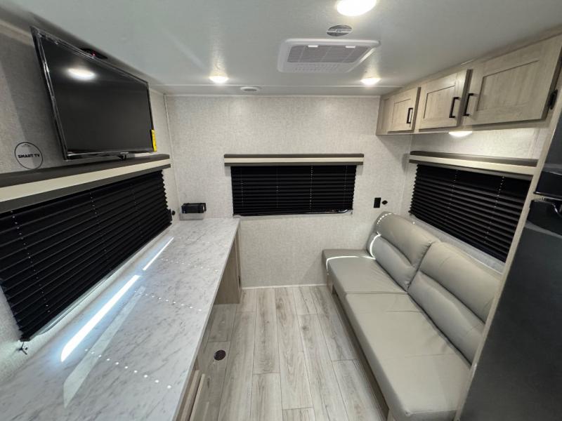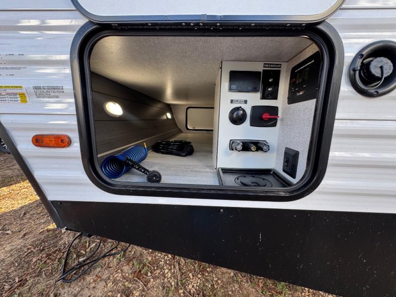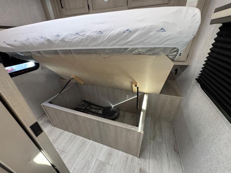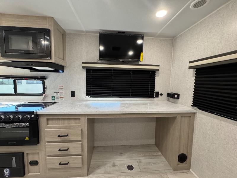 You will feel right at home in this travel trailer! For sleeping, there is a king-size bed with storage on both sides at the very front of this unit giving you privacy from the rest, and wardrobes on either side of the bed for your clothes. You will find storage beneath the bed for larger items or extra blankets, plus a space saving sliding door. The jiffy sofa and bar top with two bar stools offer comfortable seating as well as an extra sleeping space for an overnight guest, and the TV is a nice feature to enjoy on a rainy day. On the outside, an 16' awning provides a large outdoor living area protected from the elements, and the pass-through storage area will house all of your exterior gear like lawn chairs, outdoor games and rugs, plus so much more!