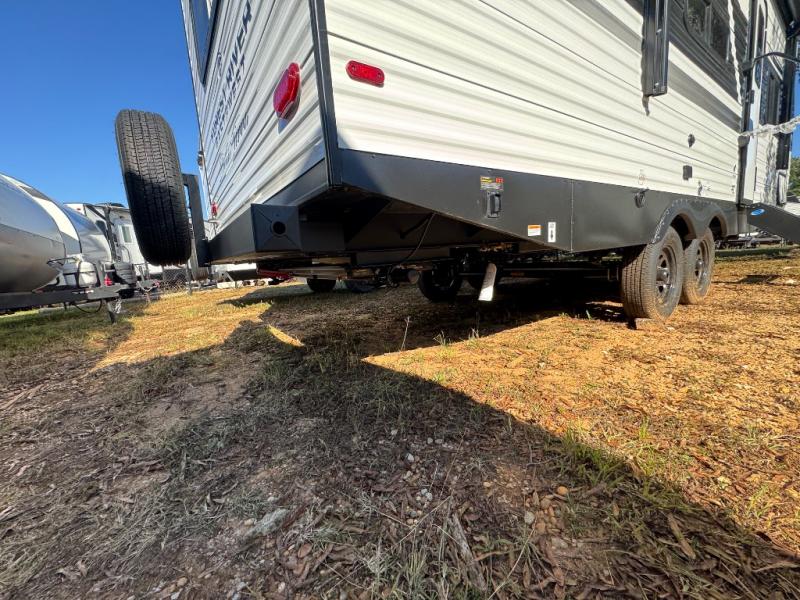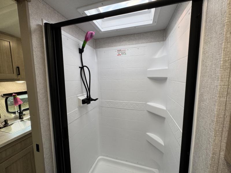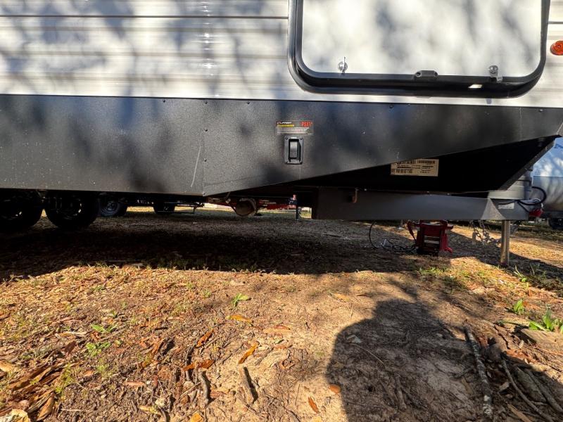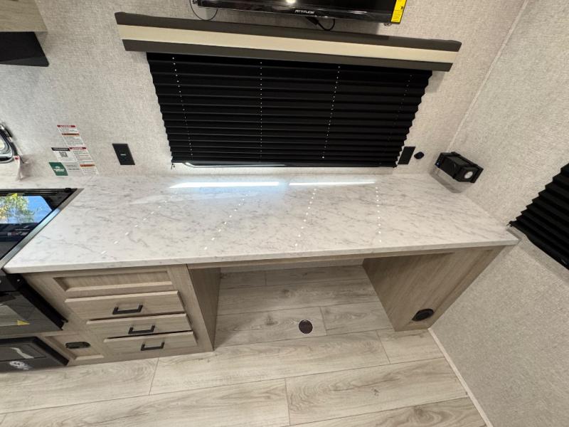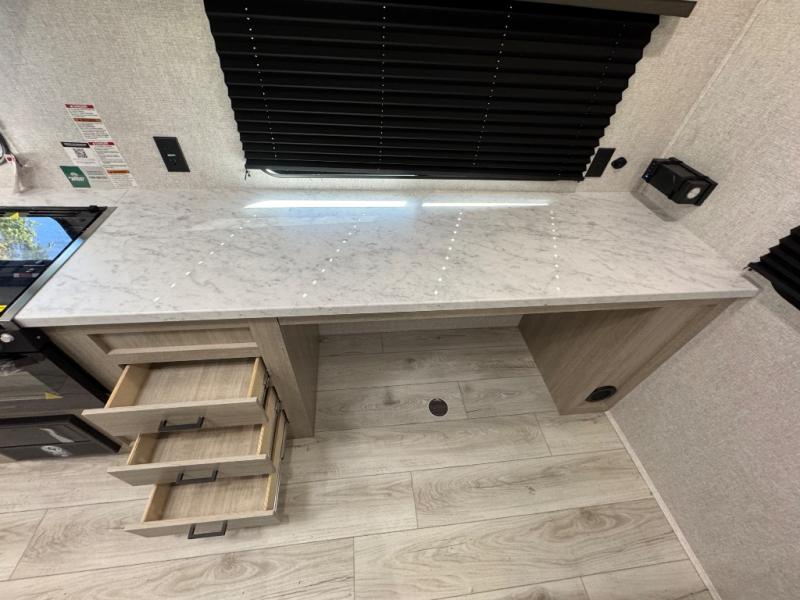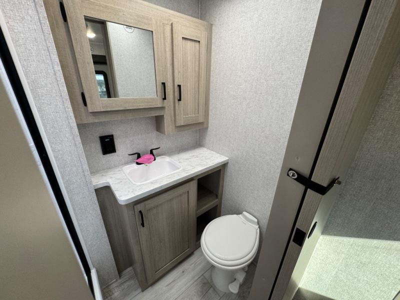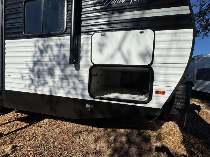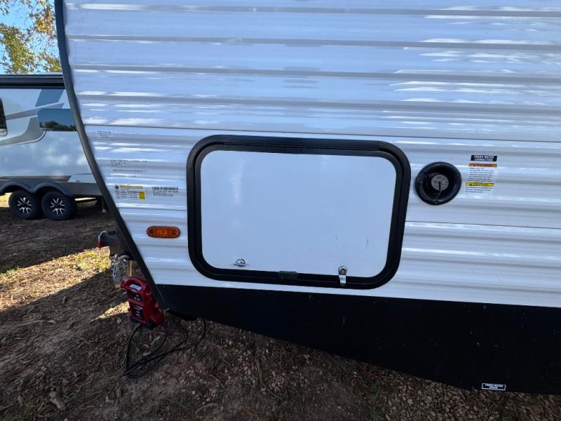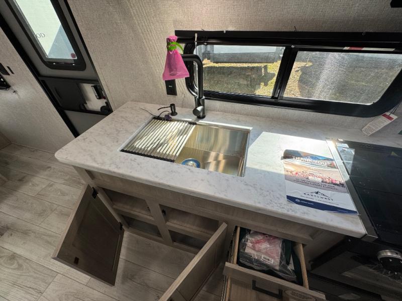 You will feel right at home in this travel trailer! For sleeping, there is a king-size bed with storage on both sides at the very front of this unit giving you privacy from the rest, and wardrobes on either side of the bed for your clothes. You will find storage beneath the bed for larger items or extra blankets, plus a space saving sliding door. The jiffy sofa and bar top with two bar stools offer comfortable seating as well as an extra sleeping space for an overnight guest, and the TV is a nice feature to enjoy on a rainy day. On the outside, an 16' awning provides a large outdoor living area protected from the elements, and the pass-through storage area will house all of your exterior gear like lawn chairs, outdoor games and rugs, plus so much more!