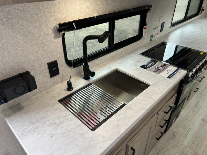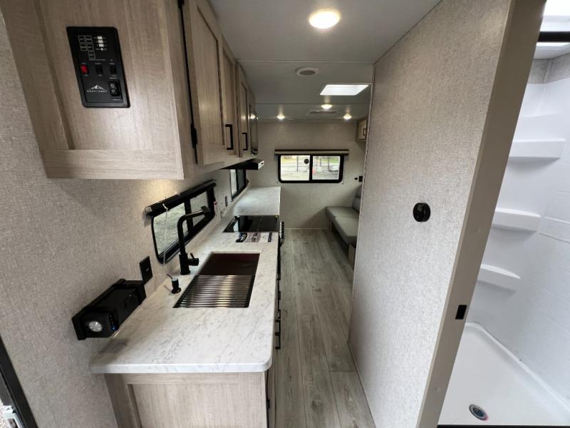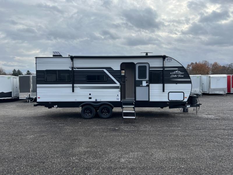 Each Della Terra travel trailer by EAST TO WEST is constructed with an enclosed and heated underbelly and enclosed holding tanks for added protection against the elements. There is also a power tongue jack with an LED light for easy set up and a power awning with LED lights you can rest under after you've unpacked. The Explore Comfort Package comes seamless pressed countertops, kitchen backsplash, window valance package with black night shades, and many more comforts. You will also appreciate the Adventure Outdoor Package with backup camera prep and solar prep, a tankless water heater, an RV grill quick disconnect, and a universal docking station with battery disconnect.