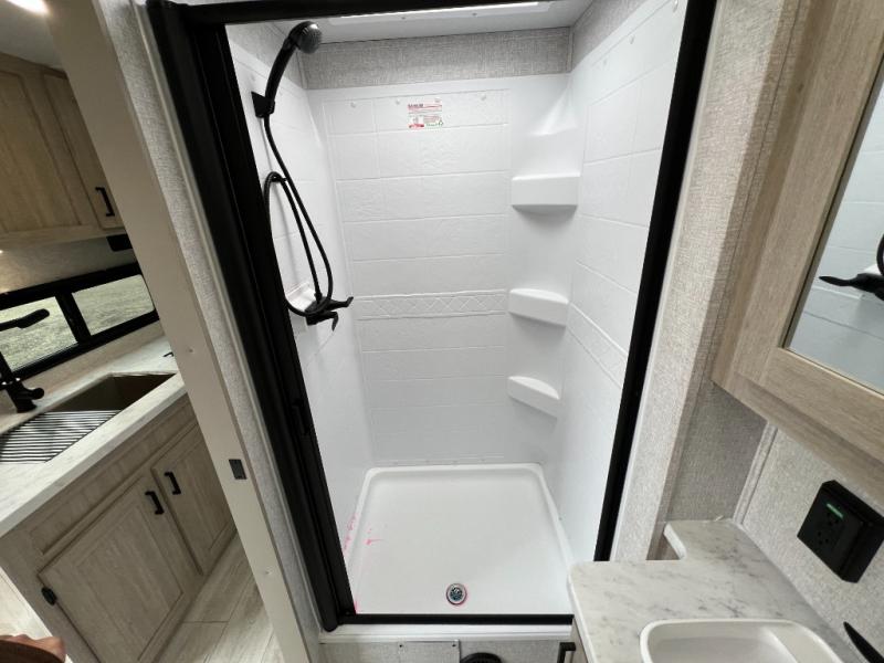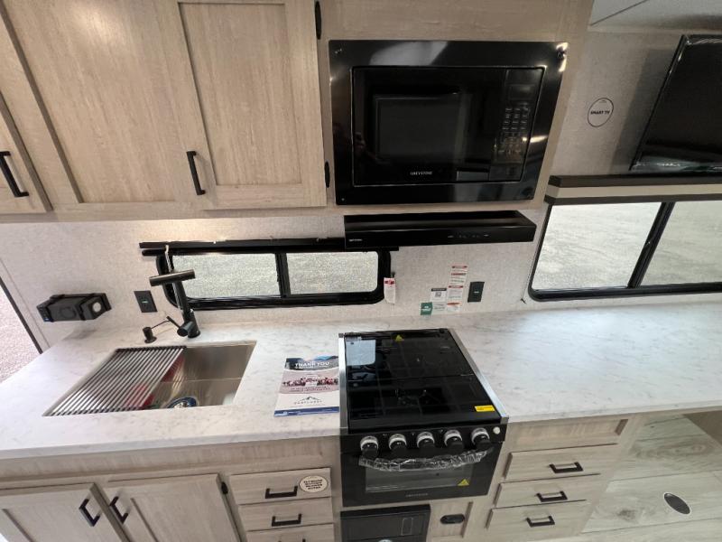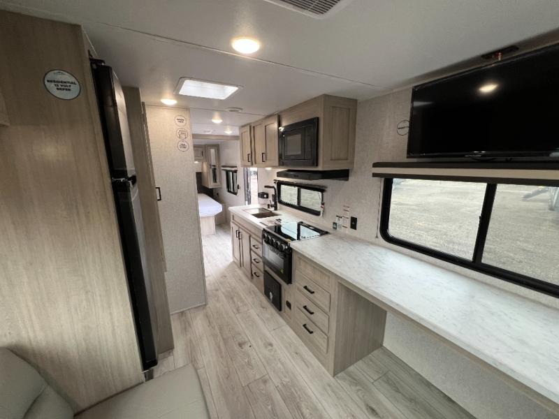 You will feel right at home in this travel trailer! For sleeping, there is a king-size bed with storage on both sides at the very front of this unit giving you privacy from the rest, and wardrobes on either side of the bed for your clothes. You will find storage beneath the bed for larger items or extra blankets, plus a space saving sliding door. The jiffy sofa and bar top with two bar stools offer comfortable seating as well as an extra sleeping space for an overnight guest, and the TV is a nice feature to enjoy on a rainy day. On the outside, an 16' awning provides a large outdoor living area protected from the elements, and the pass-through storage area will house all of your exterior gear like lawn chairs, outdoor games and rugs, plus so much more!