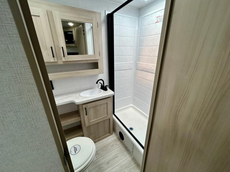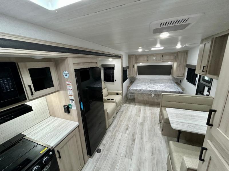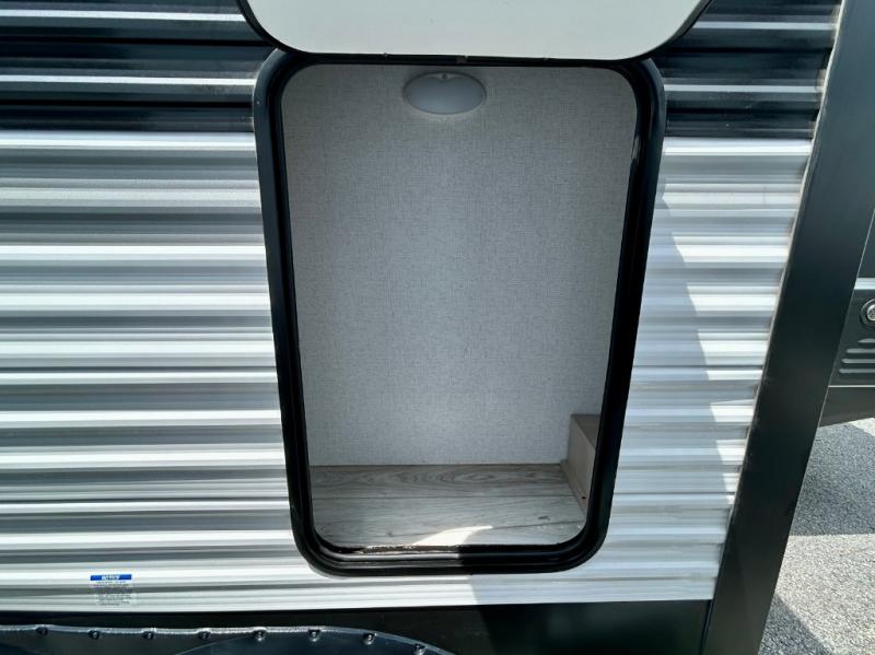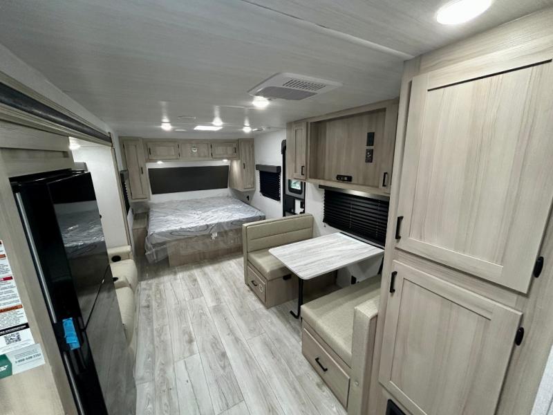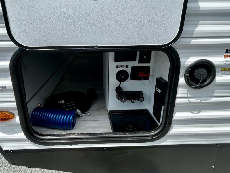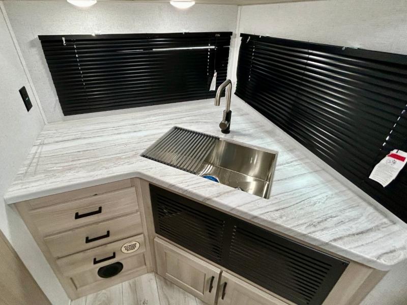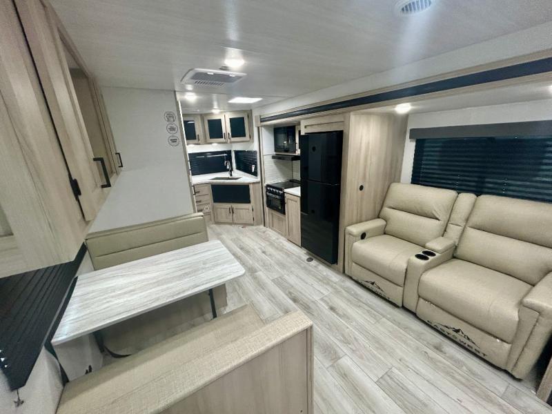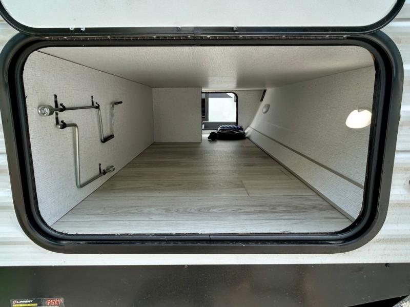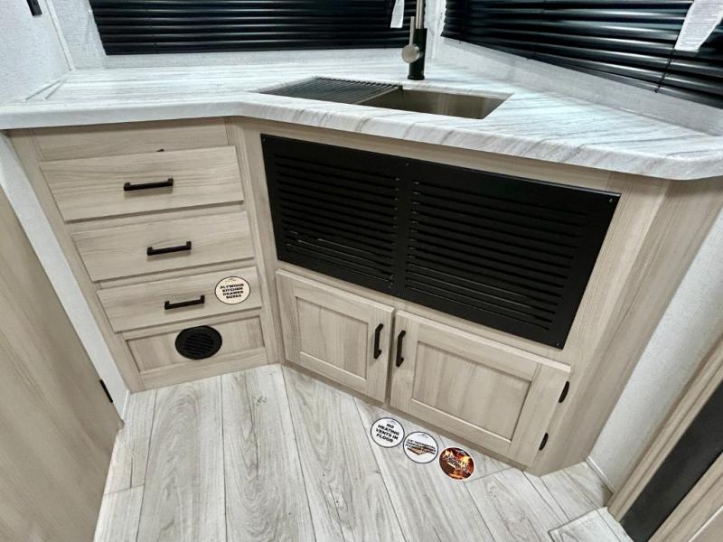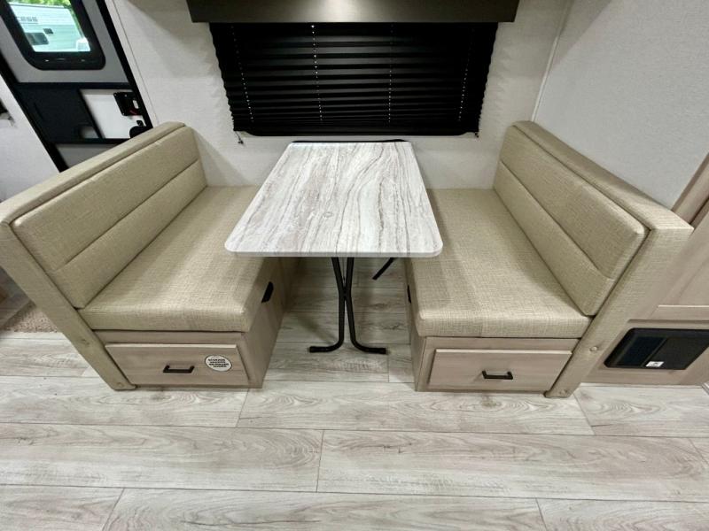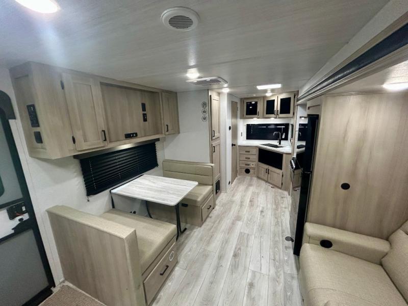Head to the lake in this travel trailer with a large slide out for more space and comfort! Once you arrive, you can put out the 18' power awning, unload the pass-through storage, and make lunch on the outdoor kitchen with a pull-out griddle and refrigerator. The booth dinette inside can be used as dining space, and there is storage underneath here for added convenience. A jiffy sofa within the slide can be switched out for an optional theater seat if you don't need the extra sleeping space. You will also find a full interior kitchen in the rear corner, and the full bath in the other rear corner is sure to come in handy. When you're ready for some shut-eye, the king bed in the front bedroom will feel just like home. There are also dual wardrobes and nightstands to keep your things tidy!