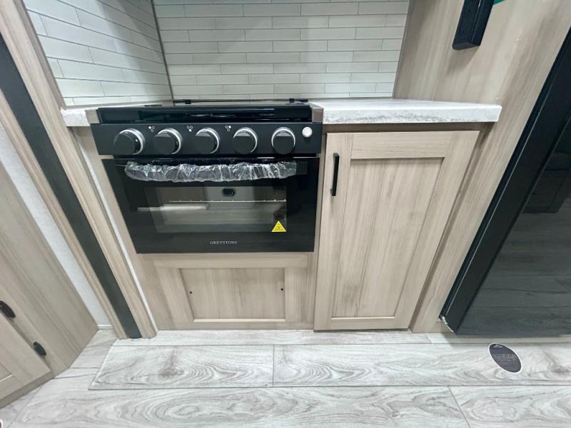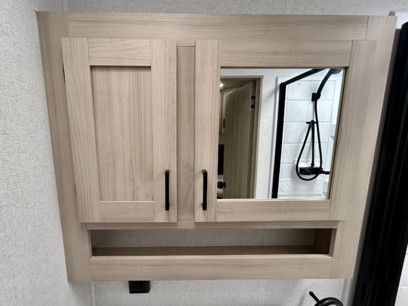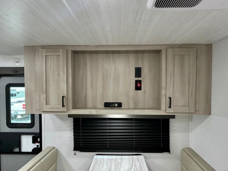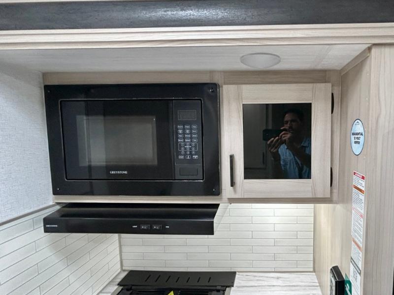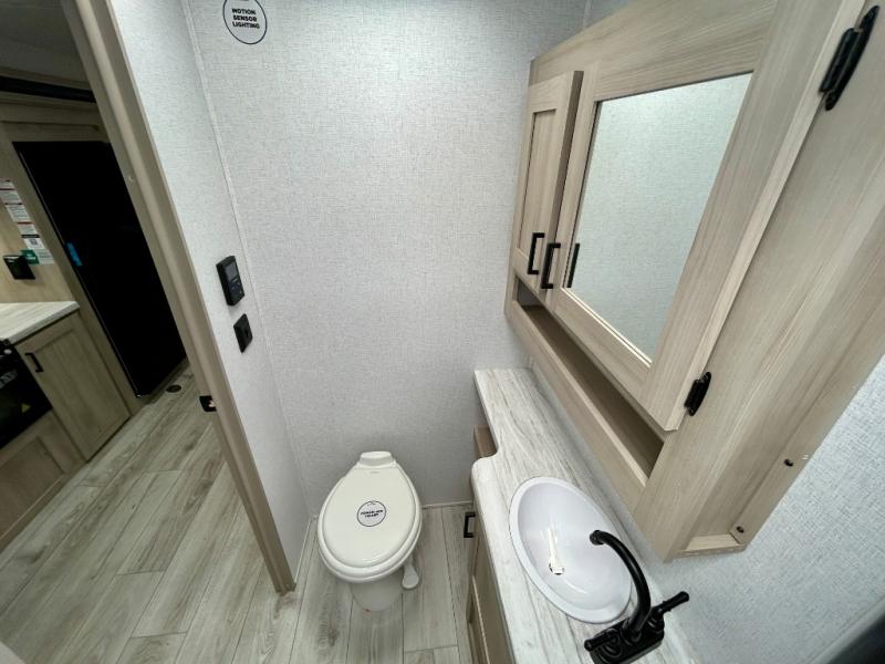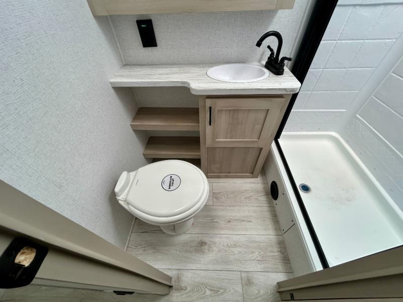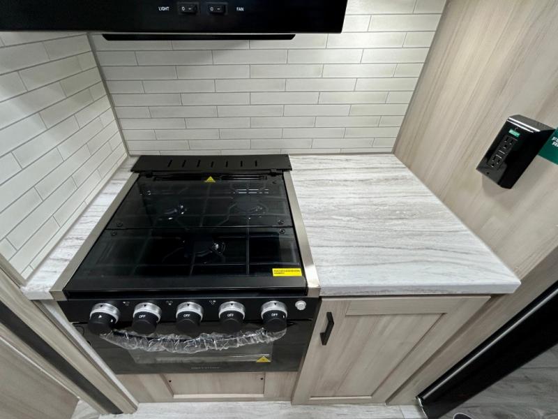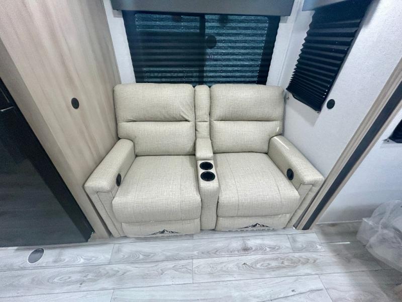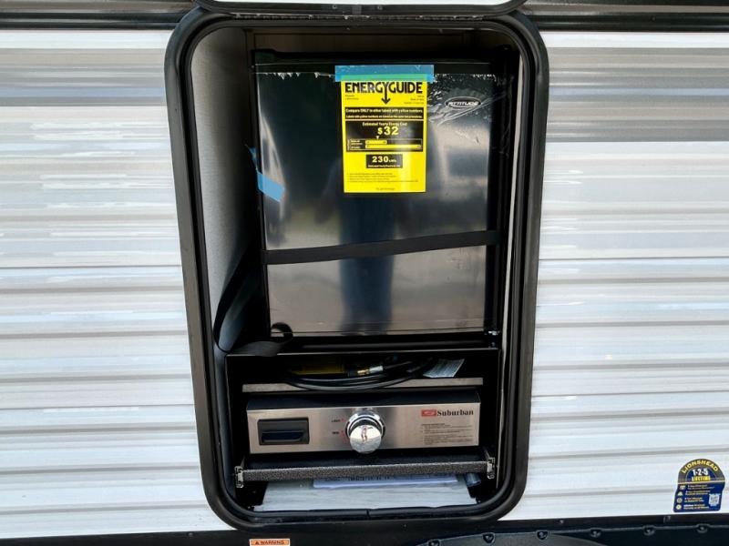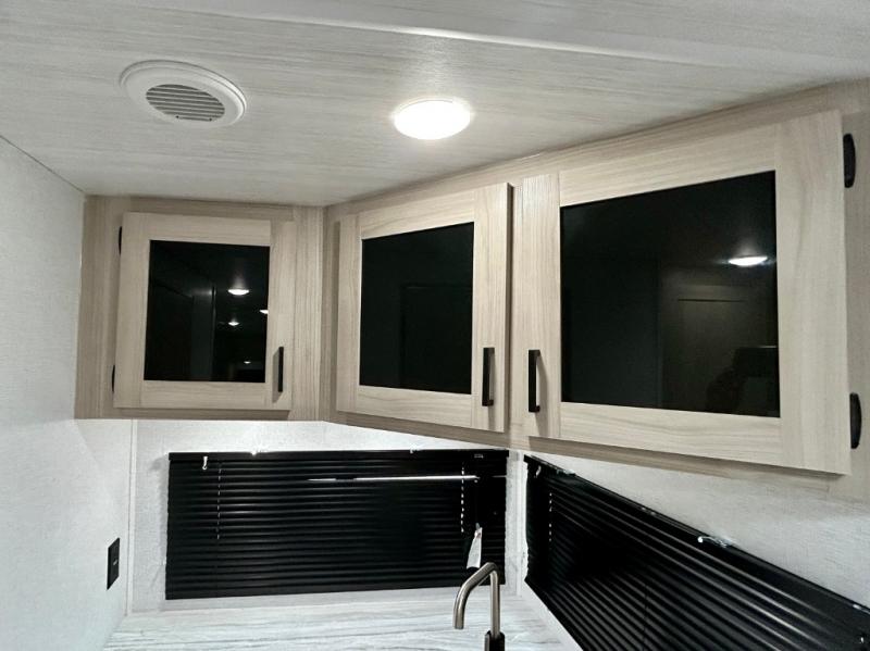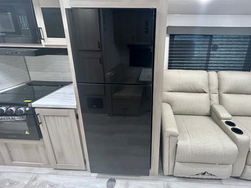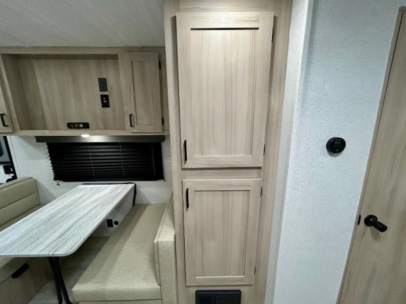 Head to the lake in this travel trailer with a large slide out for more space and comfort! Once you arrive, you can put out the 18' power awning, unload the pass-through storage, and make lunch on the outdoor kitchen with a pull-out griddle and refrigerator. The booth dinette inside can be used as dining space, and there is storage underneath here for added convenience. A jiffy sofa within the slide can be switched out for an optional theater seat if you don't need the extra sleeping space. You will also find a full interior kitchen in the rear corner, and the full bath in the other rear corner is sure to come in handy. When you're ready for some shut-eye, the king bed in the front bedroom will feel just like home. There are also dual wardrobes and nightstands to keep your things tidy!