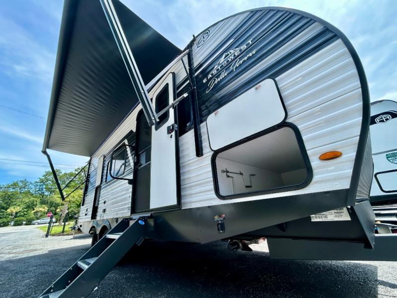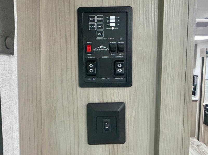 Each Della Terra travel trailer by EAST TO WEST is constructed with an enclosed and heated underbelly and enclosed holding tanks so you can camp all year long. There is also a power tongue jack with an LED light for easy set up and a power awning with LED lights you can rest under after you've unpacked. The Explore Comfort Package comes seamless pressed countertops, kitchen backsplash, window valance package with black night shades, and many more comforts. You will also appreciate the Adventure Outdoor Package with backup camera prep and solar prep, a tankless water heater, an RV grill quick disconnect, and a universal docking station with battery disconnect.