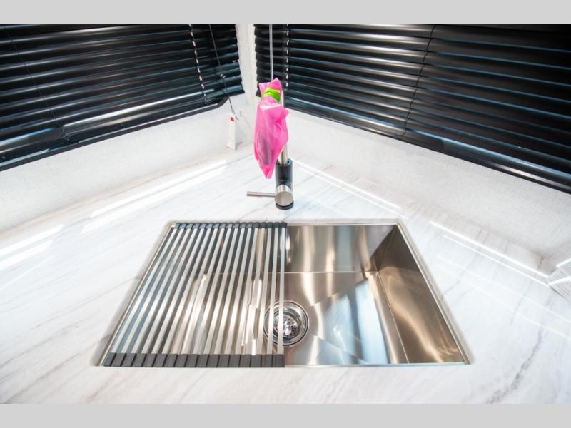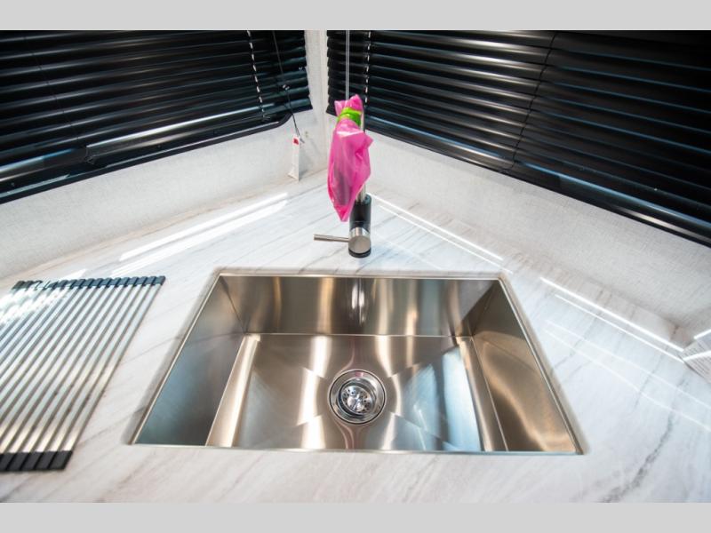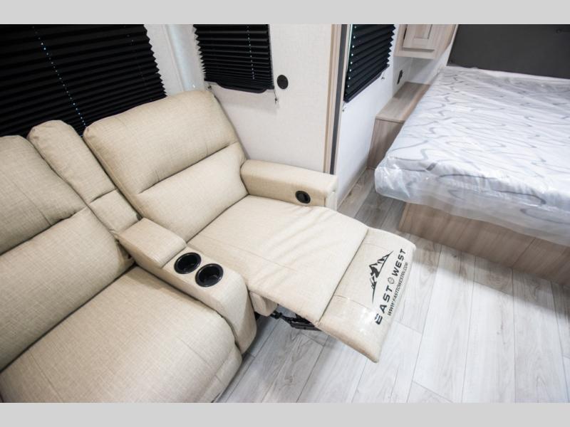 Each Della Terra travel trailer by EAST TO WEST is constructed with an enclosed and heated underbelly and enclosed holding tanks so you can camp all year long. There is also a power tongue jack with an LED light for easy set up and a power awning with LED lights you can rest under after you've unpacked. The Explore Comfort Package comes seamless pressed countertops, kitchen backsplash, window valance package with black night shades, and many more comforts. You will also appreciate the Adventure Outdoor Package with backup camera prep and solar prep, a tankless water heater, an RV grill quick disconnect, and a universal docking station with battery disconnect.