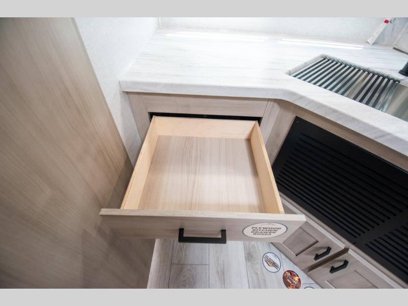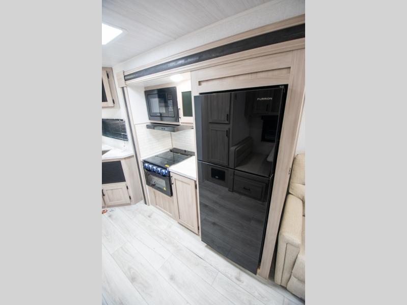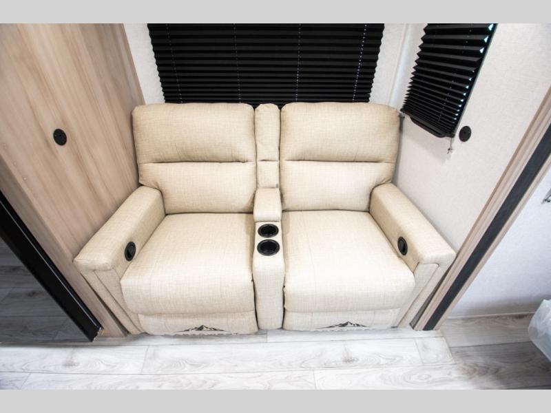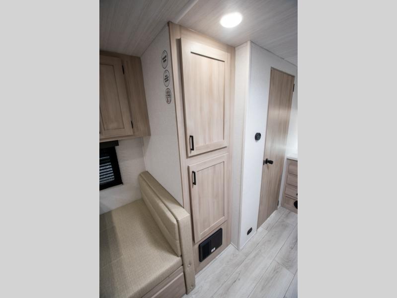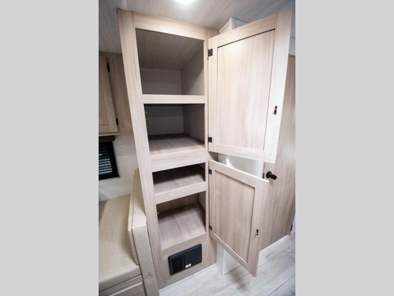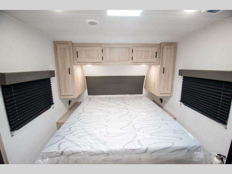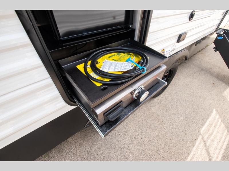 Head to the lake in this travel trailer with a large slide out for more space and comfort! Once you arrive, you can put out the 18' power awning, unload the pass-through storage, and make lunch on the outdoor kitchen with a pull-out griddle and refrigerator. The booth dinette inside can be used as dining space, and there is storage underneath here for added convenience. A jiffy sofa within the slide can be switched out for an optional theater seat if you don't need the extra sleeping space. You will also find a full interior kitchen in the rear corner, and the full bath in the other rear corner is sure to come in handy. When you're ready for some shut-eye, the king bed in the front bedroom will feel just like home. There are also dual wardrobes and nightstands to keep your things tidy!
