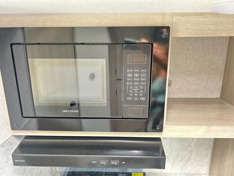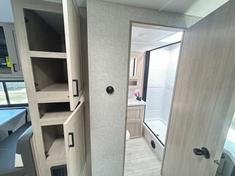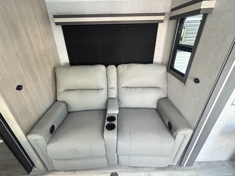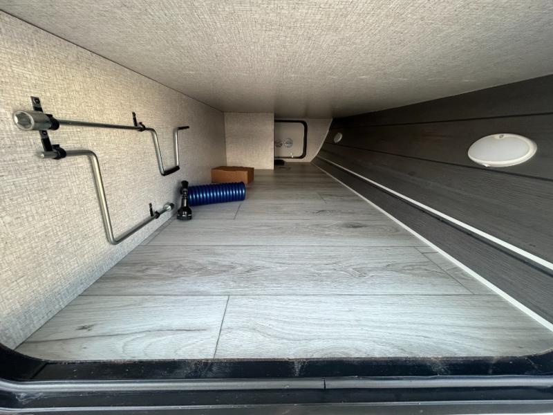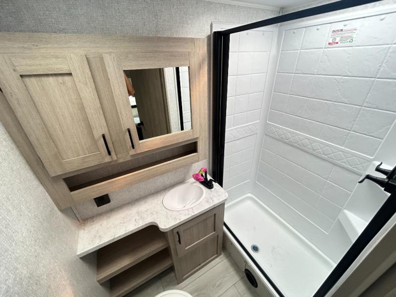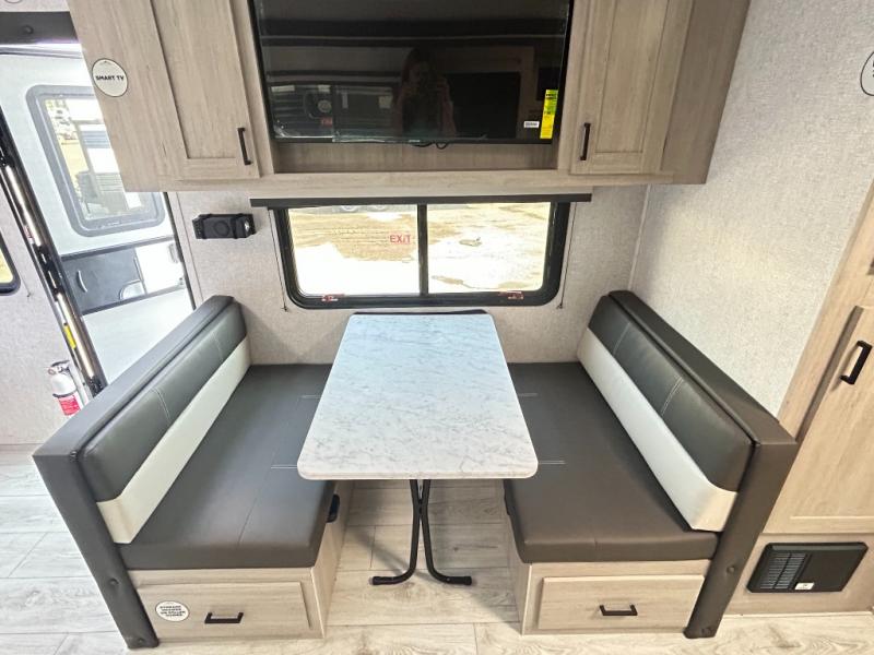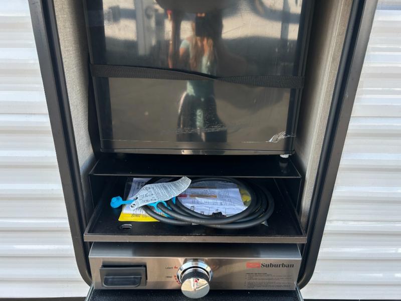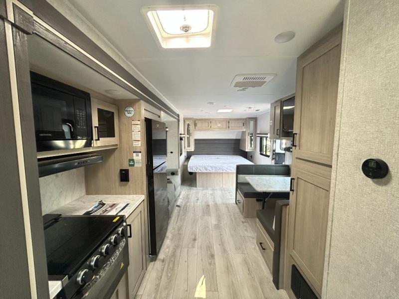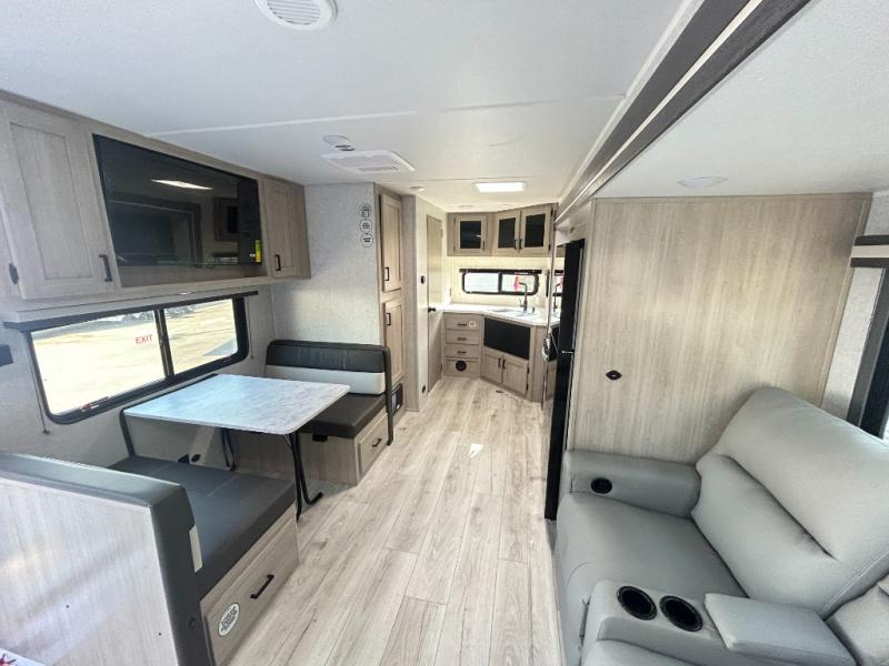 Head to the lake in this travel trailer with a large slide out for more space and comfort! Once you arrive, you can put out the 18' power awning, unload the pass-through storage, and make lunch on the outdoor kitchen with a pull-out griddle and refrigerator. The booth dinette inside can be used as dining space, and there is storage underneath here for added convenience. A jiffy sofa within the slide can be switched out for an optional theater seat if you don't need the extra sleeping space. You will also find a full interior kitchen in the rear corner, and the full bath in the other rear corner is sure to come in handy. When you're ready for some shut-eye, the king bed in the front bedroom will feel just like home. There are also dual wardrobes and nightstands to keep your things tidy!