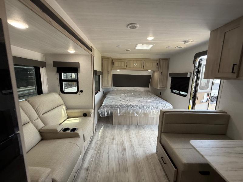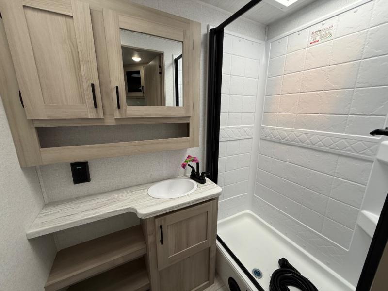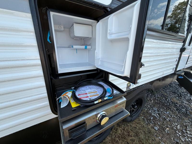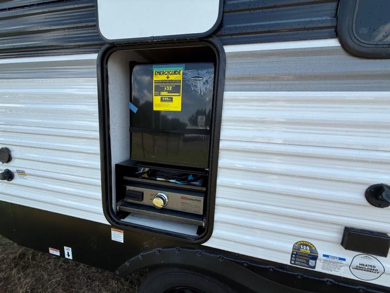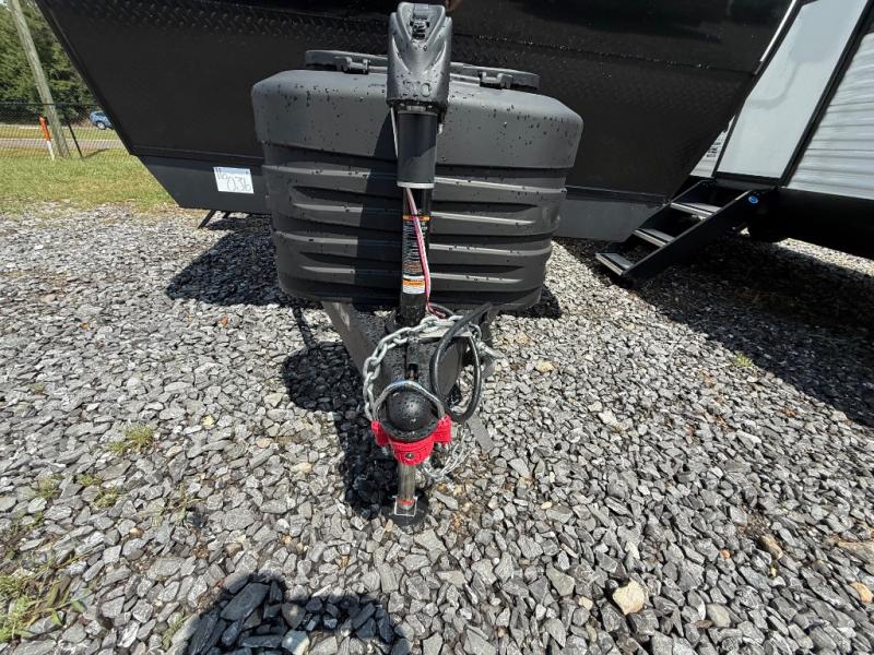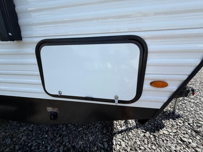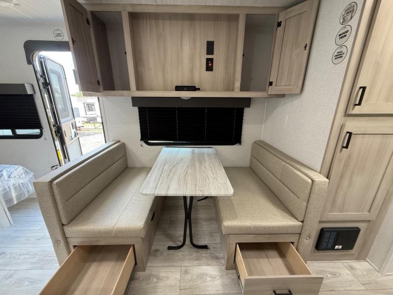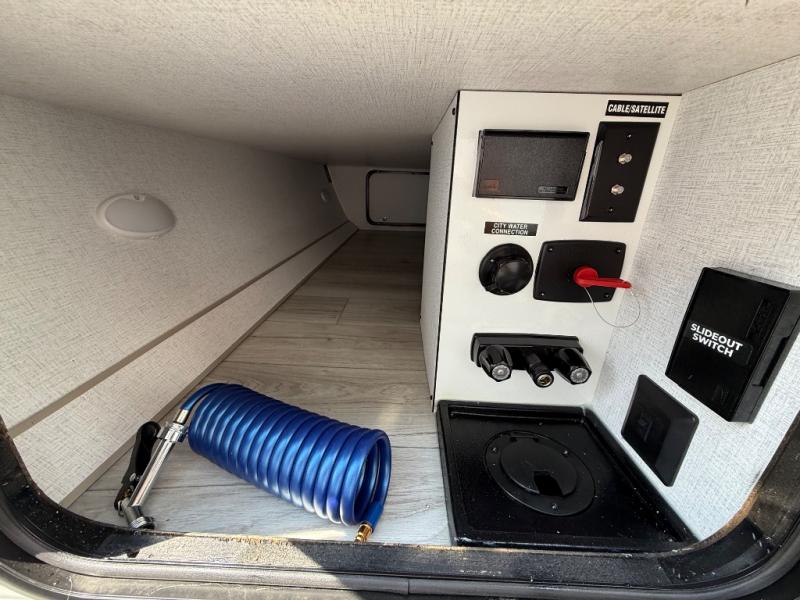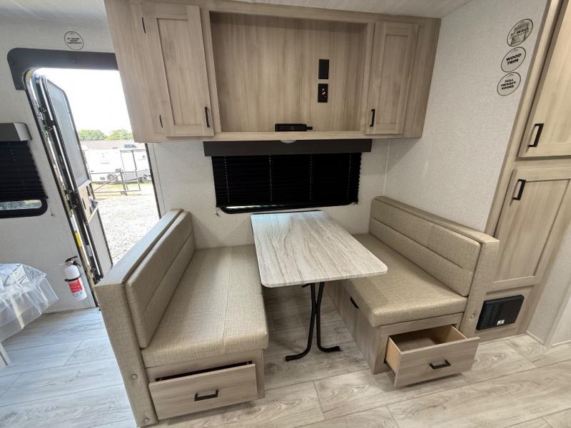 Head to the lake in this travel trailer with a large slide out for more space and comfort! Once you arrive, you can put out the 18' power awning, unload the pass-through storage, and make lunch on the outdoor kitchen with a pull-out griddle and refrigerator. The booth dinette inside can be used as dining space, and there is storage underneath here for added convenience. A jiffy sofa within the slide can be switched out for an optional theater seat if you don't need the extra sleeping space. You will also find a full interior kitchen in the rear corner, and the full bath in the other rear corner is sure to come in handy. When you're ready for some shut-eye, the king bed in the front bedroom will feel just like home. There are also dual wardrobes and nightstands to keep your things tidy!