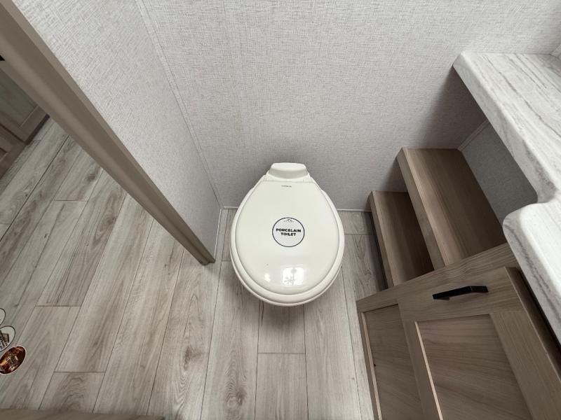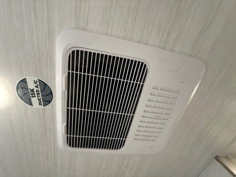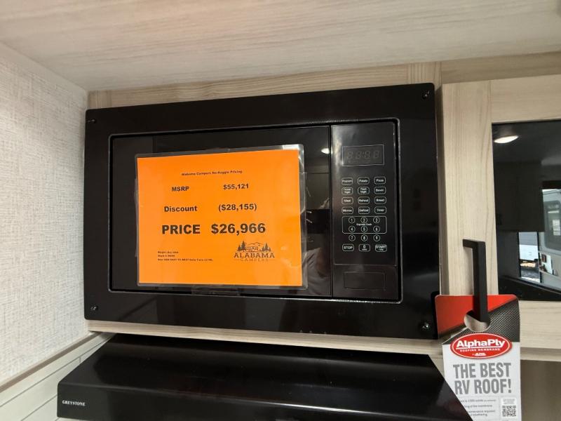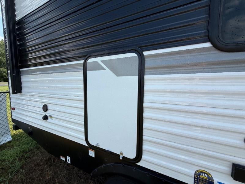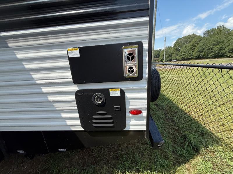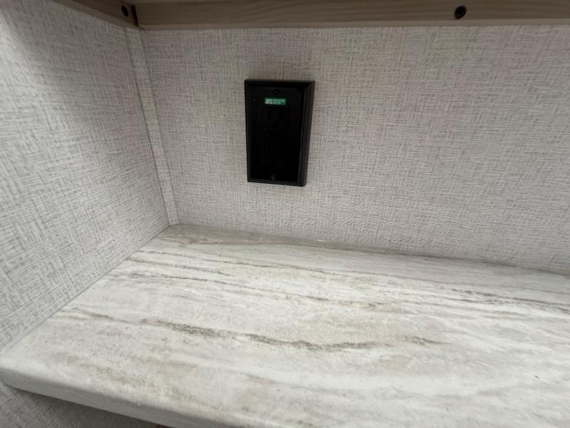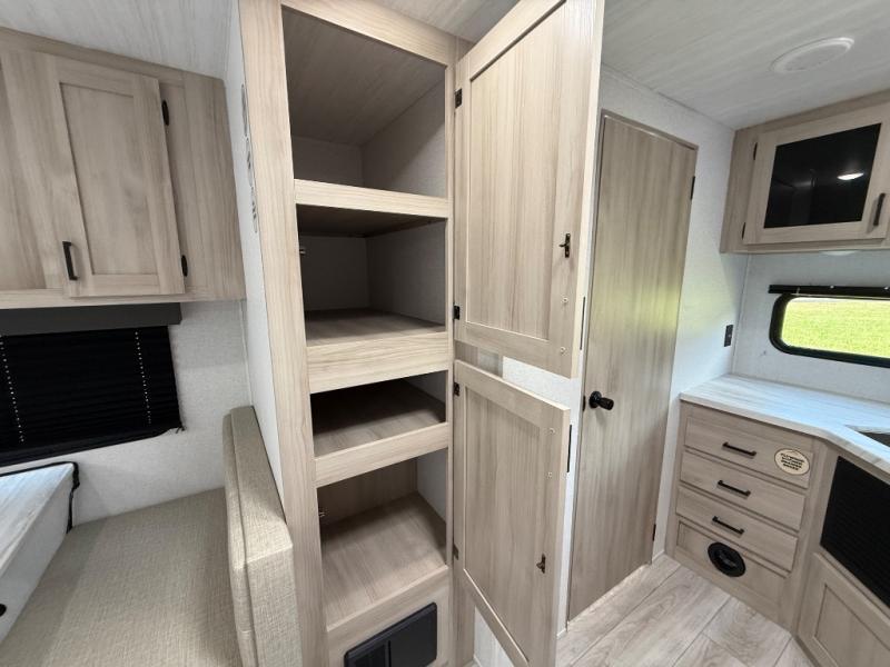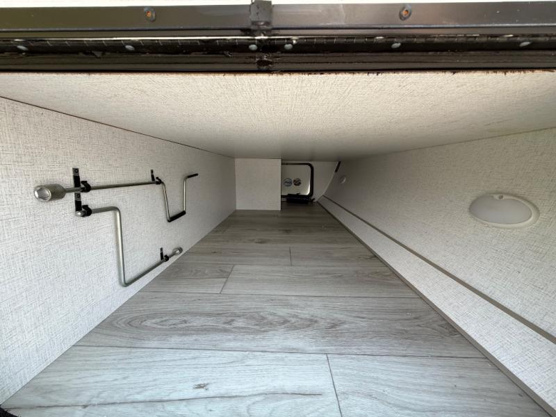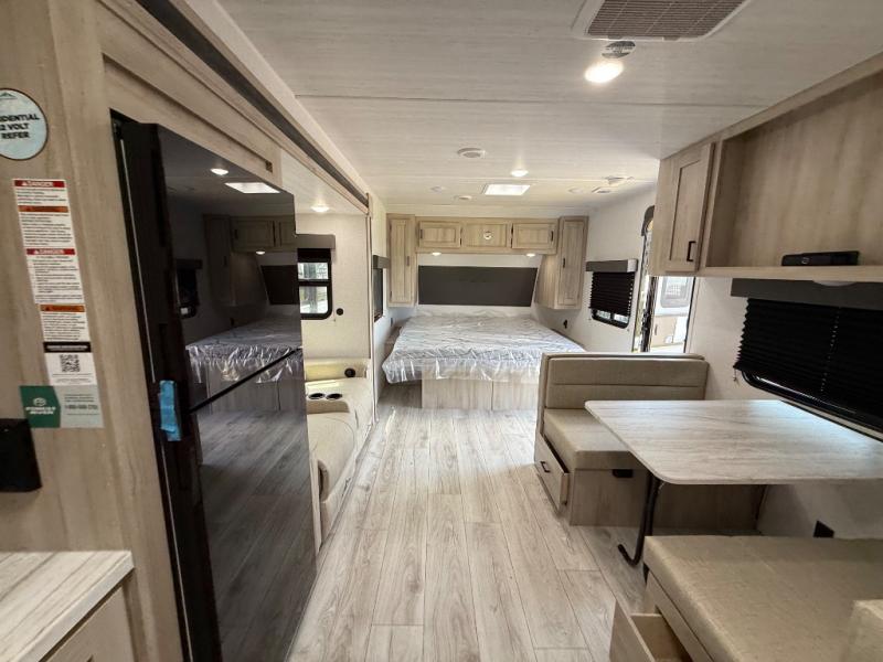 Head to the lake in this travel trailer with a large slide out for more space and comfort! Once you arrive, you can put out the 18' power awning, unload the pass-through storage, and make lunch on the outdoor kitchen with a pull-out griddle and refrigerator. The booth dinette inside can be used as dining space, and there is storage underneath here for added convenience. A jiffy sofa within the slide can be switched out for an optional theater seat if you don't need the extra sleeping space. You will also find a full interior kitchen in the rear corner, and the full bath in the other rear corner is sure to come in handy. When you're ready for some shut-eye, the king bed in the front bedroom will feel just like home. There are also dual wardrobes and nightstands to keep your things tidy!