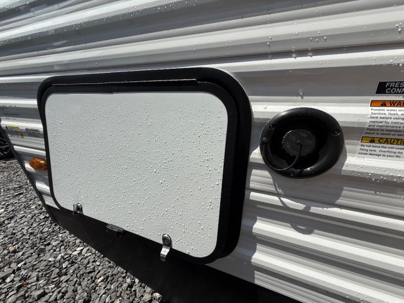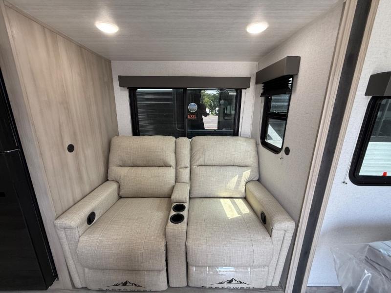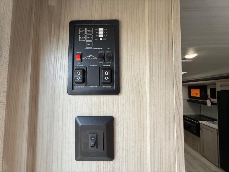 Each Della Terra travel trailer by EAST TO WEST is constructed with an enclosed and heated underbelly and enclosed holding tanks so you can camp all year long. There is also a power tongue jack with an LED light for easy set up and a power awning with LED lights you can rest under after you've unpacked. The Explore Comfort Package comes seamless pressed countertops, kitchen backsplash, window valance package with black night shades, and many more comforts. You will also appreciate the Adventure Outdoor Package with backup camera prep and solar prep, a tankless water heater, an RV grill quick disconnect, and a universal docking station with battery disconnect.