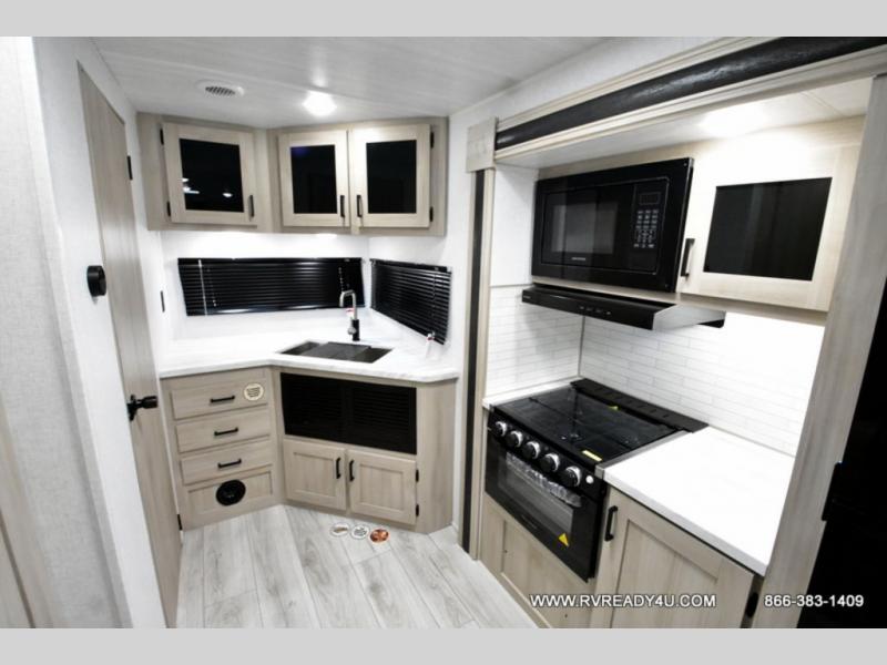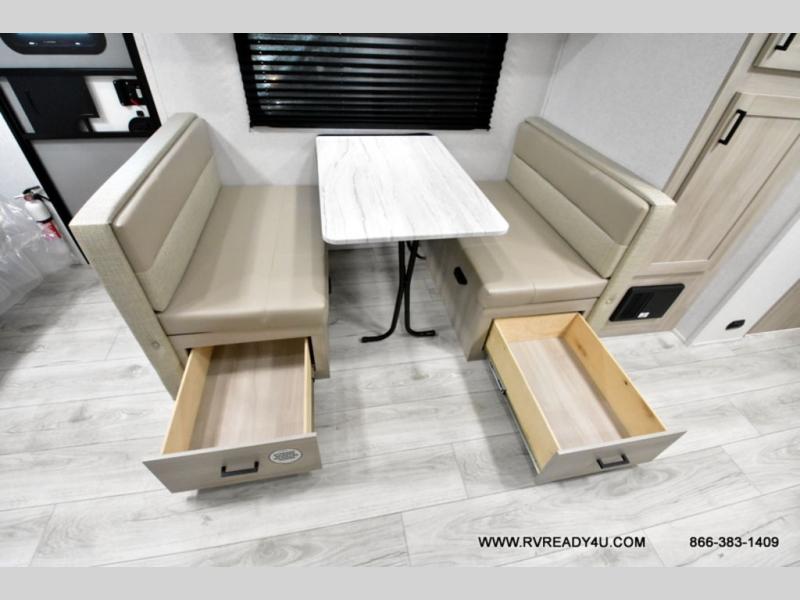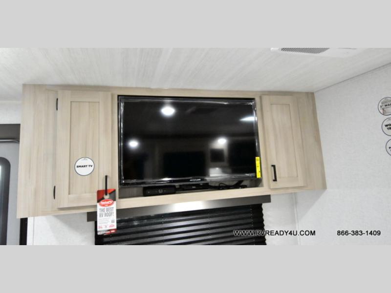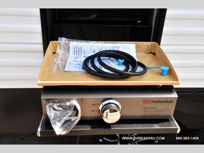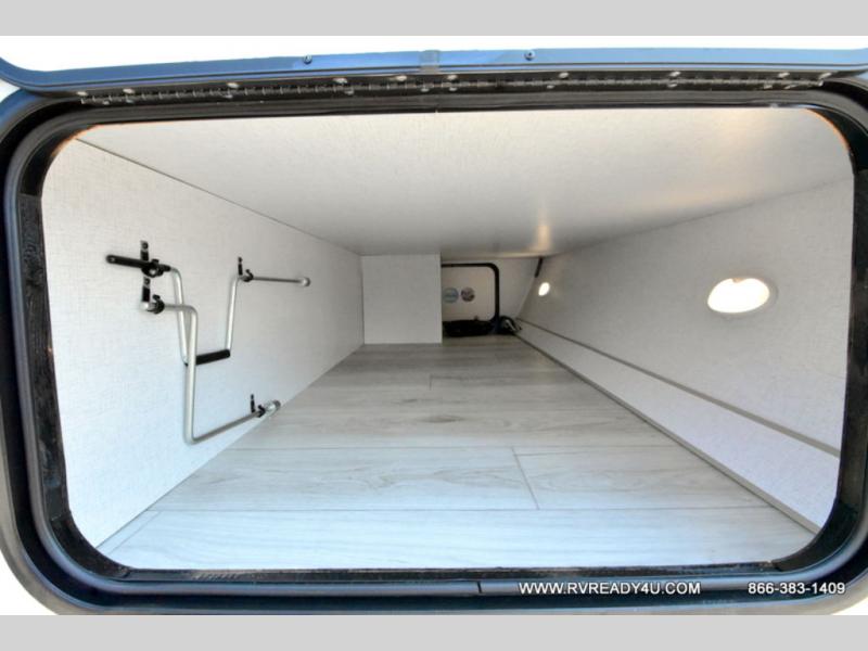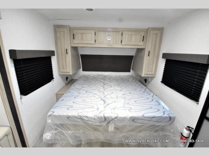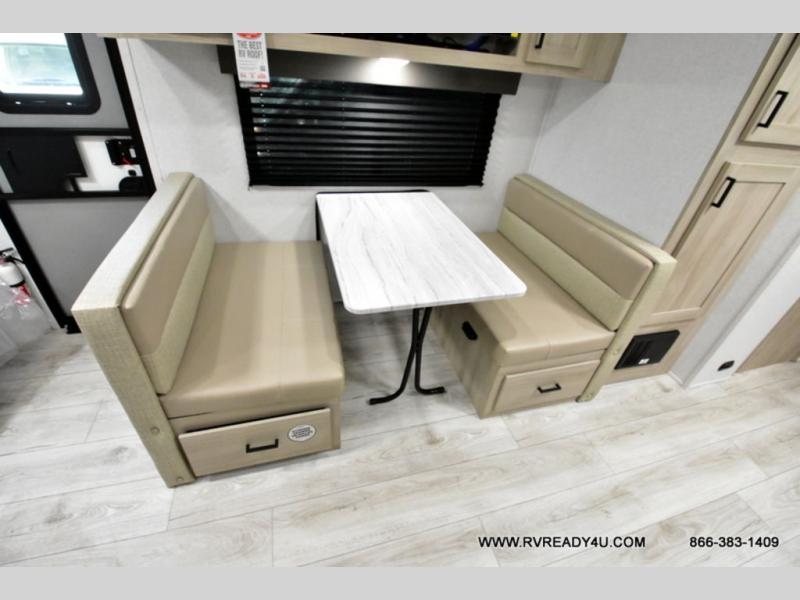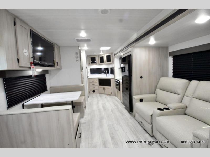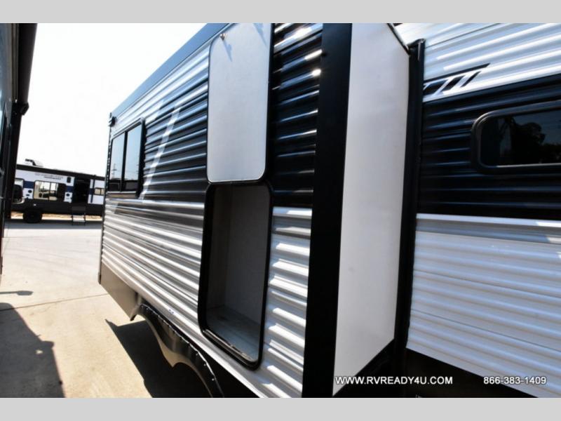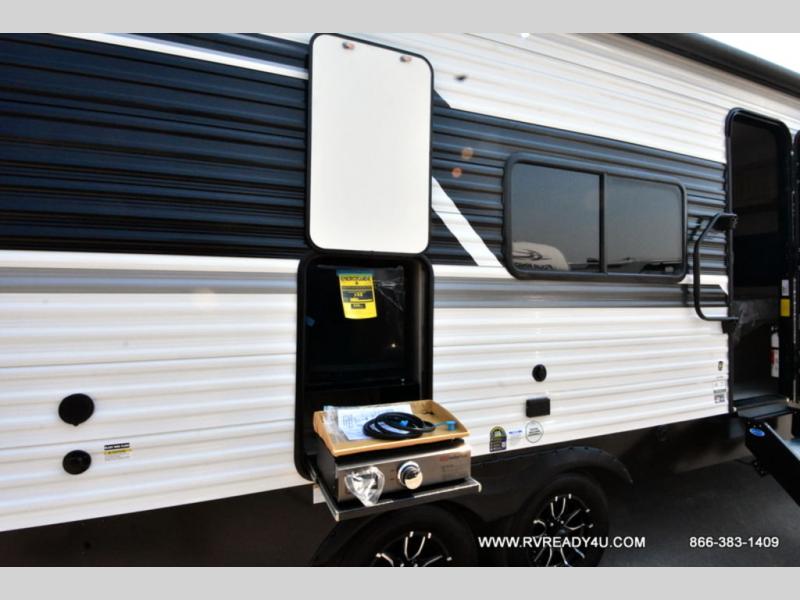 Head to the lake in this travel trailer with a large slide out for more space and comfort! Once you arrive, you can put out the 18' power awning, unload the pass-through storage, and make lunch on the outdoor kitchen with a pull-out griddle and refrigerator. The booth dinette inside can be used as dining space, and there is storage underneath here for added convenience. A jiffy sofa within the slide can be switched out for an optional theater seat if you don't need the extra sleeping space. You will also find a full interior kitchen in the rear corner, and the full bath in the other rear corner is sure to come in handy. When you're ready for some shut-eye, the king bed in the front bedroom will feel just like home. There are also dual wardrobes and nightstands to keep your things tidy!