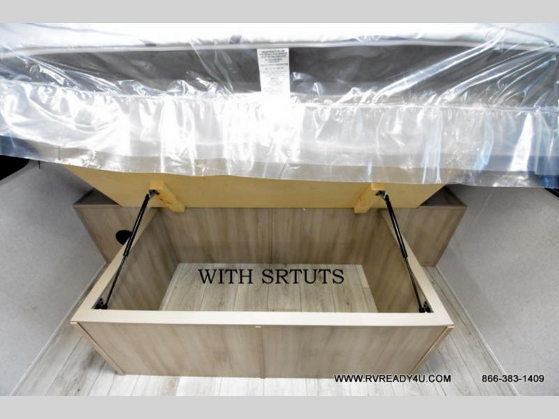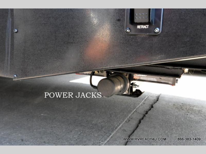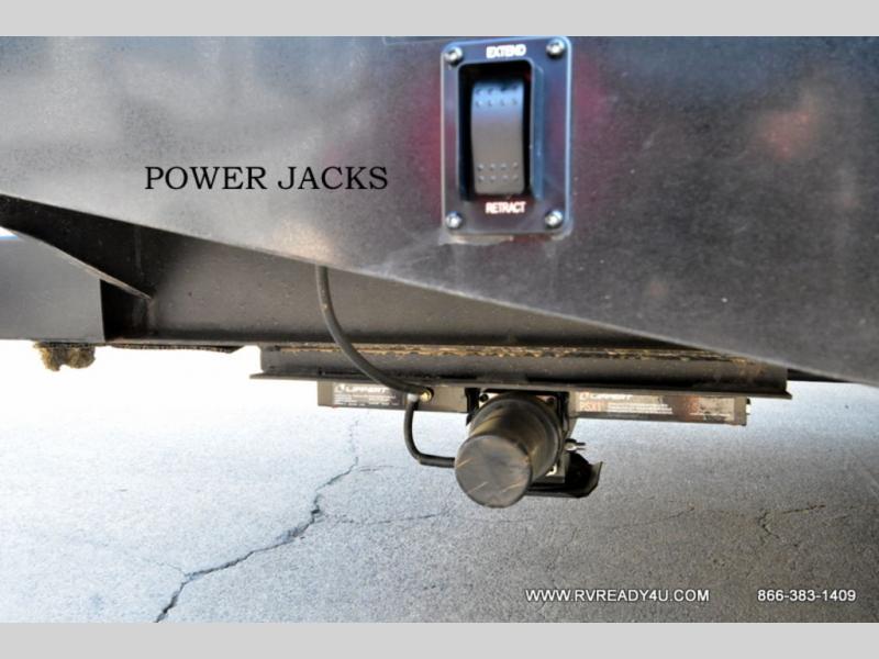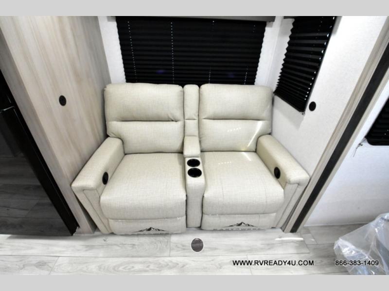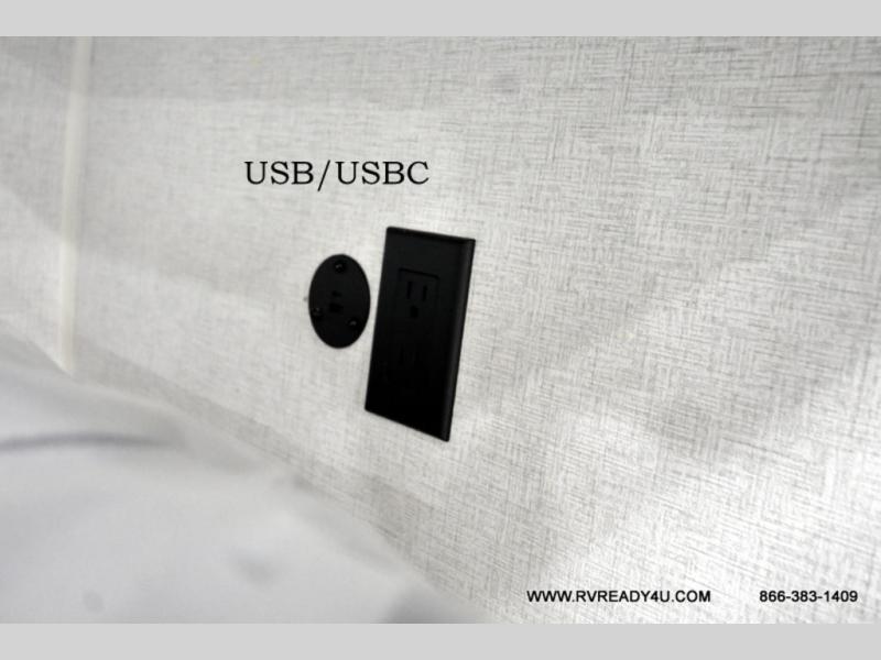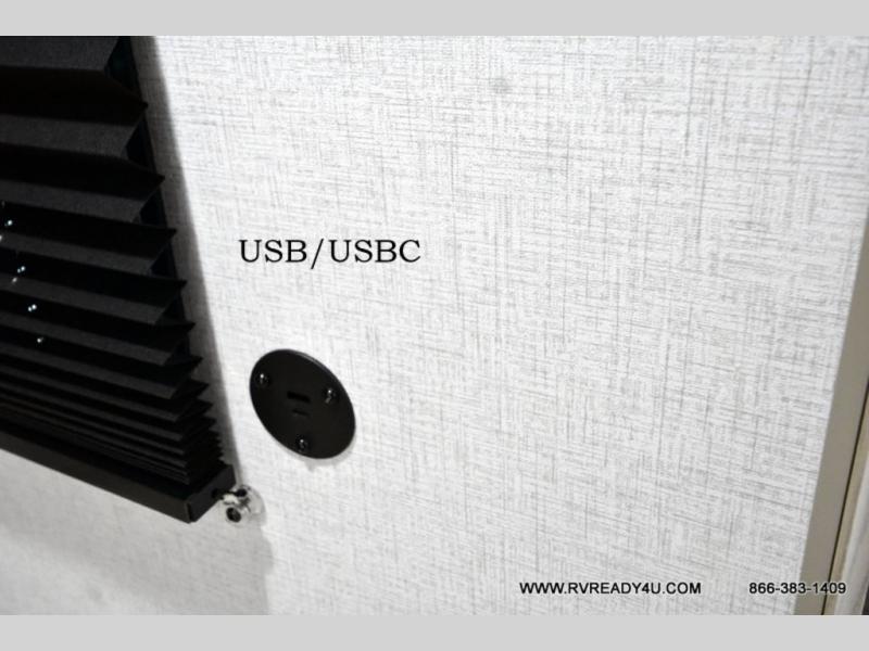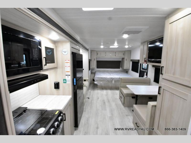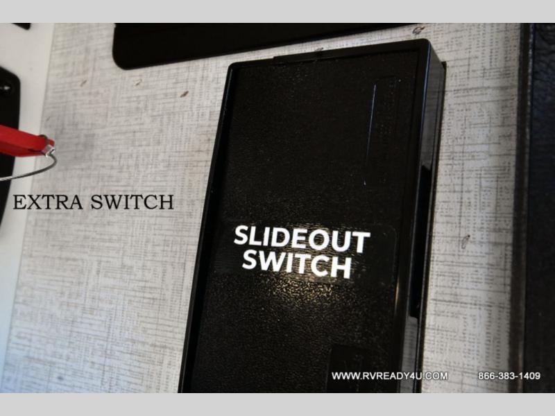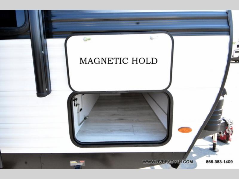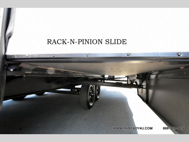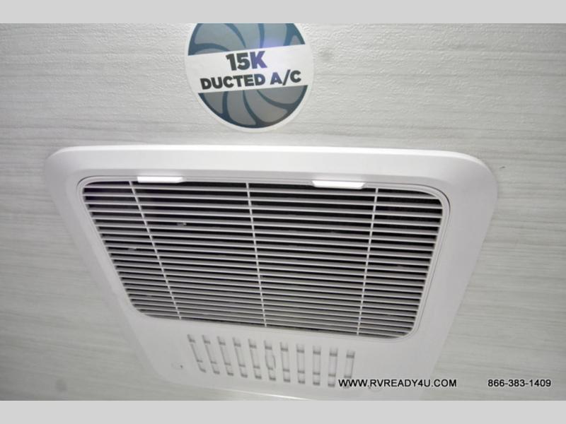 Head to the lake in this travel trailer with a large slide out for more space and comfort! Once you arrive, you can put out the 18' power awning, unload the pass-through storage, and make lunch on the outdoor kitchen with a pull-out griddle and refrigerator. The booth dinette inside can be used as dining space, and there is storage underneath here for added convenience. A jiffy sofa within the slide can be switched out for an optional theater seat if you don't need the extra sleeping space. You will also find a full interior kitchen in the rear corner, and the full bath in the other rear corner is sure to come in handy. When you're ready for some shut-eye, the king bed in the front bedroom will feel just like home. There are also dual wardrobes and nightstands to keep your things tidy!