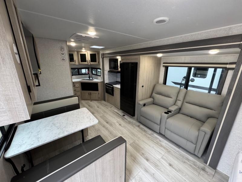 Step inside and enjoy the spacious feel created by the large slide-out. The booth dinette serves as a dining area with under-seat storage, while the sofa (or upgraded theater seats) offers a cozy lounging space. The rear kitchen is fully equipped with seamless countertops, a generous pantry, and modern finishes from the Explore Comfort Package.