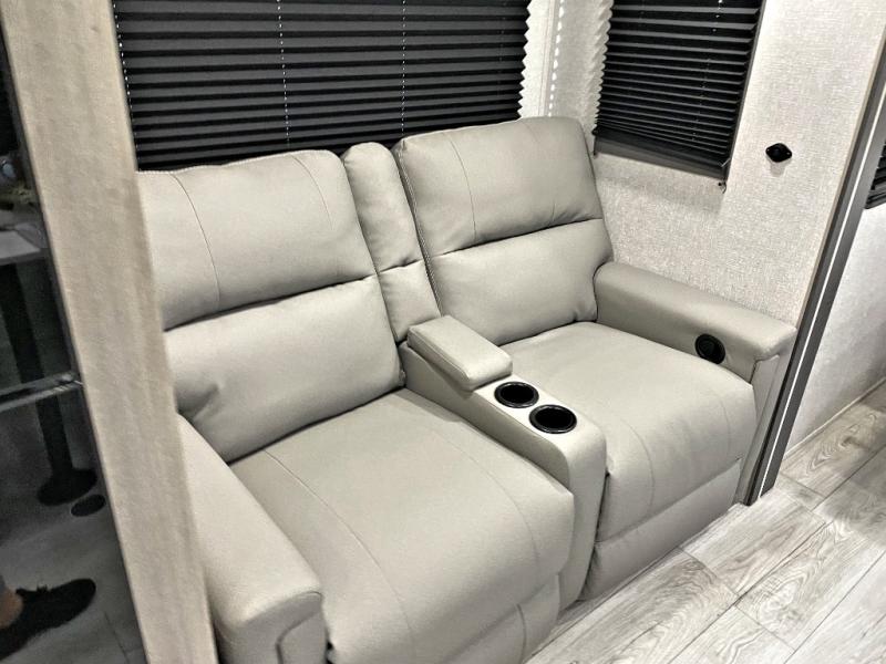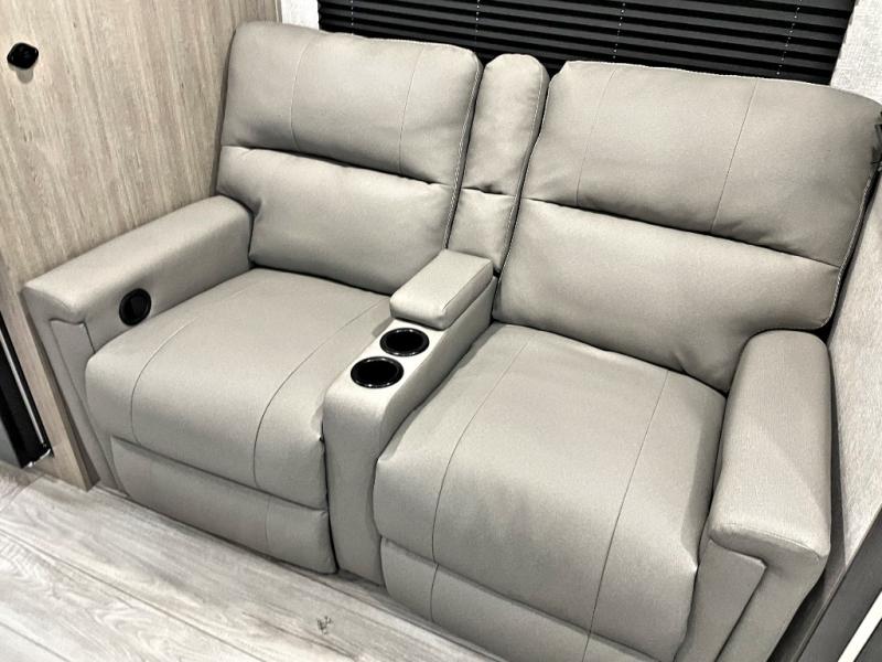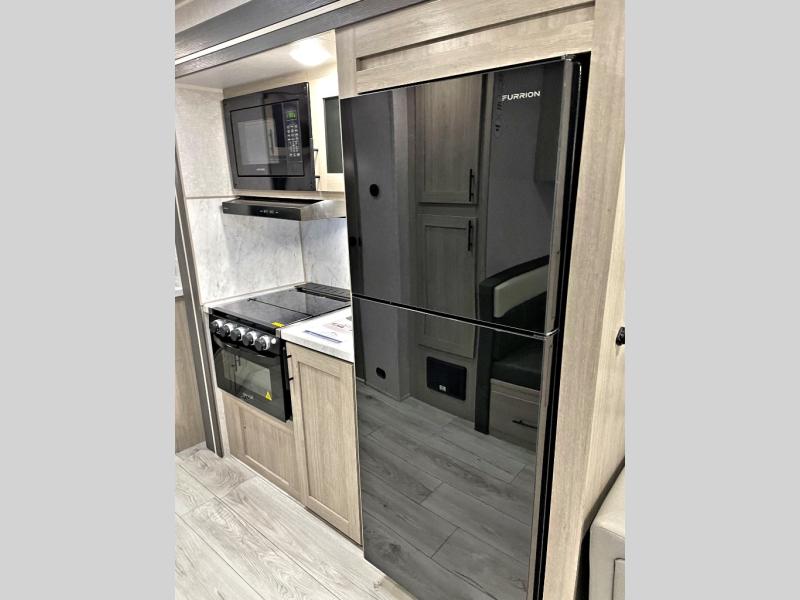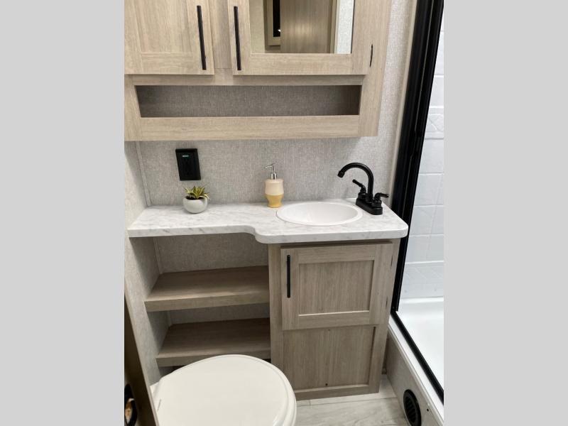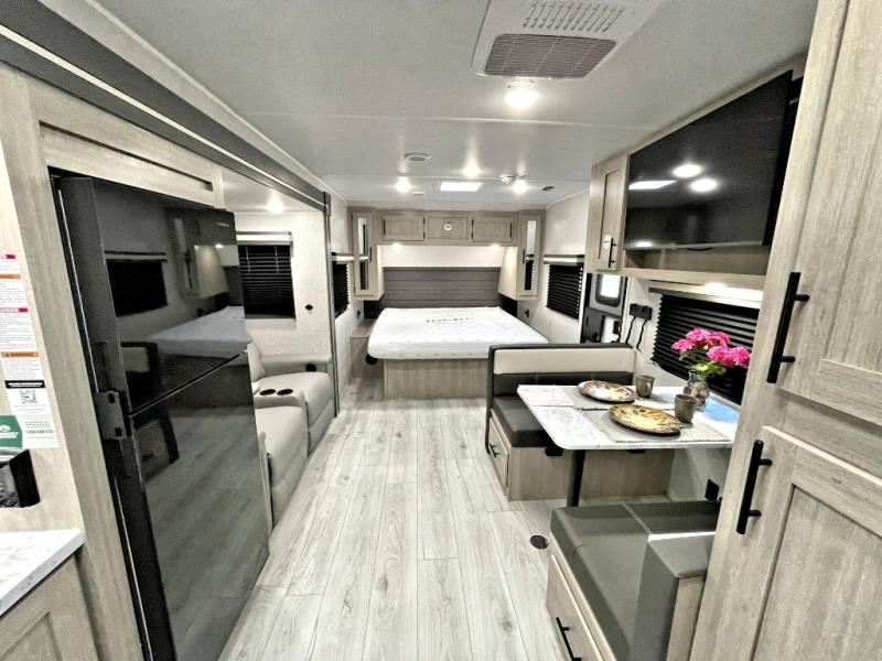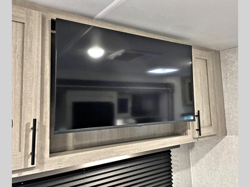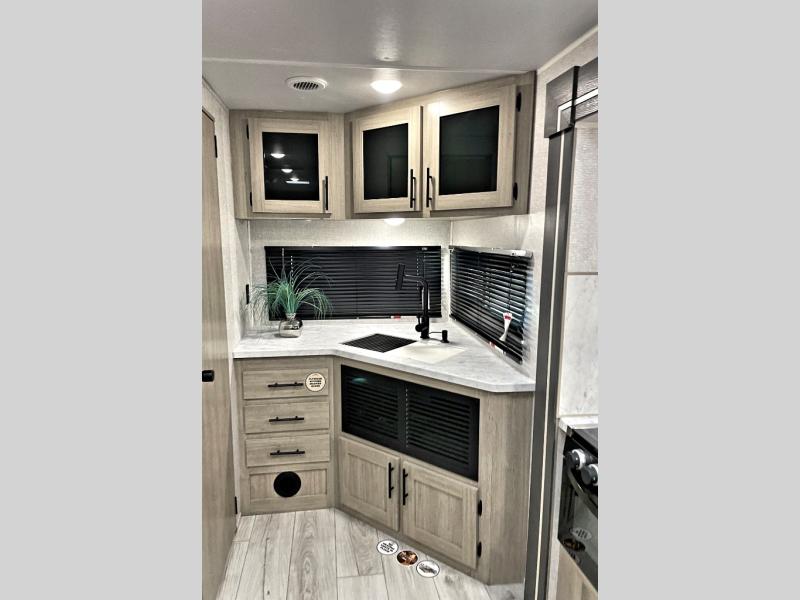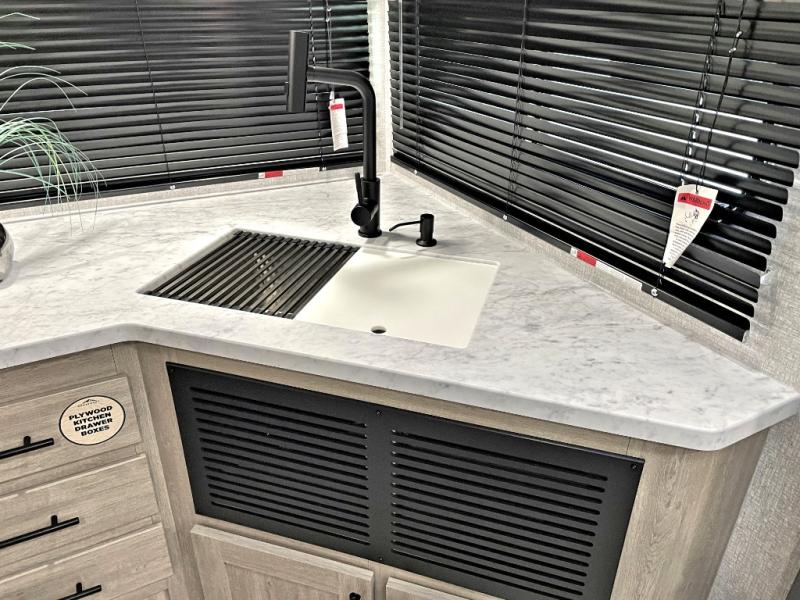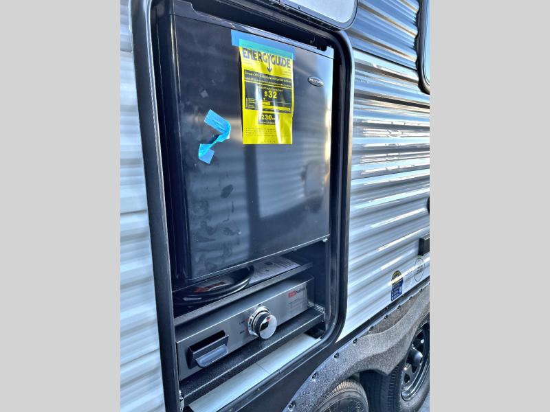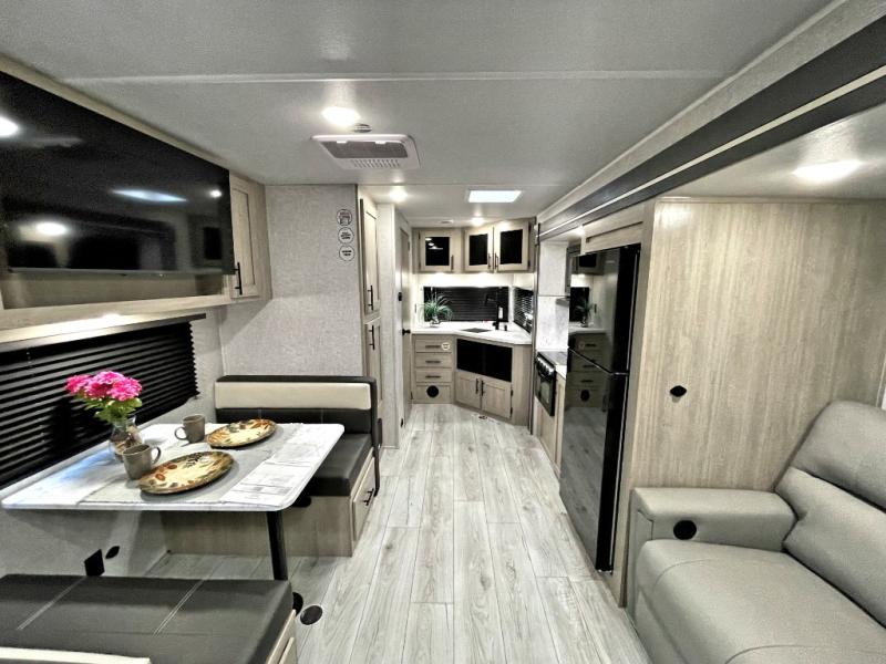 Head to the lake in this travel trailer with a large slide out for more space and comfort! Once you arrive, you can put out the 18' power awning, unload the pass-through storage, and make lunch on the outdoor kitchen with a pull-out griddle and refrigerator. The booth dinette inside can be used as dining space, and there is storage underneath here for added convenience. A jiffy sofa within the slide can be switched out for an optional theater seat if you don't need the extra sleeping space. You will also find a full interior kitchen in the rear corner, and the full bath in the other rear corner is sure to come in handy. When you're ready for some shut-eye, the king bed in the front bedroom will feel just like home. There are also dual wardrobes and nightstands to keep your things tidy!