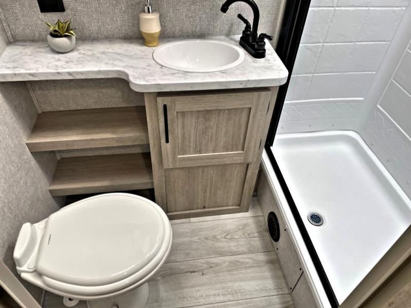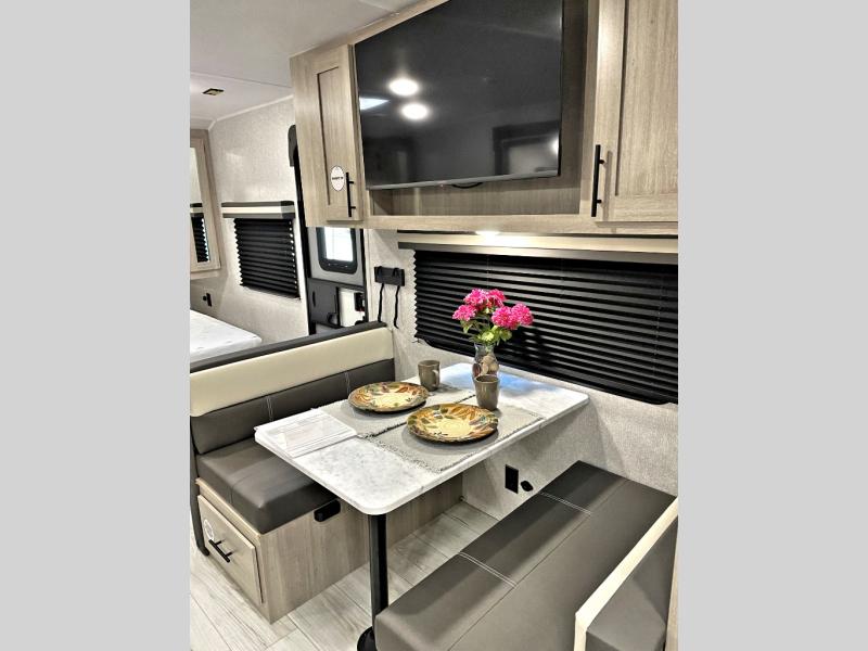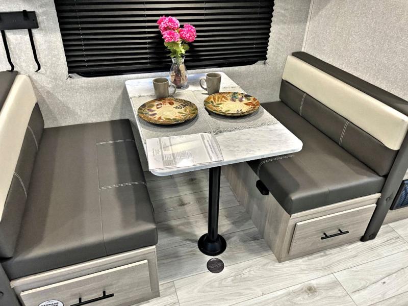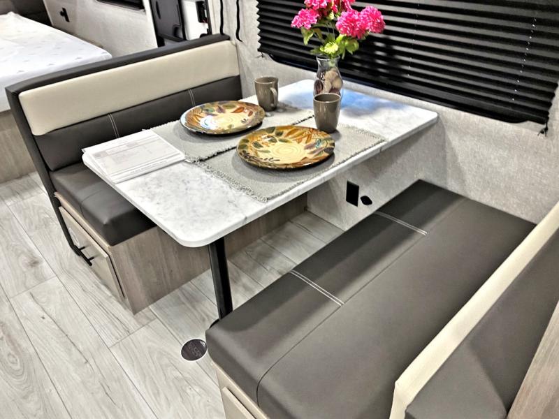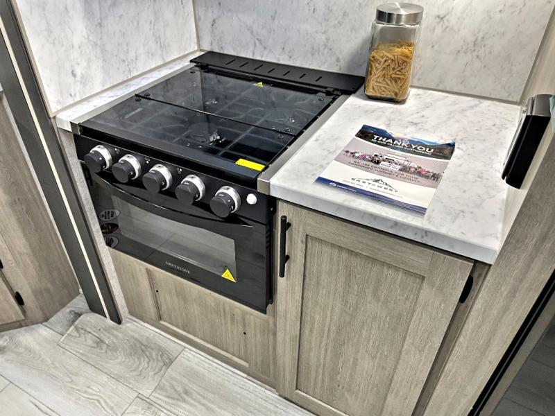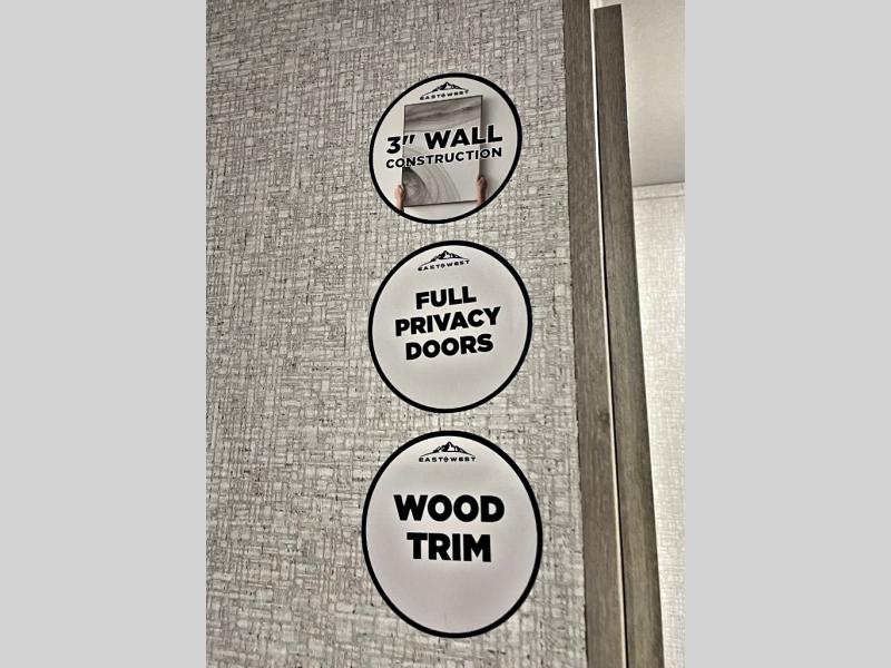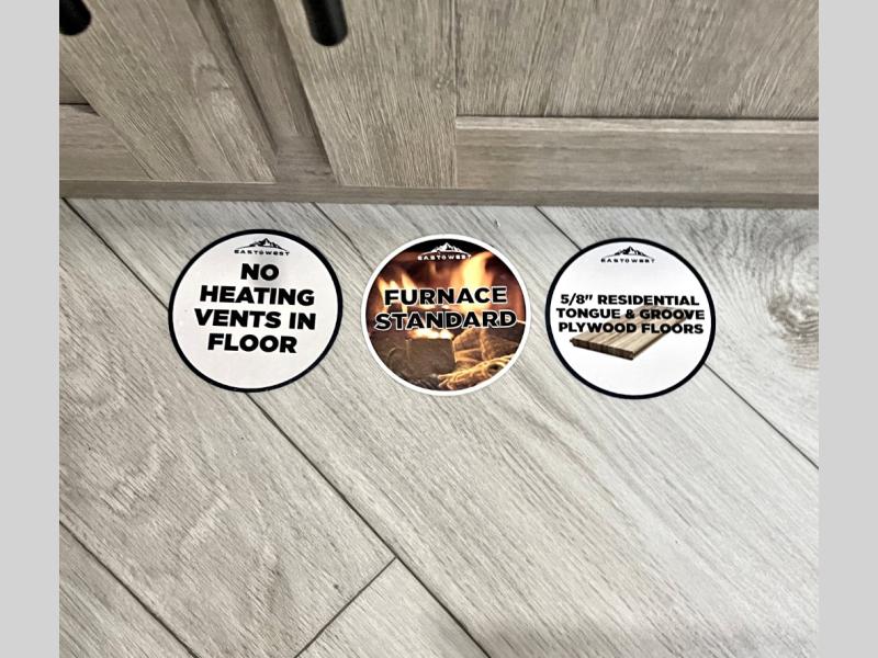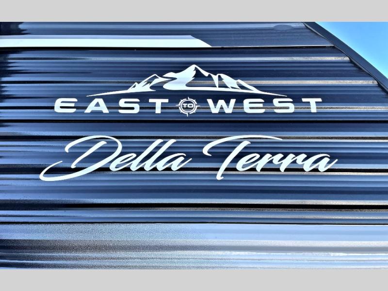 Each Della Terra travel trailer by EAST TO WEST is constructed with an enclosed and heated underbelly and enclosed holding tanks for added protection against the elements. There is also a power tongue jack with an LED light for easy set up and a power awning with LED lights you can rest under after you've unpacked. The Explore Comfort Package comes seamless pressed countertops, kitchen backsplash, window valance package with black night shades, and many more comforts. You will also appreciate the Adventure Outdoor Package with backup camera prep and solar prep, a tankless water heater, an RV grill quick disconnect, and a universal docking station with battery disconnect.