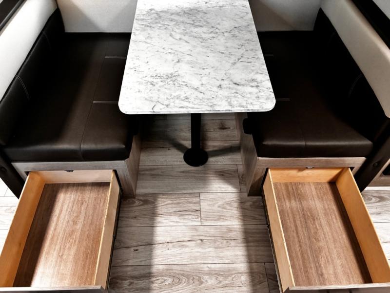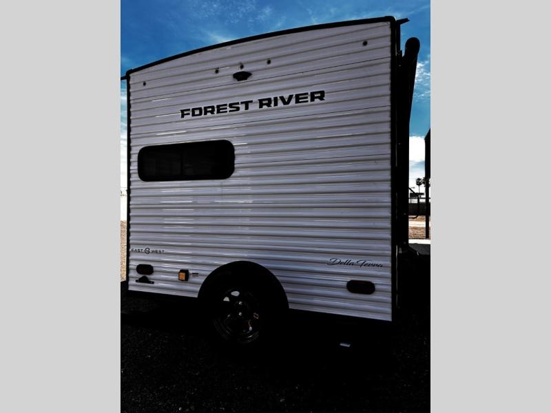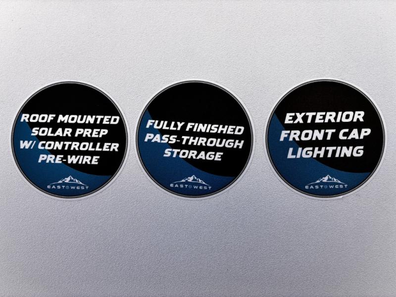 Each Della Terra travel trailer by EAST TO WEST is constructed with an enclosed and heated underbelly and enclosed holding tanks for added protection against the elements. There is also a power tongue jack with an LED light for easy set up and a power awning with LED lights you can rest under after you've unpacked. The Explore Comfort Package comes seamless pressed countertops, kitchen backsplash, window valance package with black night shades, and many more comforts. You will also appreciate the Adventure Outdoor Package with backup camera prep and solar prep, a tankless water heater, an RV grill quick disconnect, and a universal docking station with battery disconnect.