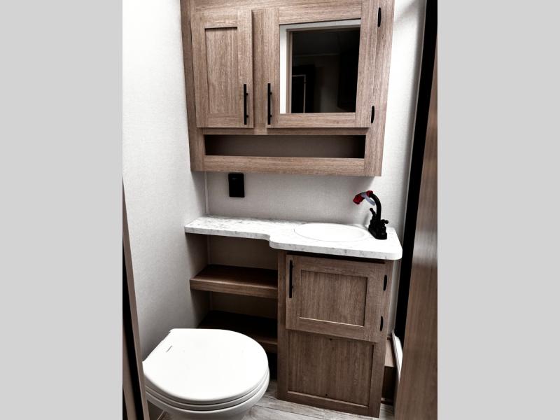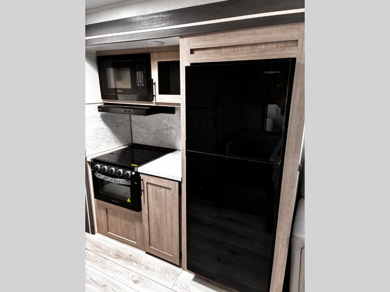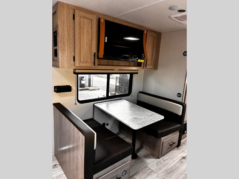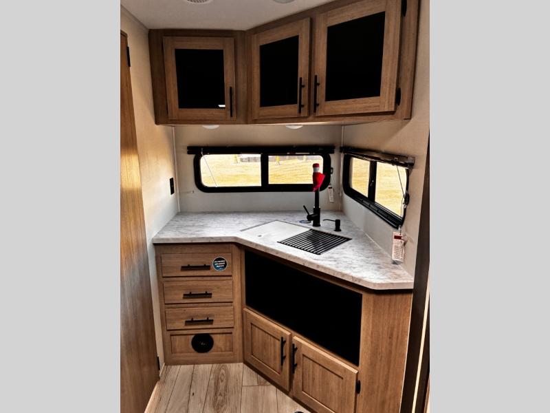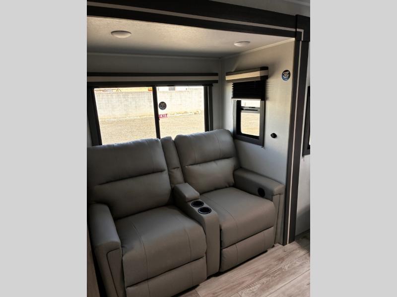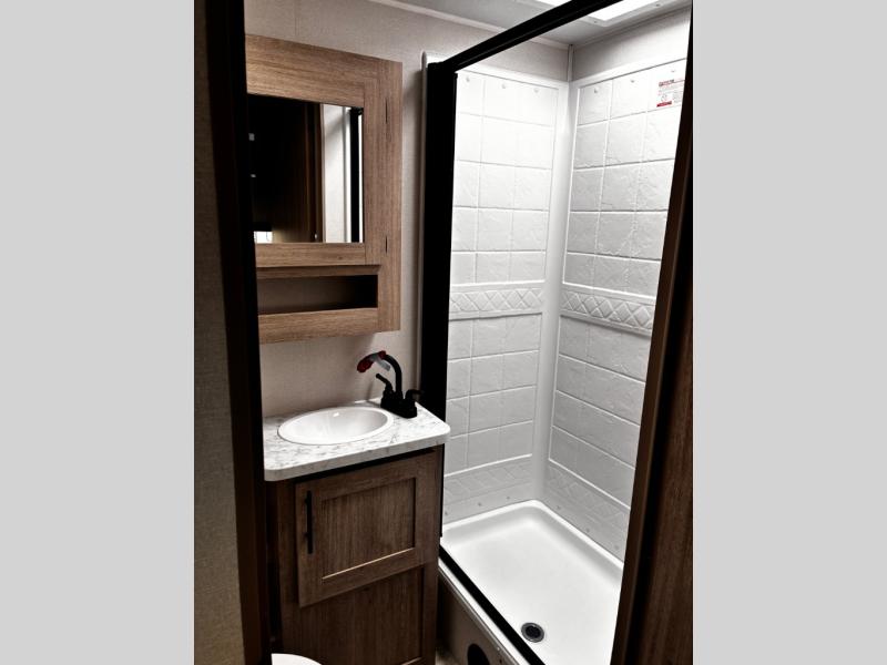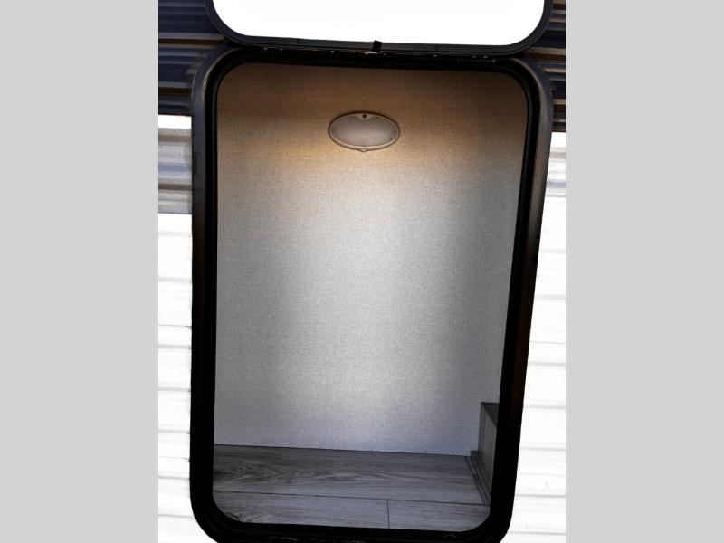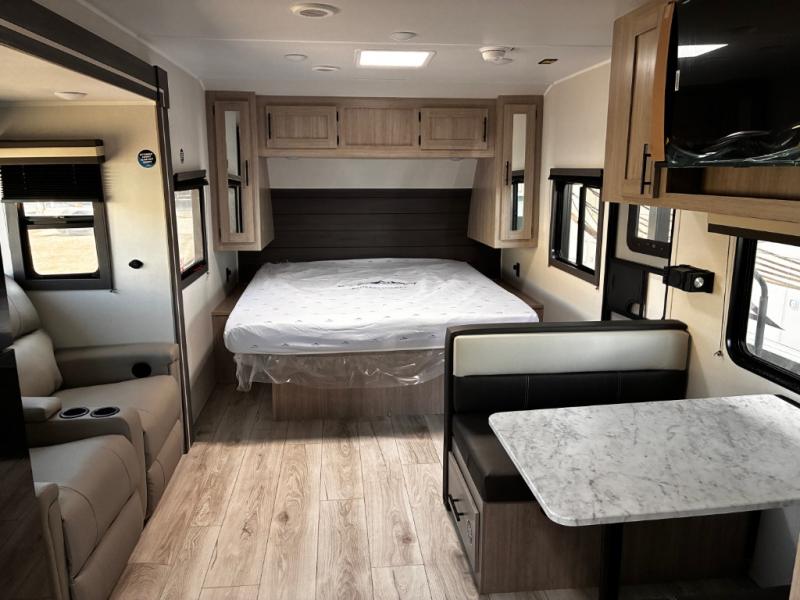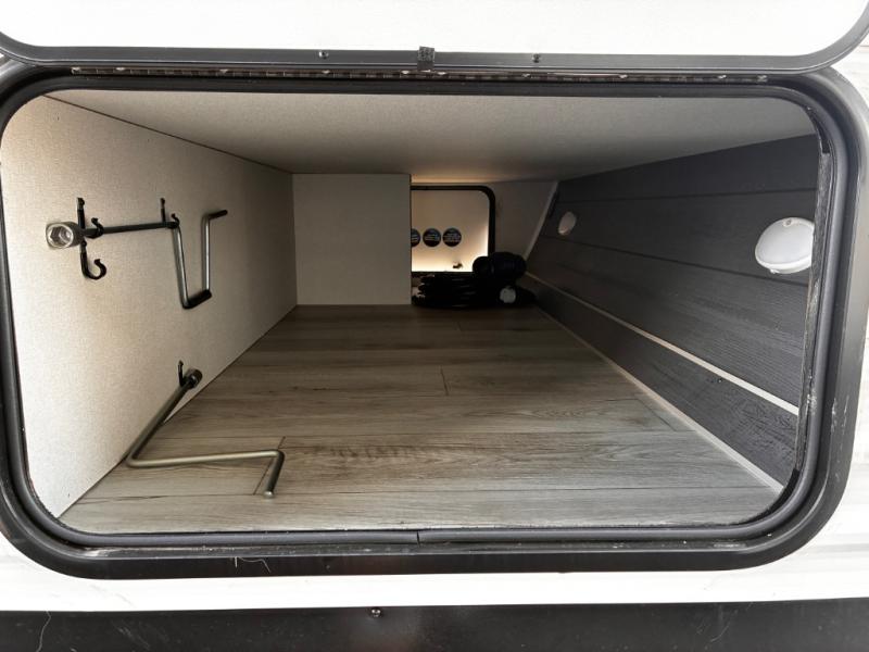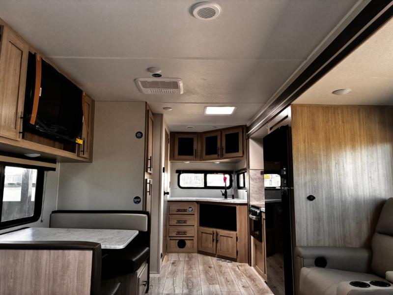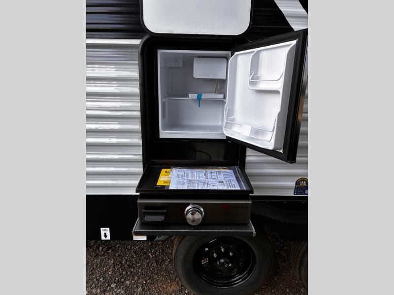 Head to the lake in this travel trailer with a large slide out for more space and comfort! Once you arrive, you can put out the 18' power awning, unload the pass-through storage, and make lunch on the outdoor kitchen with a pull-out griddle and refrigerator. The booth dinette inside can be used as dining space, and there is storage underneath here for added convenience. A jiffy sofa within the slide can be switched out for an optional theater seat if you don't need the extra sleeping space. You will also find a full interior kitchen in the rear corner, and the full bath in the other rear corner is sure to come in handy. When you're ready for some shut-eye, the king bed in the front bedroom will feel just like home. There are also dual wardrobes and nightstands to keep your things tidy!