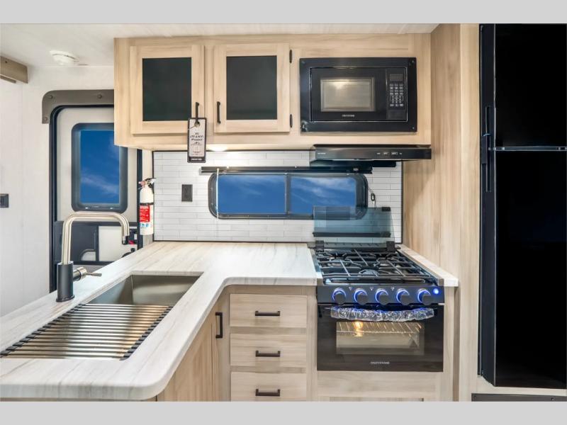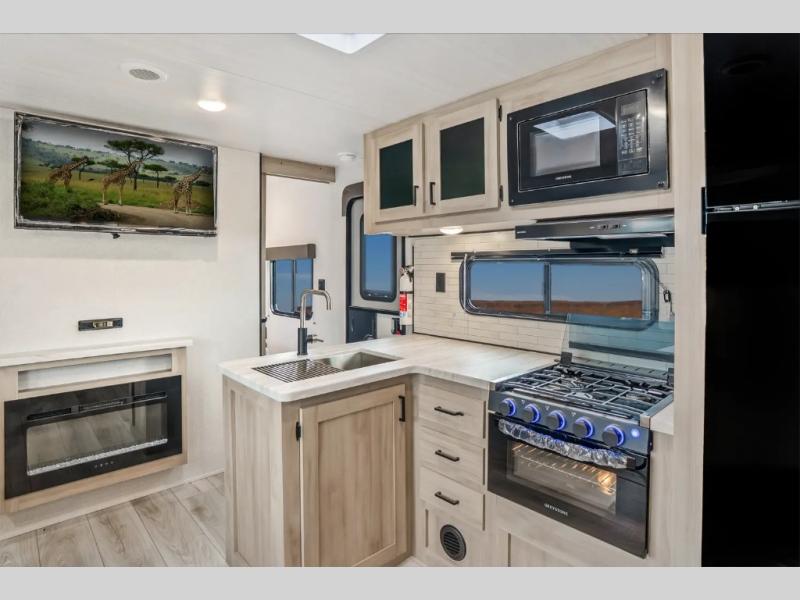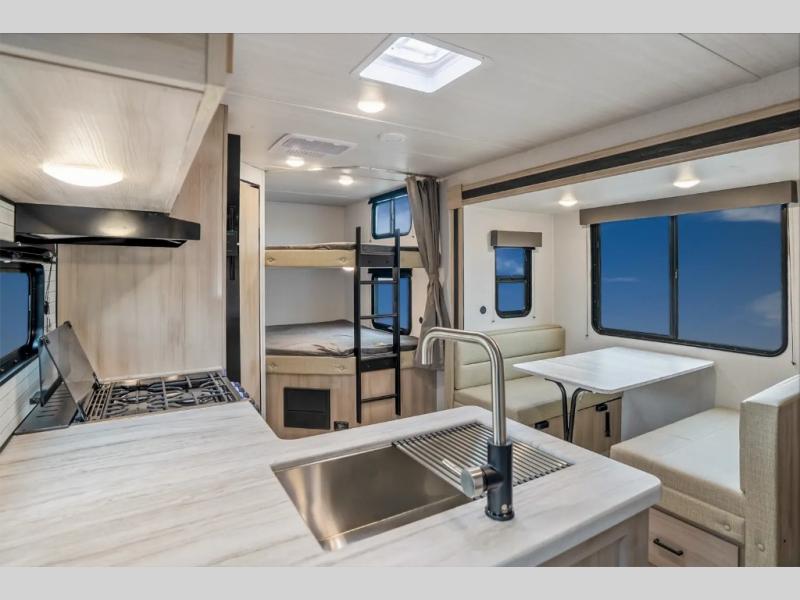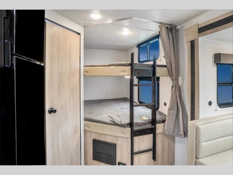 Head to the lake in this travel trailer with a large slide out for more space and comfort and additional sleeping space provided by the double-size bunks! Once you arrive, you can put out the 16' power awning, unload the pass-through storage, and make lunch on the outdoor kitchen with a pull-out griddle and refrigerator. The booth dinette inside can be used as dining space, and there is storage underneath here for added convenience. You will also find a full interior kitchen, and the full bath includes one of the dual entry doors for added convenience. When you're ready for some shut-eye, the king bed in the front private bedroom will feel just like home. There are also dual wardrobes and nightstands to keep your things tidy!