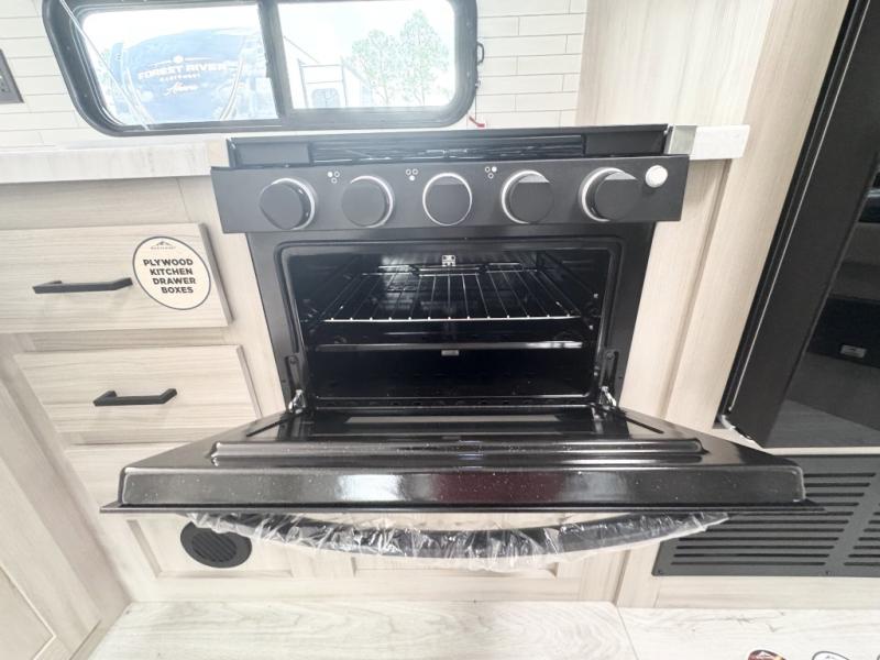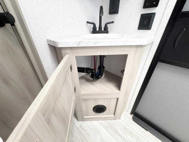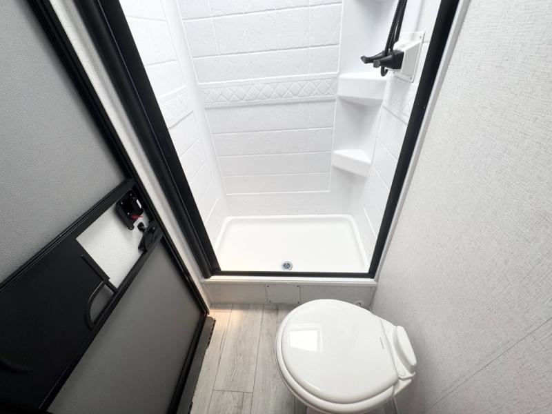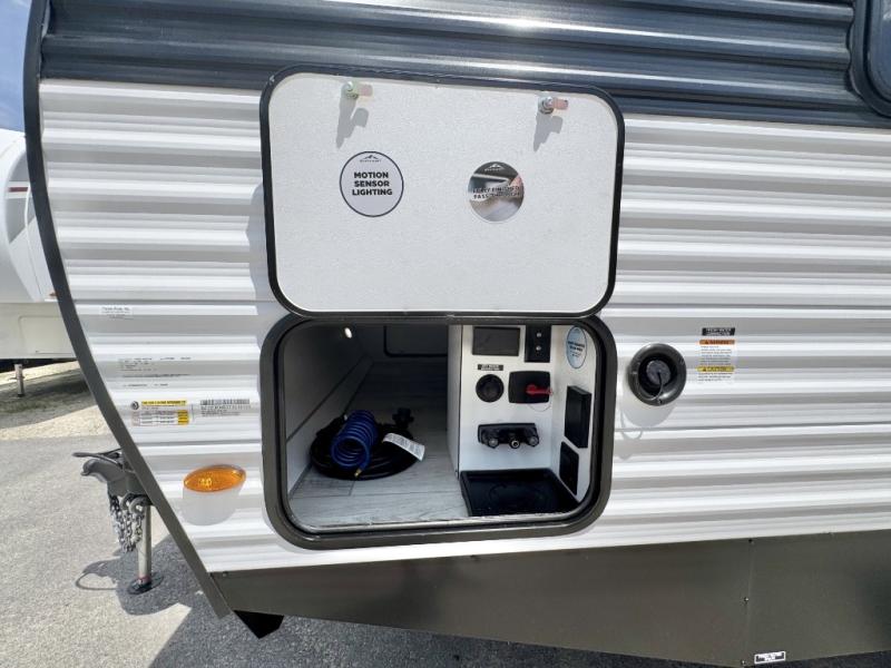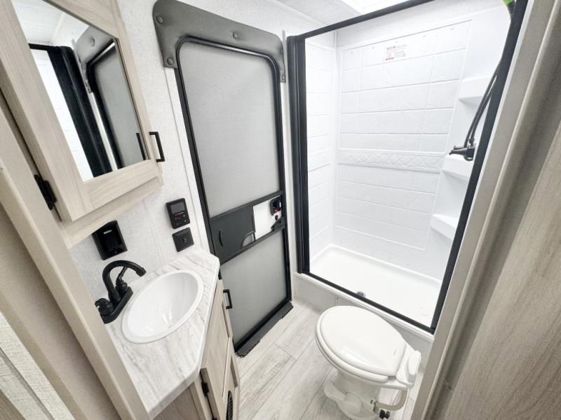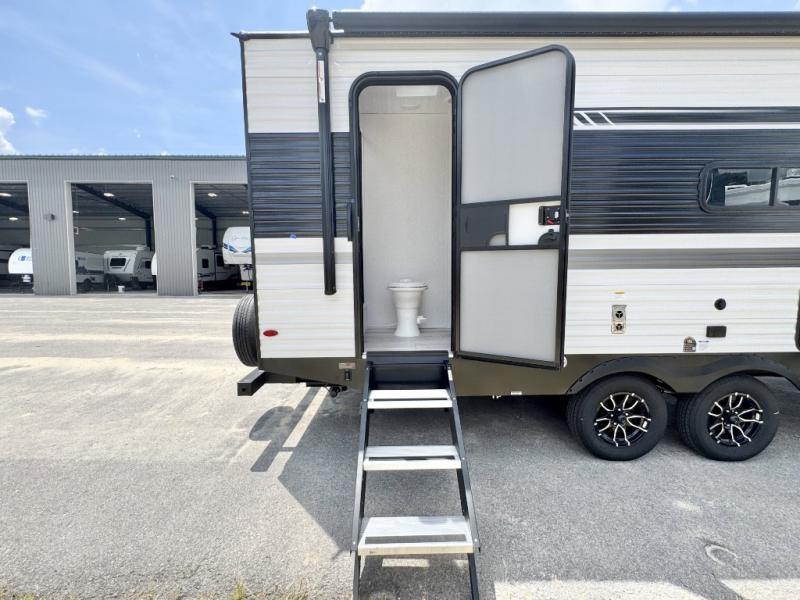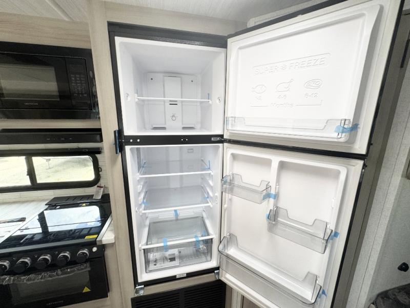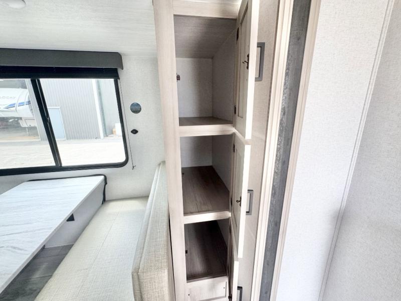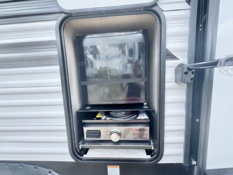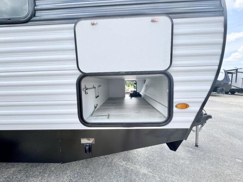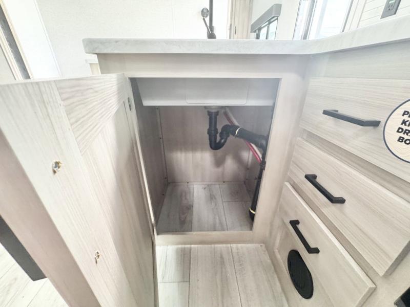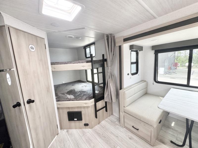 Head to the lake in this travel trailer with a large slide out for more space and comfort and additional sleeping space provided by the double-size bunks! Once you arrive, you can put out the 16' power awning, unload the pass-through storage, and make lunch on the outdoor kitchen with a pull-out griddle and refrigerator. The booth dinette inside can be used as dining space, and there is storage underneath here for added convenience. You will also find a full interior kitchen, and the full bath includes one of the dual entry doors for added convenience. When you're ready for some shut-eye, the king bed in the front private bedroom will feel just like home. There are also dual wardrobes and nightstands to keep your things tidy!