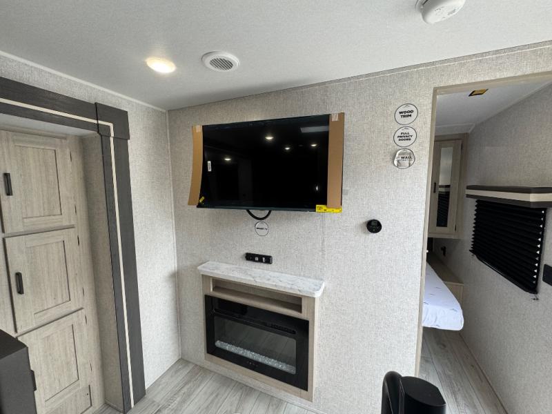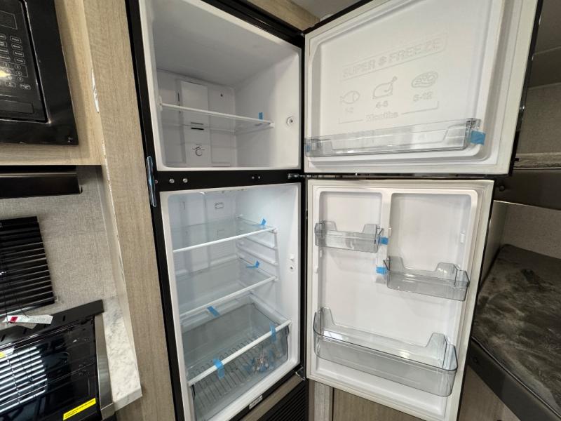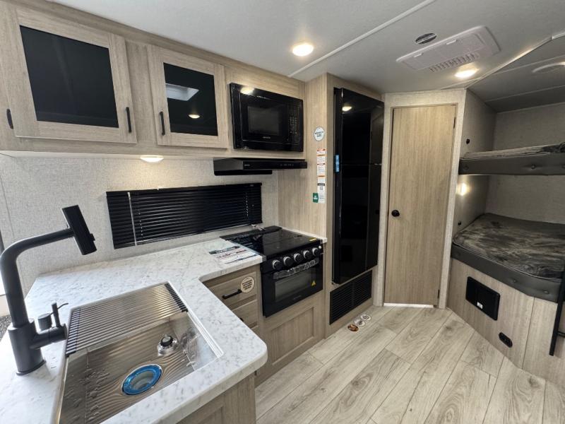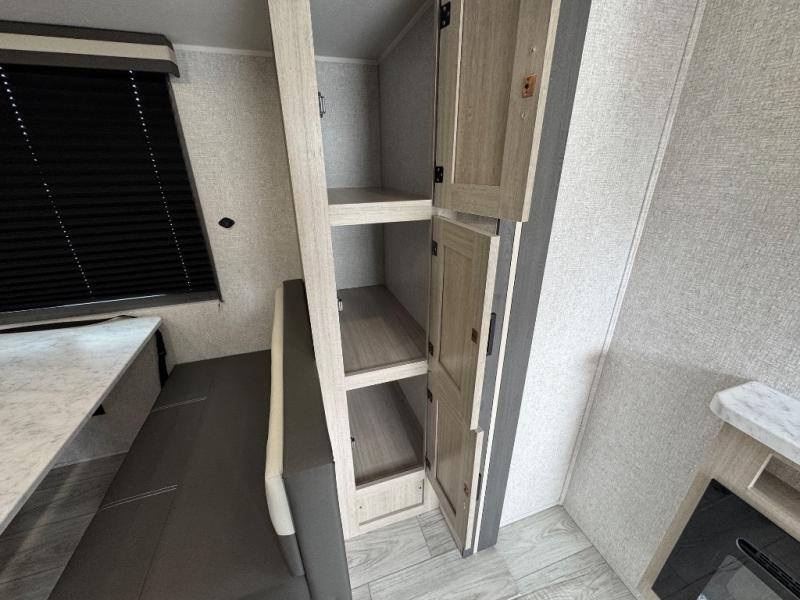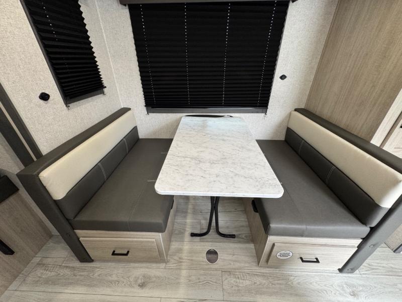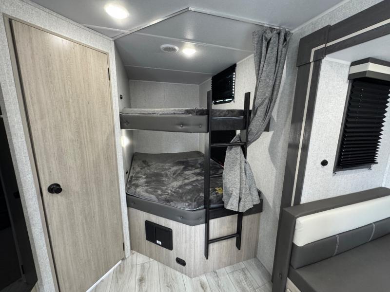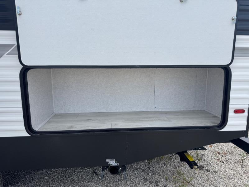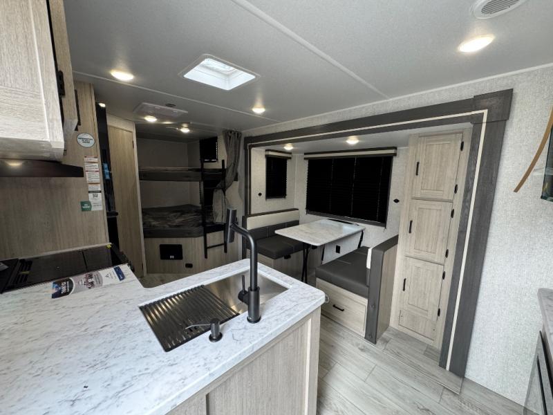Head to the lake in this travel trailer with a large slide out for more space and comfort and additional sleeping space provided by the double-size bunks! Once you arrive, you can put out the 16' power awning, unload the pass-through storage, and make lunch on the outdoor kitchen with a pull-out griddle and refrigerator. The booth dinette inside can be used as dining space, and there is storage underneath here for added convenience. You will also find a full interior kitchen, and the full bath includes one of the dual entry doors for added convenience. When you're ready for some shut-eye, the king bed in the front private bedroom will feel just like home. There are also dual wardrobes and nightstands to keep your things tidy!