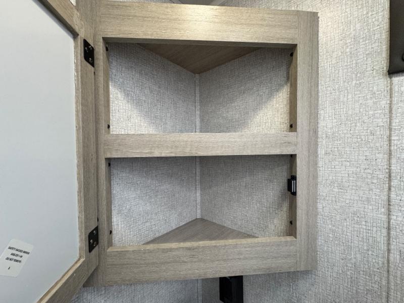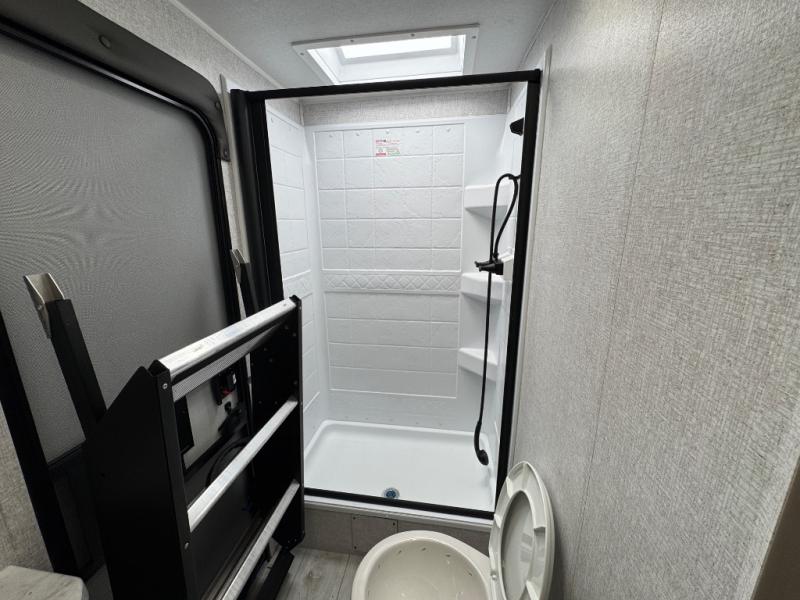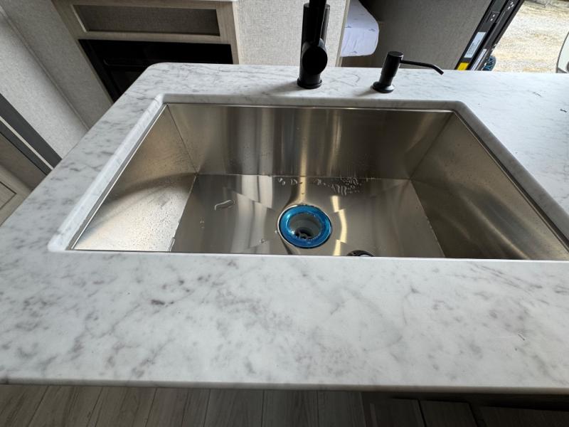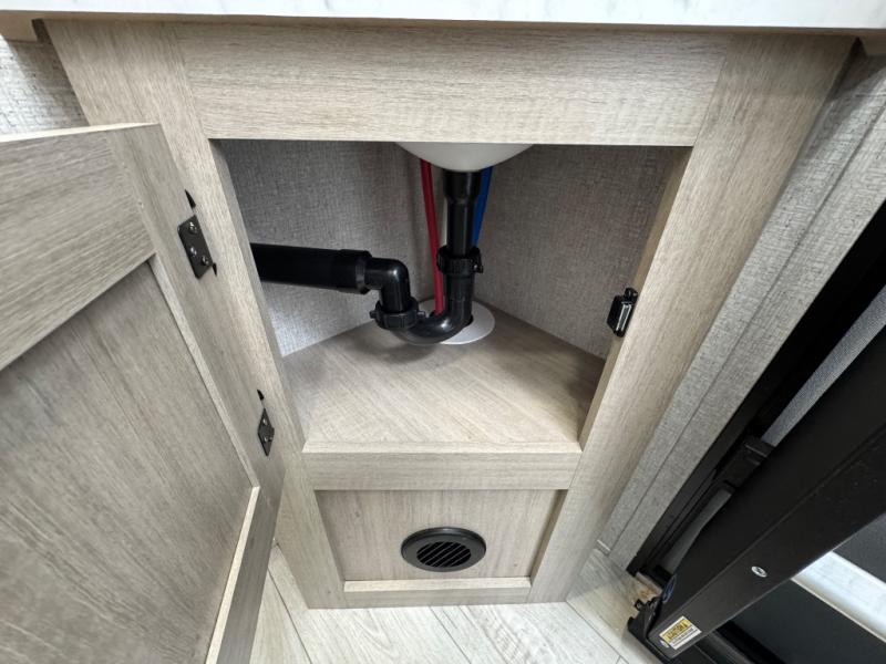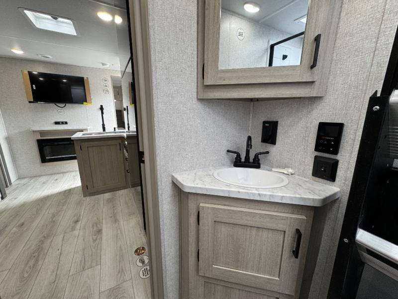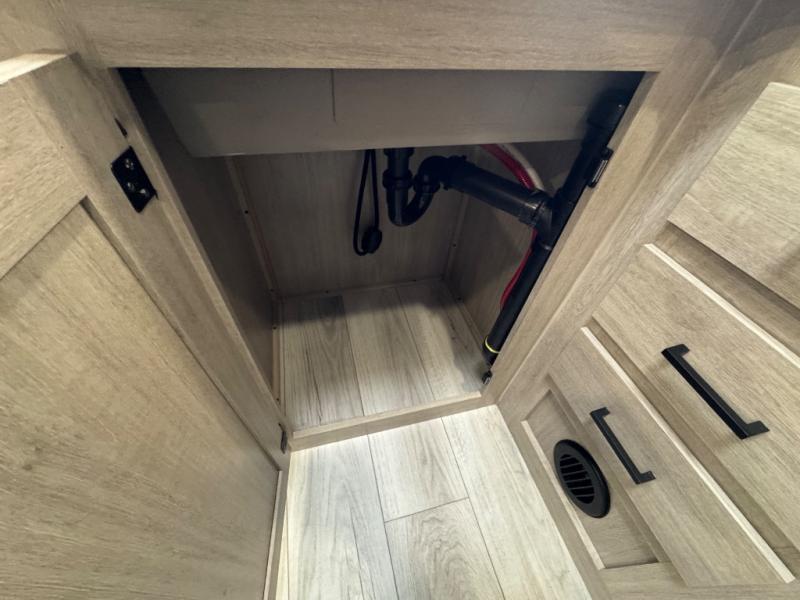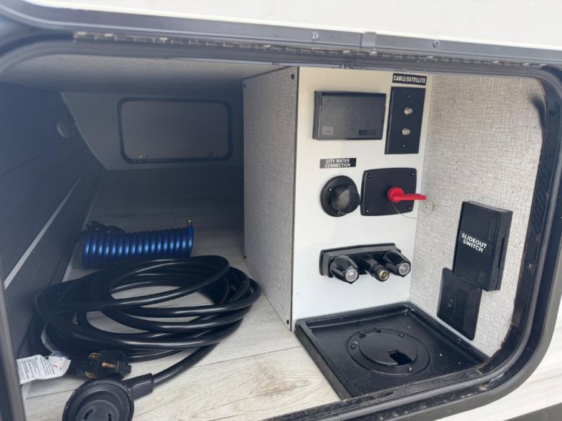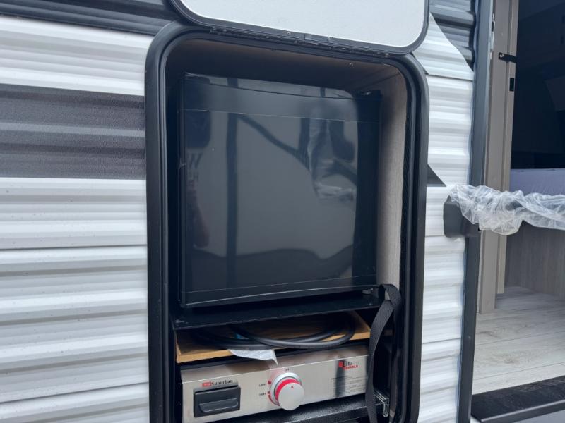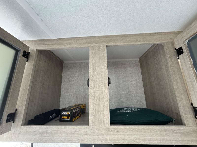 Head to the lake in this travel trailer with a large slide out for more space and comfort and additional sleeping space provided by the double-size bunks! Once you arrive, you can put out the 16' power awning, unload the pass-through storage, and make lunch on the outdoor kitchen with a pull-out griddle and refrigerator. The booth dinette inside can be used as dining space, and there is storage underneath here for added convenience. You will also find a full interior kitchen, and the full bath includes one of the dual entry doors for added convenience. When you're ready for some shut-eye, the king bed in the front private bedroom will feel just like home. There are also dual wardrobes and nightstands to keep your things tidy!