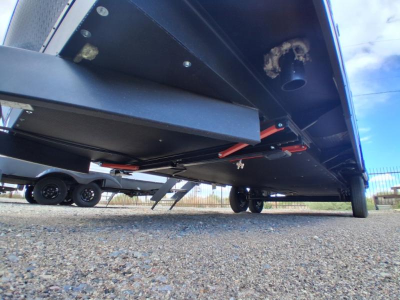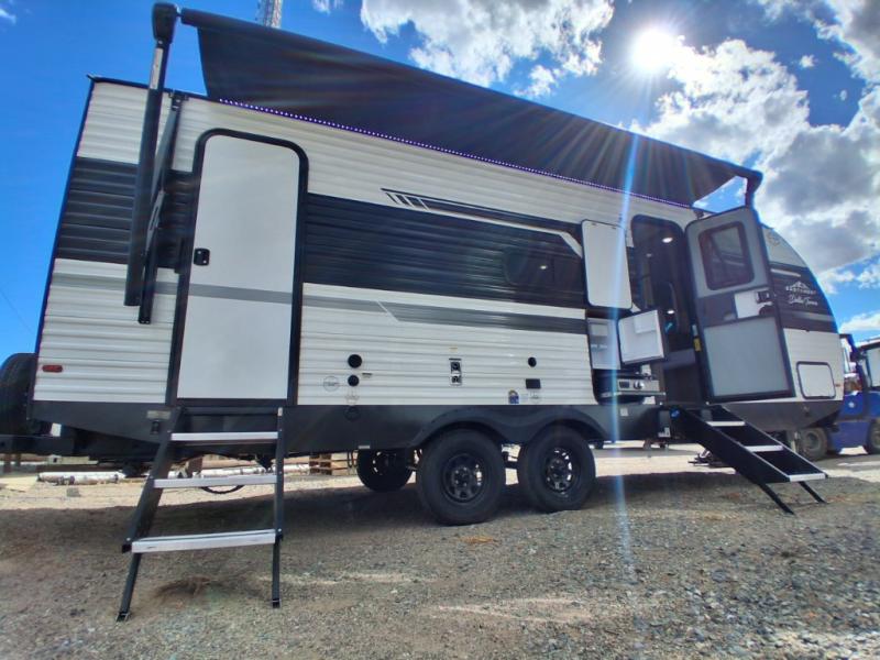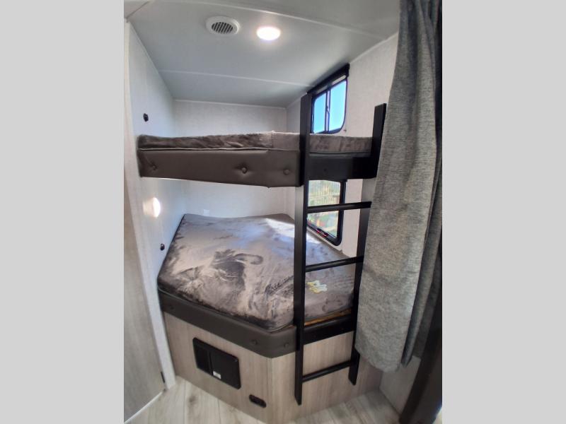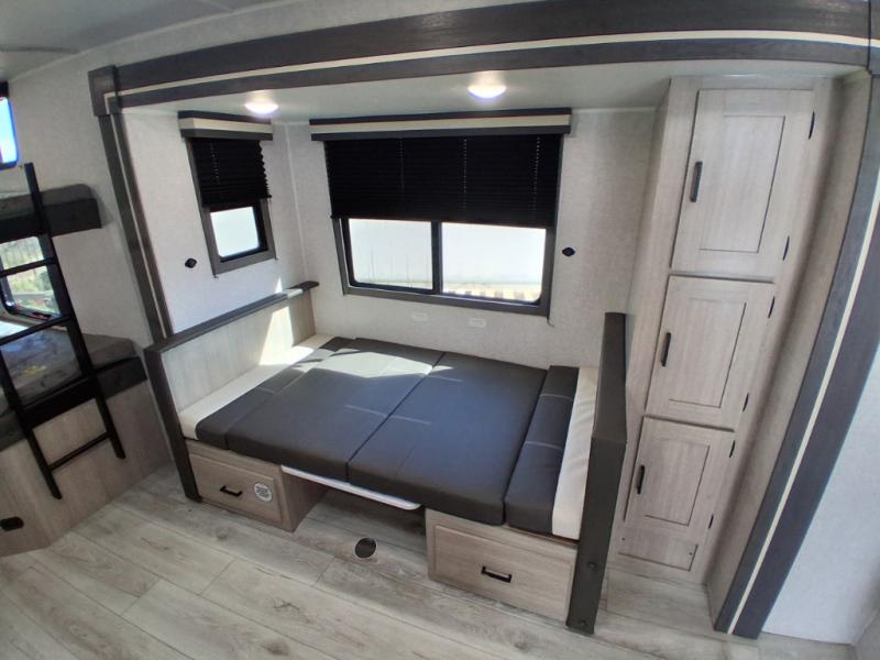 Head to the lake in this travel trailer with a large slide out for more space and comfort and additional sleeping space provided by the double-size bunks! Once you arrive, you can put out the 16' power awning, unload the pass-through storage, and make lunch on the outdoor kitchen with a pull-out griddle and refrigerator. The booth dinette inside can be used as dining space, and there is storage underneath here for added convenience. You will also find a full interior kitchen, and the full bath includes one of the dual entry doors for added convenience. When you're ready for some shut-eye, the king bed in the front private bedroom will feel just like home. There are also dual wardrobes and nightstands to keep your things tidy!