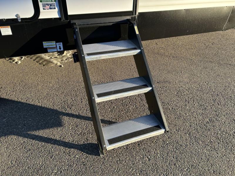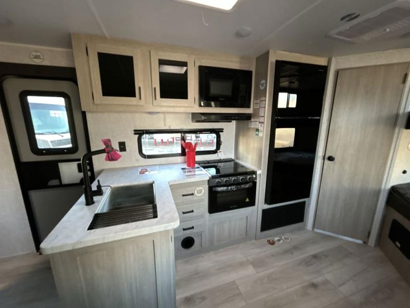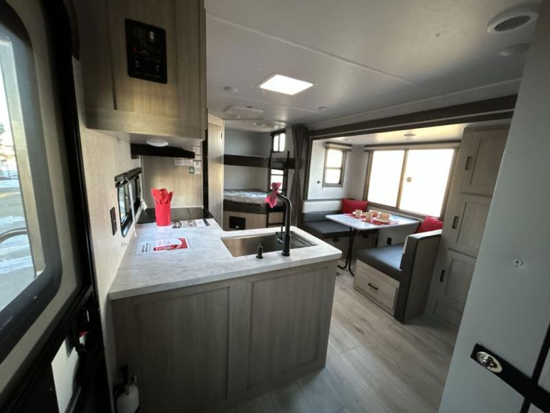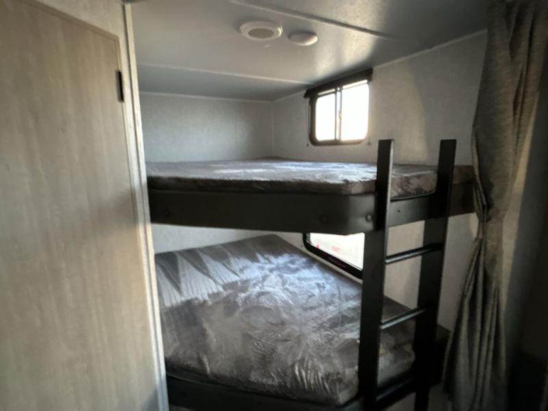 Head to the lake in this travel trailer with a large slide out for more space and comfort and additional sleeping space provided by the double-size bunks! Once you arrive, you can put out the 16' power awning, unload the pass-through storage, and make lunch on the outdoor kitchen with a pull-out griddle and refrigerator. The booth dinette inside can be used as dining space, and there is storage underneath here for added convenience. You will also find a full interior kitchen, and the full bath includes one of the dual entry doors for added convenience. When you're ready for some shut-eye, the king bed in the front private bedroom will feel just like home. There are also dual wardrobes and nightstands to keep your things tidy!