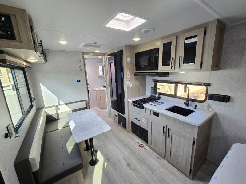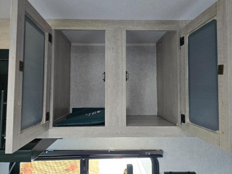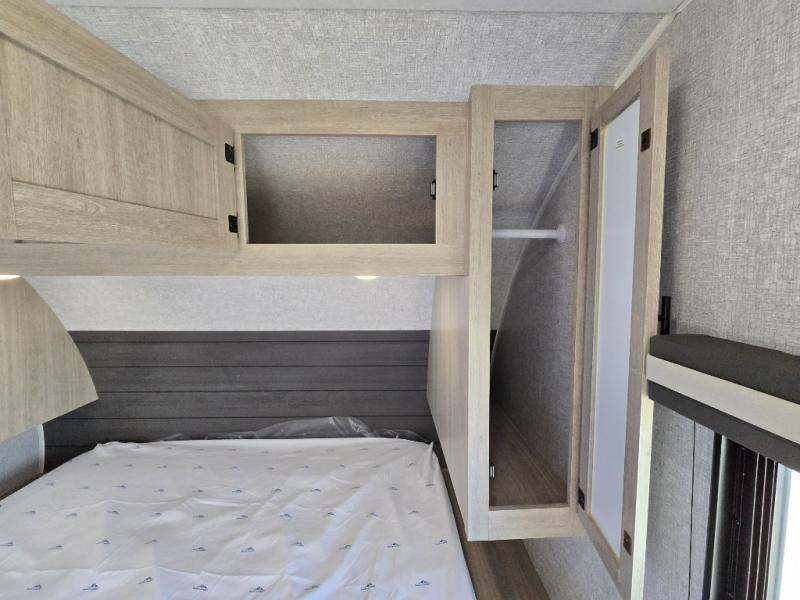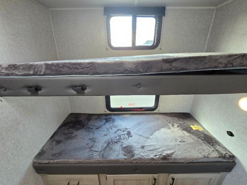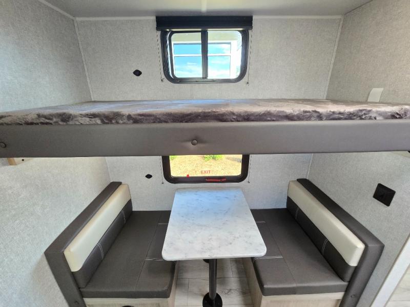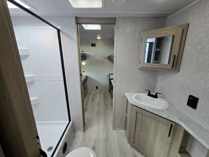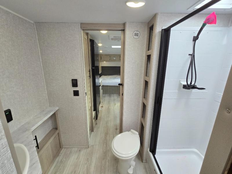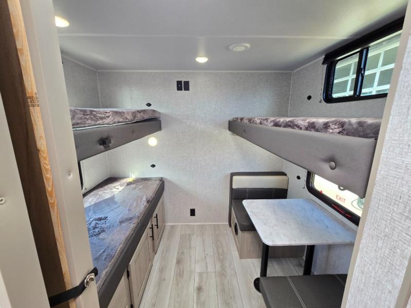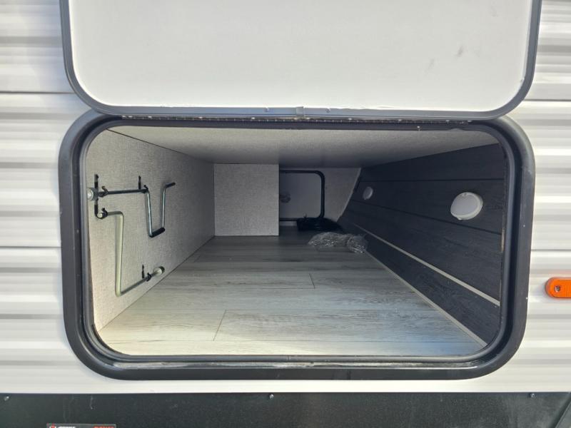 There is much to love in this travel trailer! Starting with the rear private bunkhouse which has a set of double bunk beds with storage underneath and a bunk over a booth dinette with storage underneath it too. The front king bed also has storage underneath it, as well as wardrobes and nightstands on either side of it for your clothes and books. The chef can prepare their best home cooked meals in the fully equipped kitchen, and everyone can enjoy them at the L-shaped dinette with storage underneath for boardgames to play after dinner. The walk-through bathroom makes it easy for all to access the 30" x 36" shower, and you even have an outside shower to rinse the mud off of your feet before entering inside!
