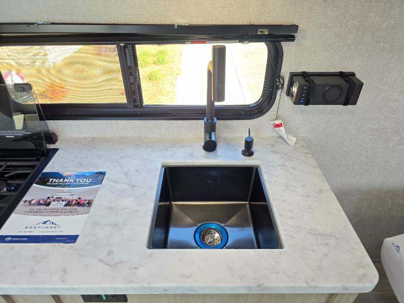 Each Della Terra travel trailer by EAST TO WEST is constructed with an enclosed and heated underbelly and enclosed holding tanks for added protection against the elements. There is also a power tongue jack with an LED light for easy set up and a power awning with LED lights you can rest under after you've unpacked. The Explore Comfort Package comes seamless pressed countertops, kitchen backsplash, window valance package with black night shades, and many more comforts. You will also appreciate the Adventure Outdoor Package with backup camera prep and solar prep, a tankless water heater, an RV grill quick disconnect, and a universal docking station with battery disconnect.