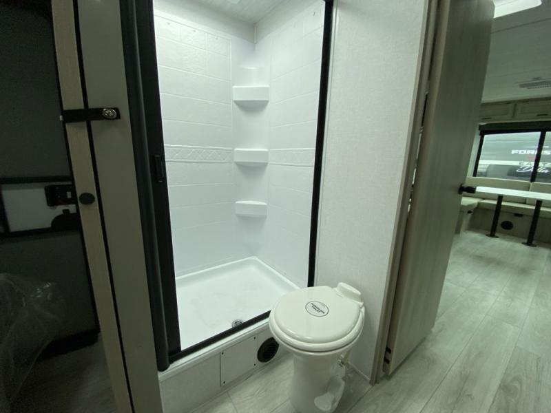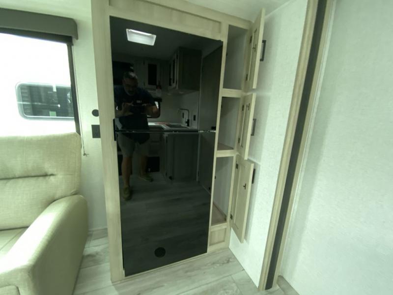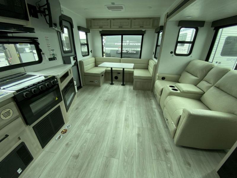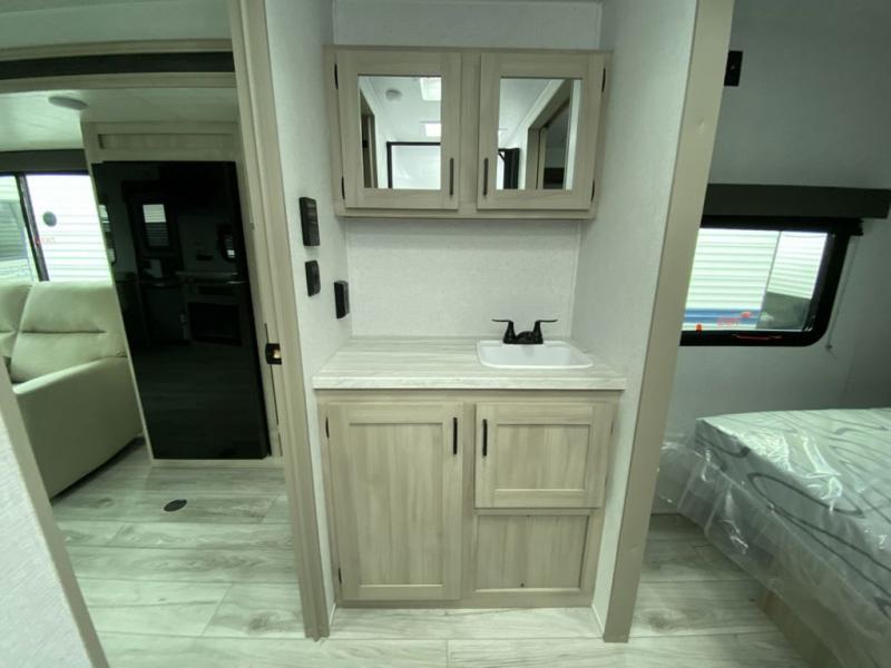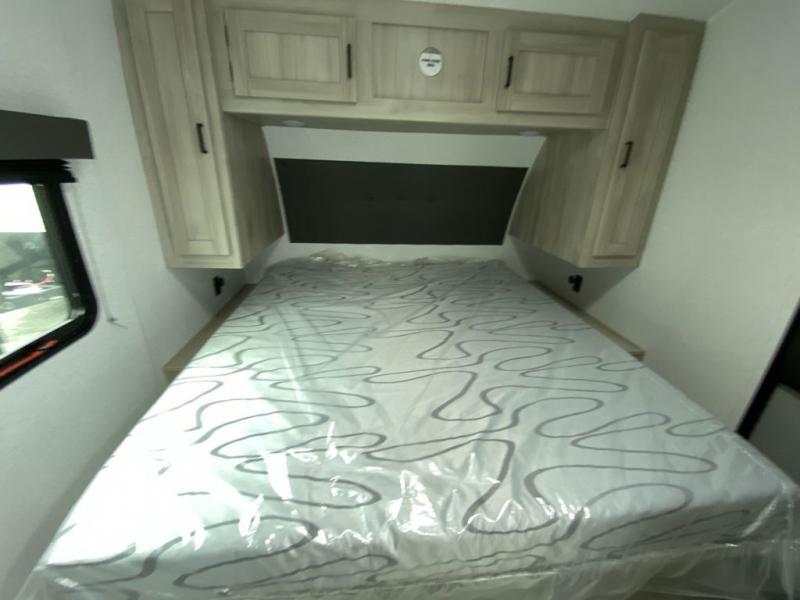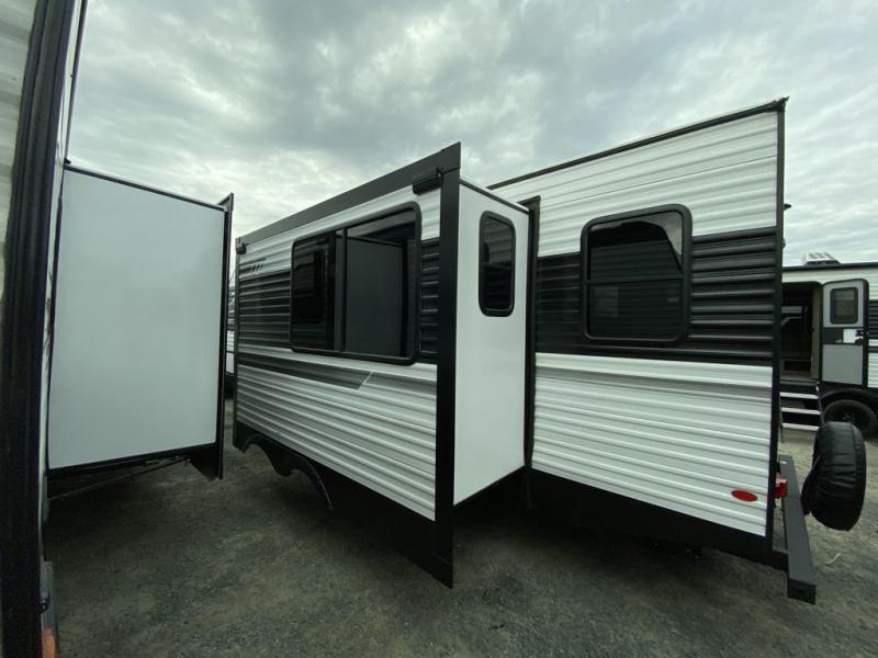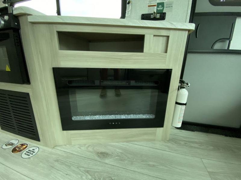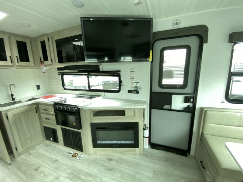 When you are wanting a little more interior space in your next travel trailer, take a look inside! This large slide out widens the main living space so you can easily make meals using full amenities without having to move for someone walking from the front bedroom and walk-through bath to the U-shaped dinette in the back. For sleeping, there is a king-size bed with storage on both sides at the very front of this unit giving you privacy from the rest, and even a private second entry/exit door from within the bedroom. You will find storage beneath the bed for larger items or extra blankets, plus a space saving sliding door. The U-shaped dinette and jackknife sofa offer comfortable seating as well as extra sleeping space for overnight guests, and the fireplace is just a nice feature to enjoy. On the outside, an 18' awning provides a large outdoor living area protected from the elements, and the oversized pass-through will house all of your exterior gear like lawn chairs, outdoor games and rugs, plus so much more!