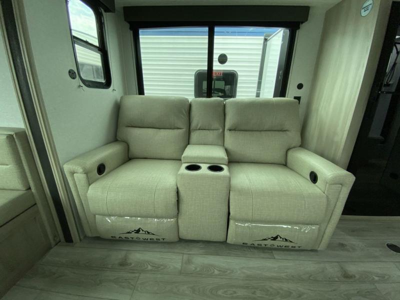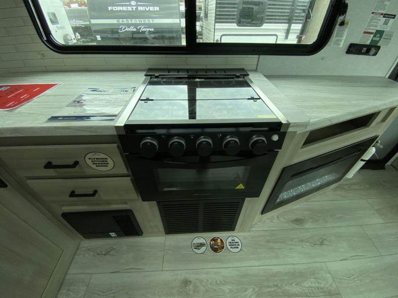 Each Della Terra travel trailer by EAST TO WEST is constructed with an enclosed and heated underbelly and enclosed holding tanks so you can camp all year long. There is also a power tongue jack with an LED light for easy set up and a power awning with LED lights you can rest under after you've unpacked. The Explore Comfort Package comes seamless pressed countertops, kitchen backsplash, window valance package with black night shades, and many more comforts. You will also appreciate the Adventure Outdoor Package with backup camera prep and solar prep, a tankless water heater, an RV grill quick disconnect, and a universal docking station with battery disconnect.