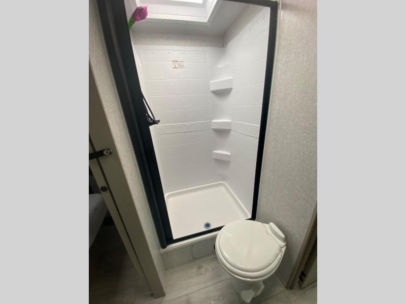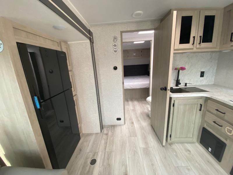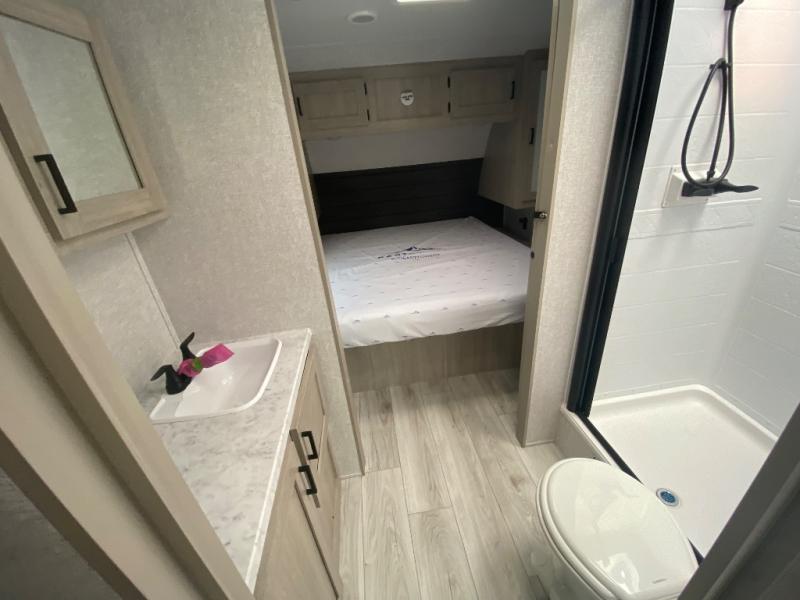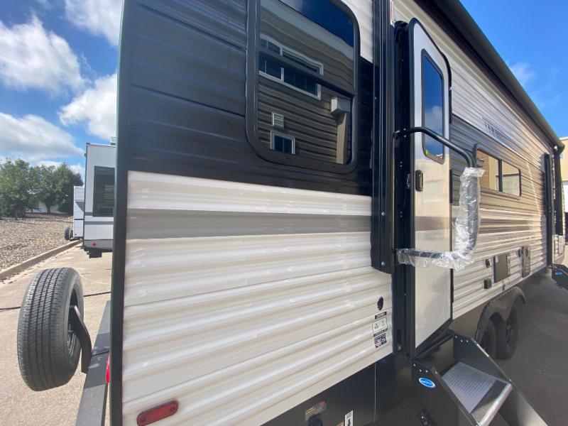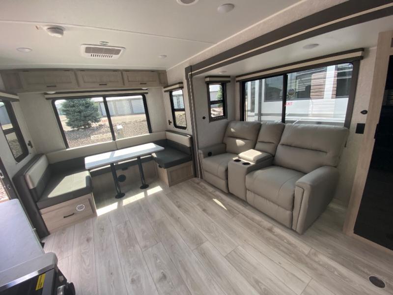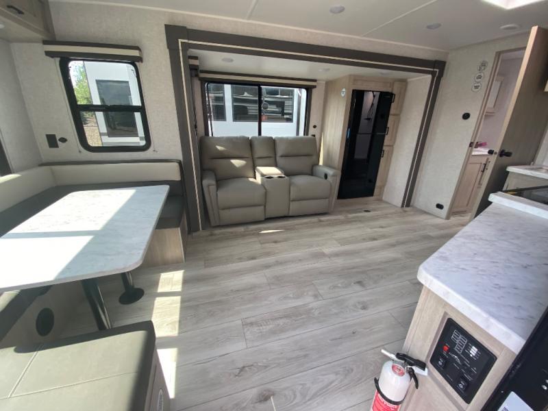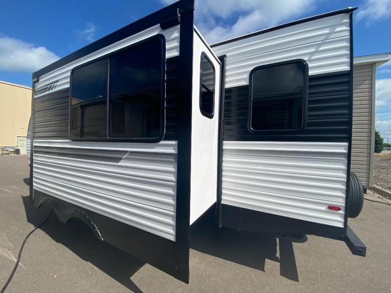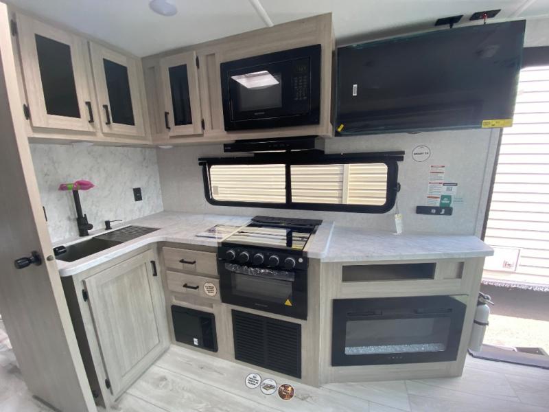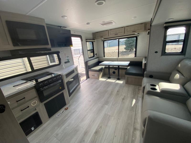 When you are wanting a little more interior space in your next travel trailer, take a look inside! This large slide out widens the main living space so you can easily make meals using full amenities without having to move for someone walking from the front bedroom and walk-through bath to the U-shaped dinette in the back. For sleeping, there is a king-size bed with storage on both sides at the very front of this unit giving you privacy from the rest, and even a private second entry/exit door from within the bedroom. You will find storage beneath the bed for larger items or extra blankets, plus a space saving sliding door. The U-shaped dinette and jackknife sofa offer comfortable seating as well as extra sleeping space for overnight guests, and the fireplace is just a nice feature to enjoy. On the outside, an 18' awning provides a large outdoor living area protected from the elements, and the oversized pass-through will house all of your exterior gear like lawn chairs, outdoor games and rugs, plus so much more!