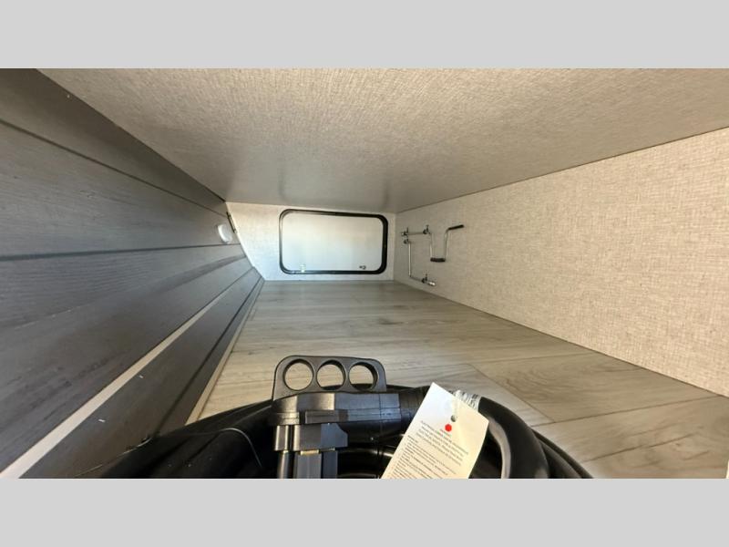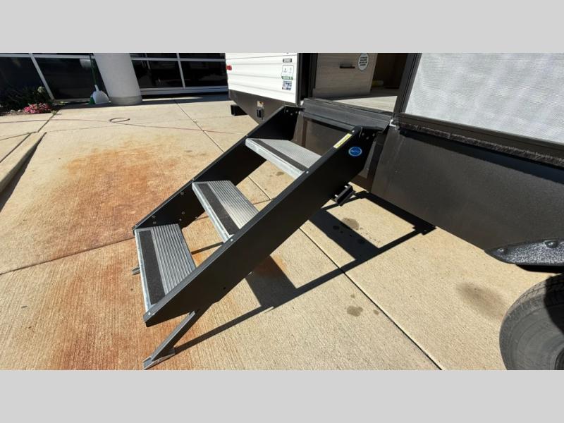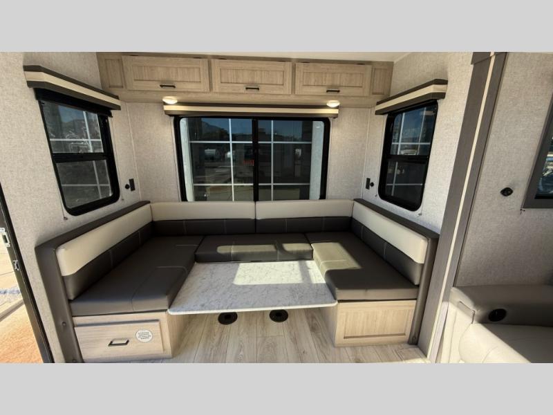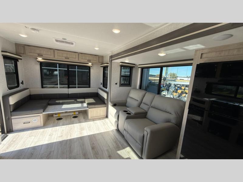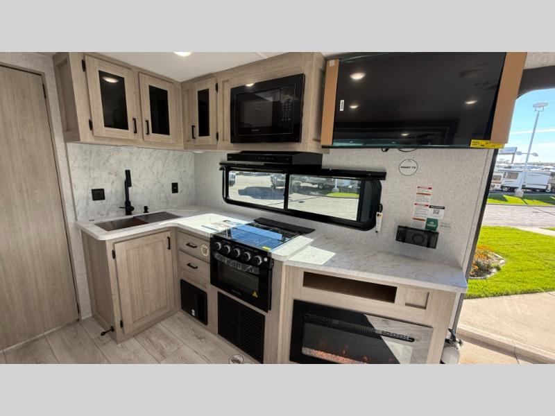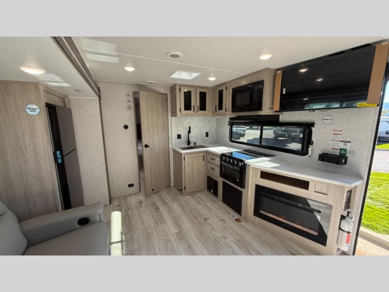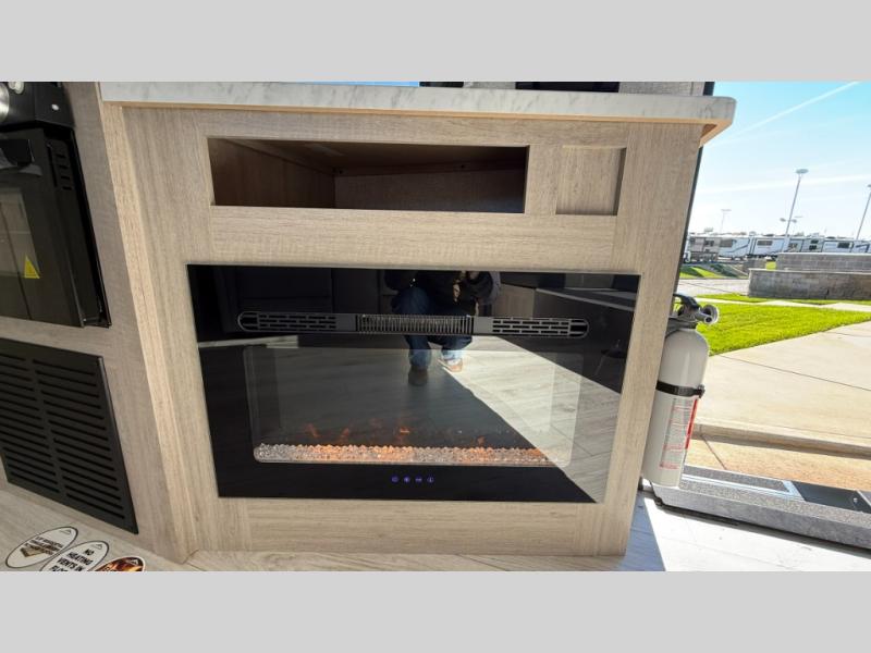 When you are wanting a little more interior space in your next travel trailer, take a look inside! This large slide out widens the main living space so you can easily make meals using full amenities without having to move for someone walking from the front bedroom and walk-through bath to the U-shaped dinette in the back. For sleeping, there is a king-size bed with storage on both sides at the very front of this unit giving you privacy from the rest, and even a private second entry/exit door from within the bedroom. You will find storage beneath the bed for larger items or extra blankets, plus a space saving sliding door. The U-shaped dinette and jackknife sofa offer comfortable seating as well as extra sleeping space for overnight guests, and the fireplace is just a nice feature to enjoy. On the outside, an 18' awning provides a large outdoor living area protected from the elements, and the oversized pass-through will house all of your exterior gear like lawn chairs, outdoor games and rugs, plus so much more!