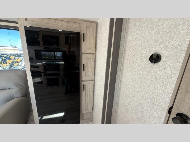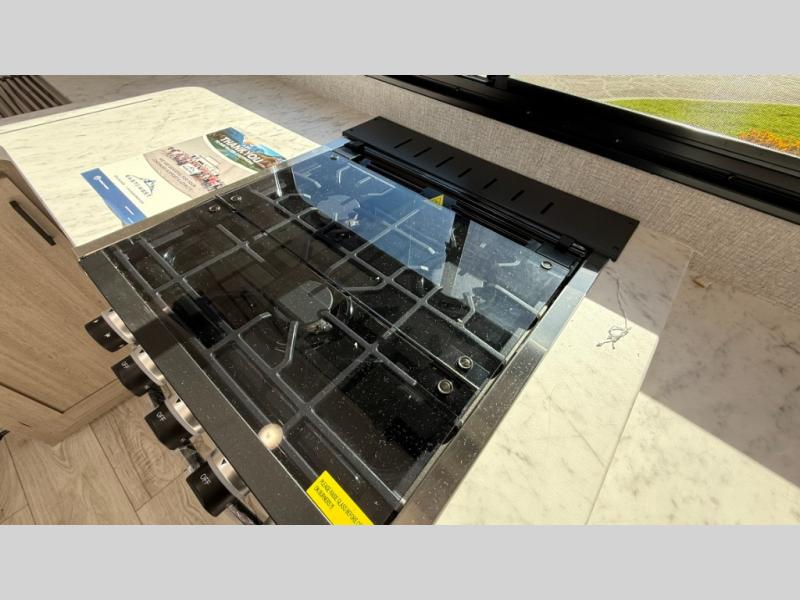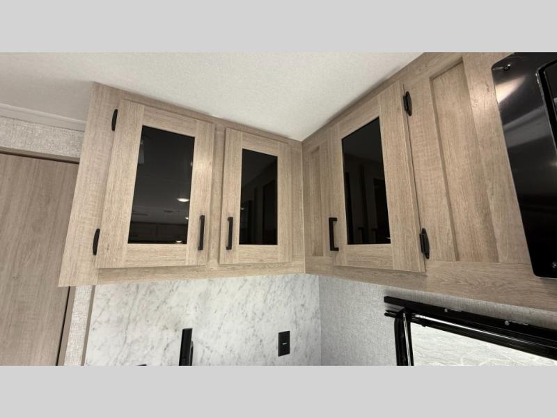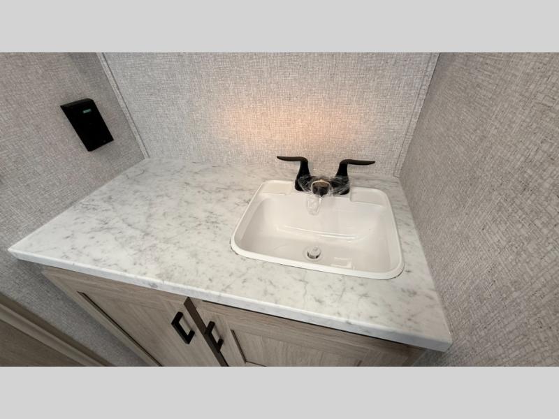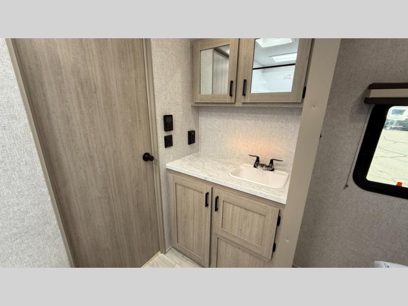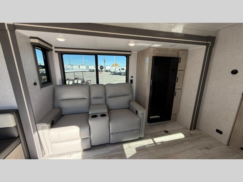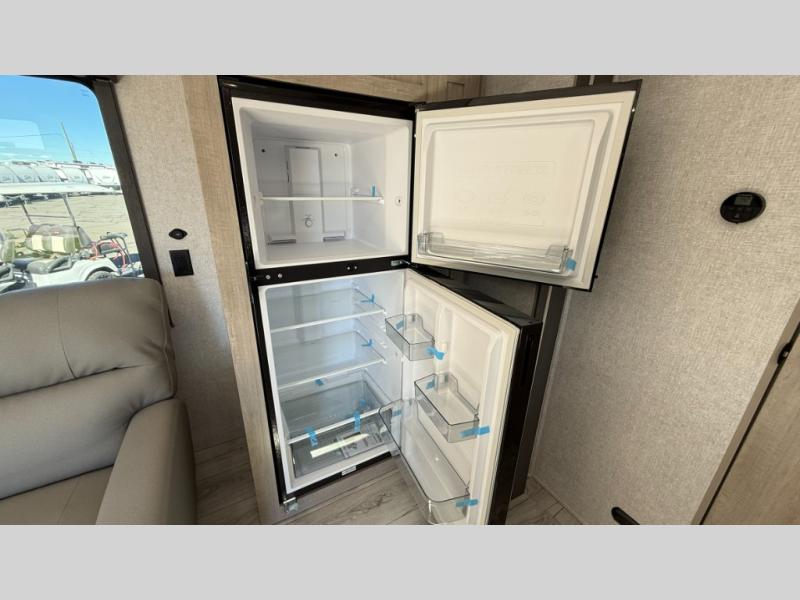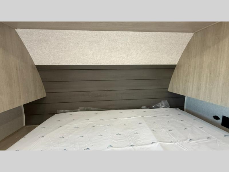 When you are wanting a little more interior space in your next travel trailer, take a look inside! This large slide out widens the main living space so you can easily make meals using full amenities without having to move for someone walking from the front bedroom and walk-through bath to the U-shaped dinette in the back. For sleeping, there is a king-size bed with storage on both sides at the very front of this unit giving you privacy from the rest, and even a private second entry/exit door from within the bedroom. You will find storage beneath the bed for larger items or extra blankets, plus a space saving sliding door. The U-shaped dinette and jackknife sofa offer comfortable seating as well as extra sleeping space for overnight guests, and the fireplace is just a nice feature to enjoy. On the outside, an 18' awning provides a large outdoor living area protected from the elements, and the oversized pass-through will house all of your exterior gear like lawn chairs, outdoor games and rugs, plus so much more!