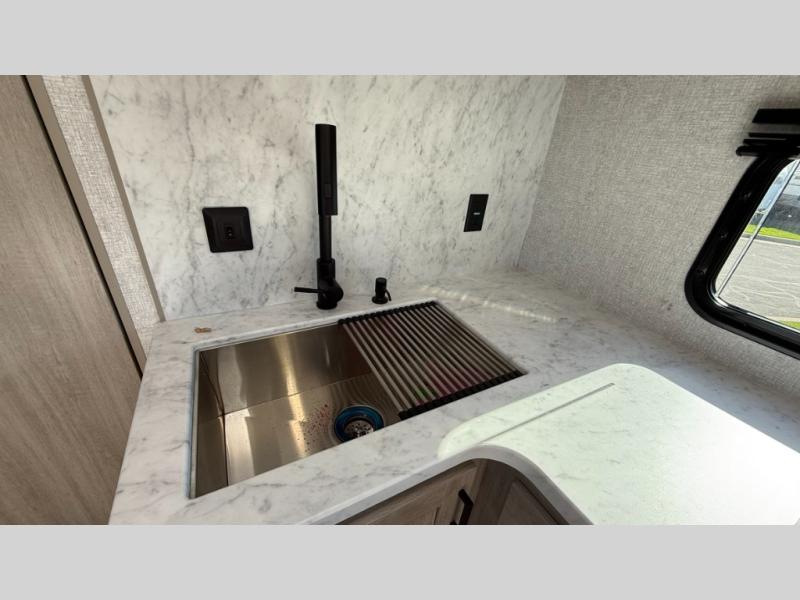 Each Della Terra travel trailer by EAST TO WEST is constructed with an enclosed and heated underbelly and enclosed holding tanks for added protection against the elements. There is also a power tongue jack with an LED light for easy set up and a power awning with LED lights you can rest under after you've unpacked. The Explore Comfort Package comes seamless pressed countertops, kitchen backsplash, window valance package with black night shades, and many more comforts. You will also appreciate the Adventure Outdoor Package with backup camera prep and solar prep, a tankless water heater, an RV grill quick disconnect, and a universal docking station with battery disconnect.
