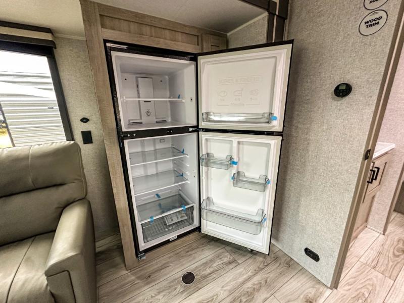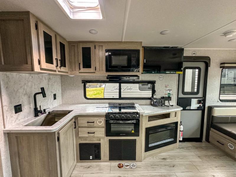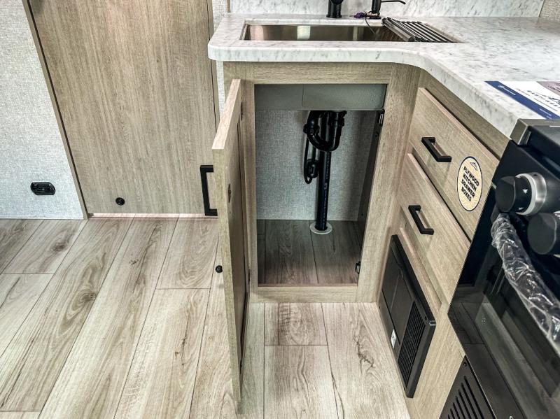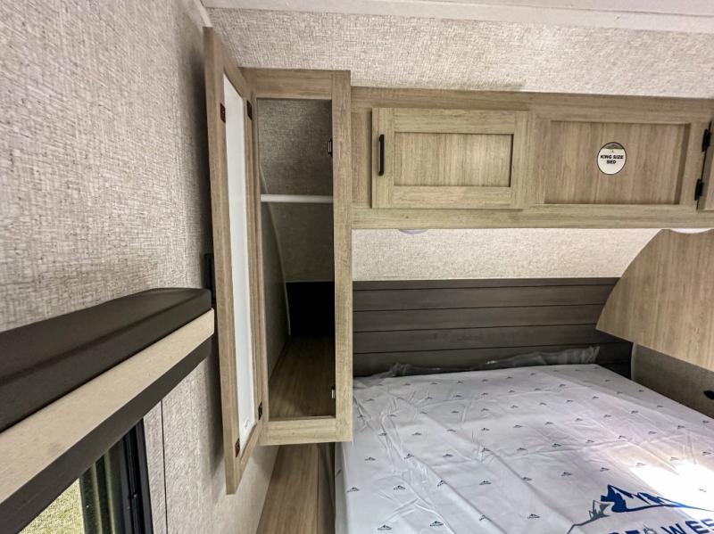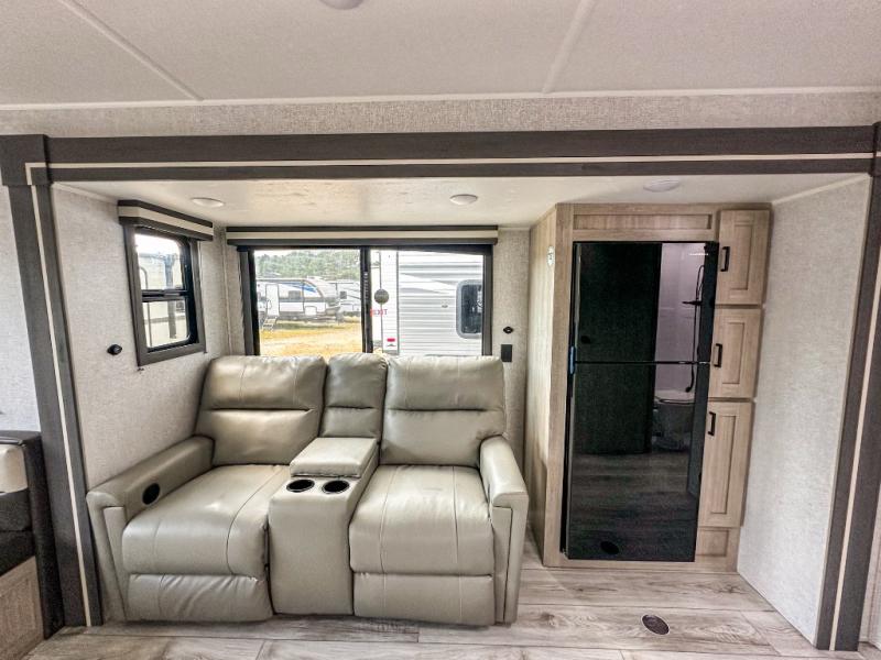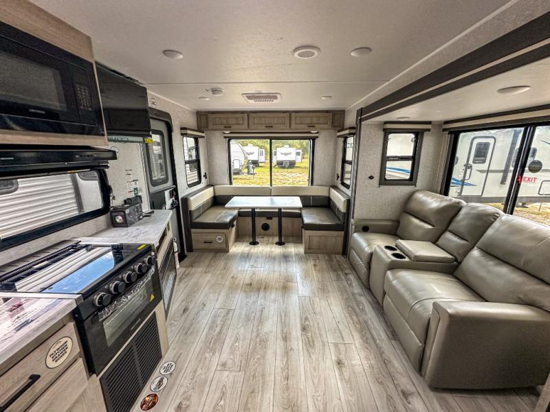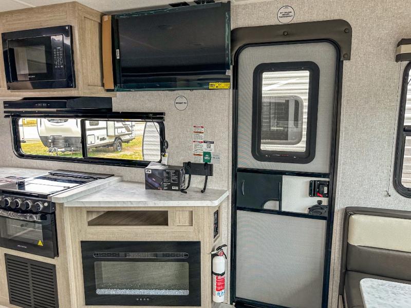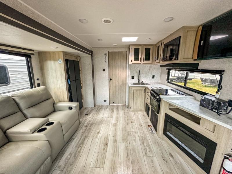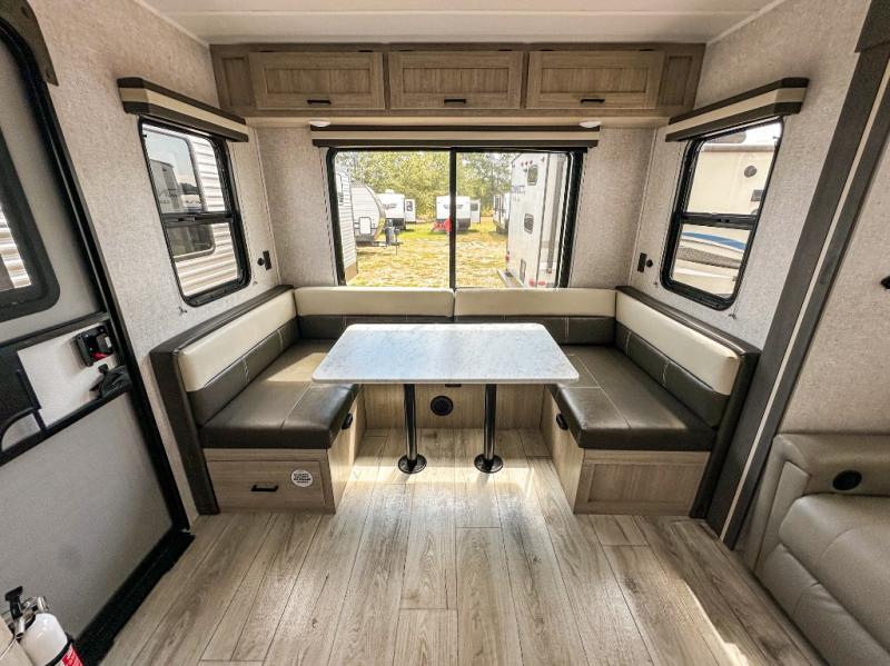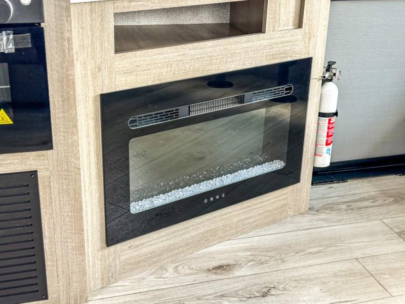 When you are wanting a little more interior space in your next travel trailer, take a look inside! This large slide out widens the main living space so you can easily make meals using full amenities without having to move for someone walking from the front bedroom and walk-through bath to the U-shaped dinette in the back. For sleeping, there is a king-size bed with storage on both sides at the very front of this unit giving you privacy from the rest, and even a private second entry/exit door from within the bedroom. You will find storage beneath the bed for larger items or extra blankets, plus a space saving sliding door. The U-shaped dinette and jackknife sofa offer comfortable seating as well as extra sleeping space for overnight guests, and the fireplace is just a nice feature to enjoy. On the outside, an 18' awning provides a large outdoor living area protected from the elements, and the oversized pass-through will house all of your exterior gear like lawn chairs, outdoor games and rugs, plus so much more!