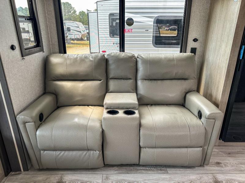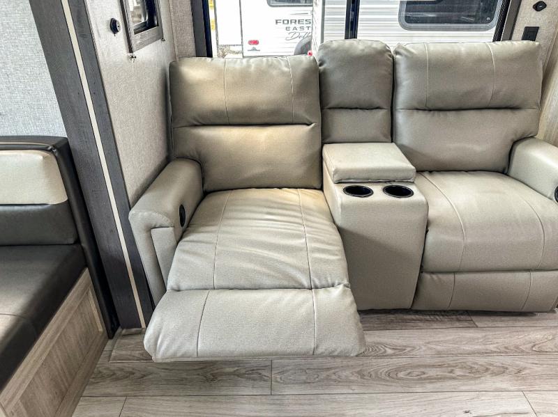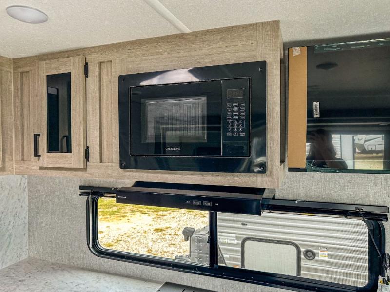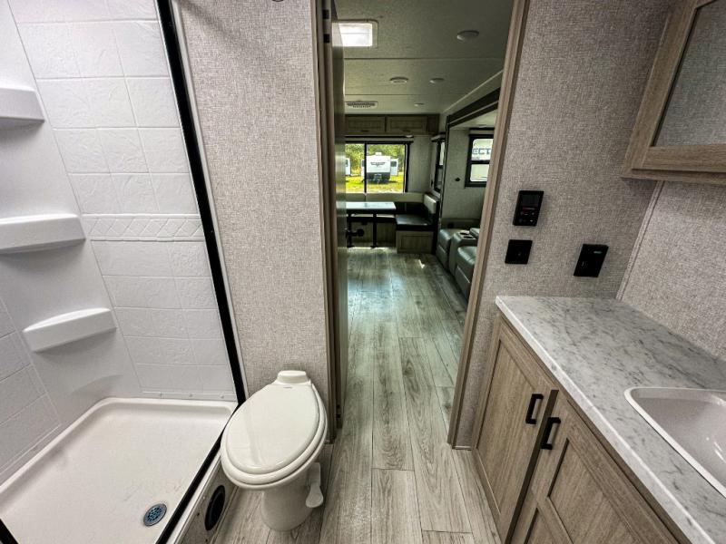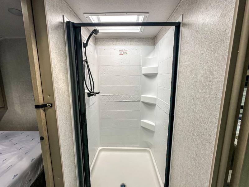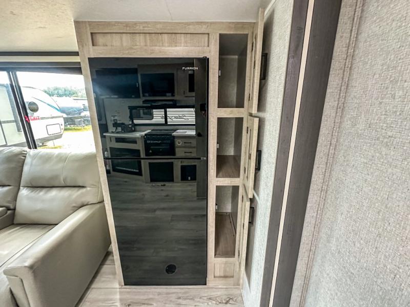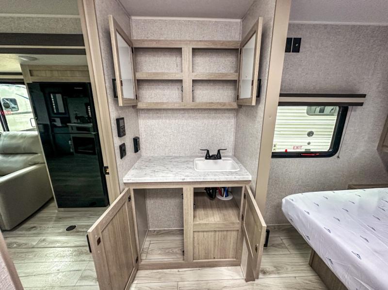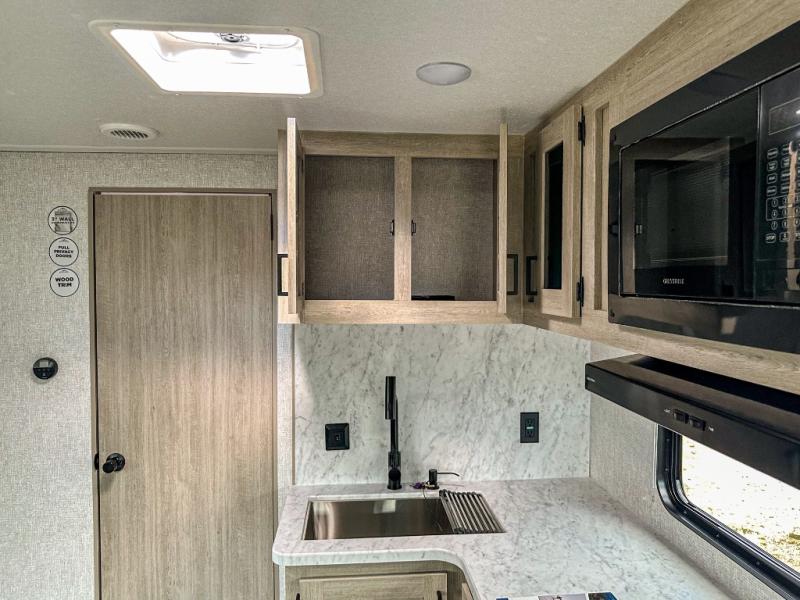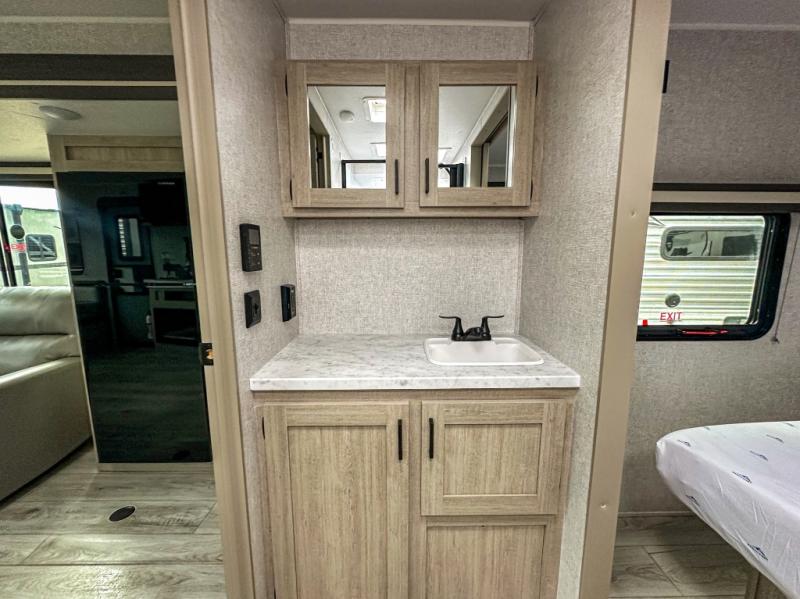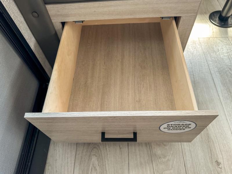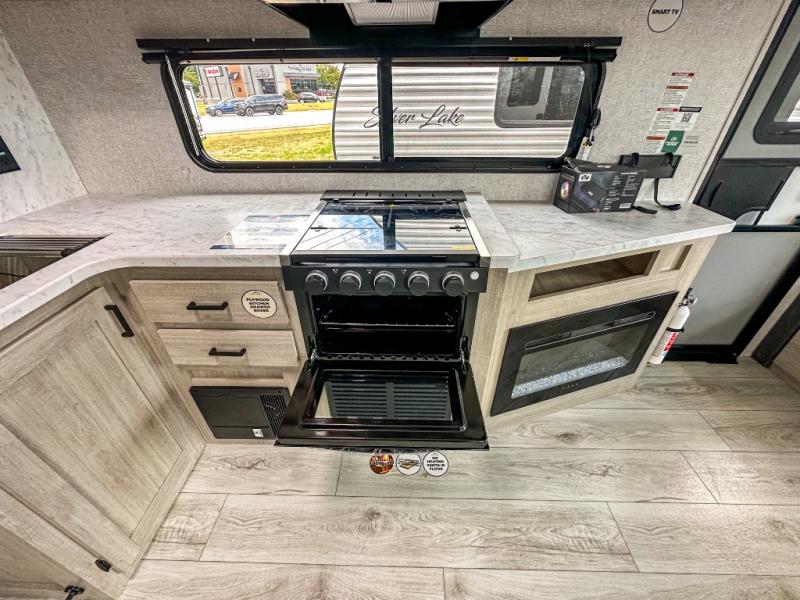 When you are wanting a little more interior space in your next travel trailer, take a look inside! This large slide out widens the main living space so you can easily make meals using full amenities without having to move for someone walking from the front bedroom and walk-through bath to the U-shaped dinette in the back. For sleeping, there is a king-size bed with storage on both sides at the very front of this unit giving you privacy from the rest, and even a private second entry/exit door from within the bedroom. You will find storage beneath the bed for larger items or extra blankets, plus a space saving sliding door. The U-shaped dinette and jackknife sofa offer comfortable seating as well as extra sleeping space for overnight guests, and the fireplace is just a nice feature to enjoy. On the outside, an 18' awning provides a large outdoor living area protected from the elements, and the oversized pass-through will house all of your exterior gear like lawn chairs, outdoor games and rugs, plus so much more!