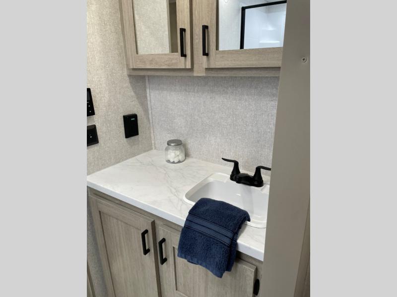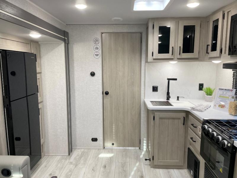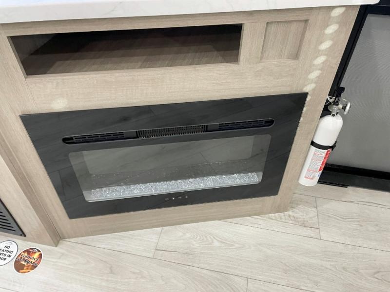 When you are wanting a little more interior space in your next travel trailer, take a look inside! This large slide out widens the main living space so you can easily make meals using full amenities without having to move for someone walking from the front bedroom and walk-through bath to the U-shaped dinette in the back. For sleeping, there is a king-size bed with storage on both sides at the very front of this unit giving you privacy from the rest, and even a private second entry/exit door from within the bedroom. You will find storage beneath the bed for larger items or extra blankets, plus a space saving sliding door. The U-shaped dinette and jackknife sofa offer comfortable seating as well as extra sleeping space for overnight guests, and the fireplace is just a nice feature to enjoy. On the outside, an 18' awning provides a large outdoor living area protected from the elements, and the oversized pass-through will house all of your exterior gear like lawn chairs, outdoor games and rugs, plus so much more!
