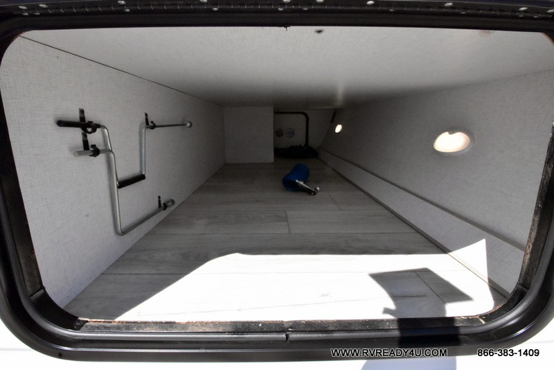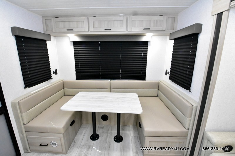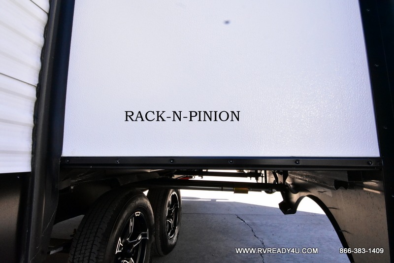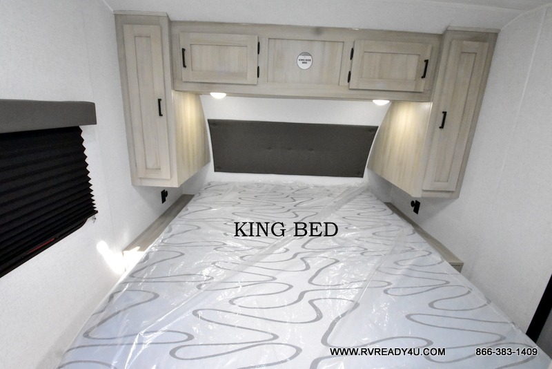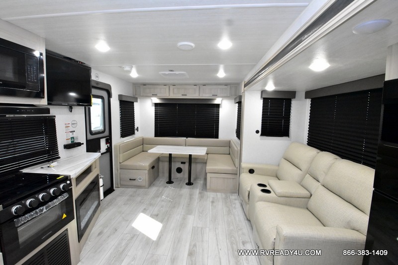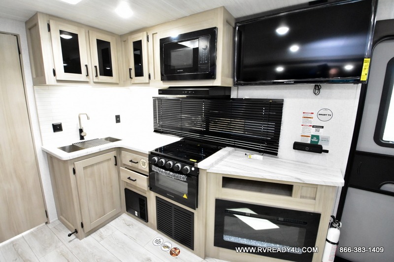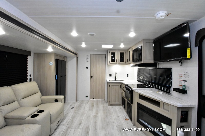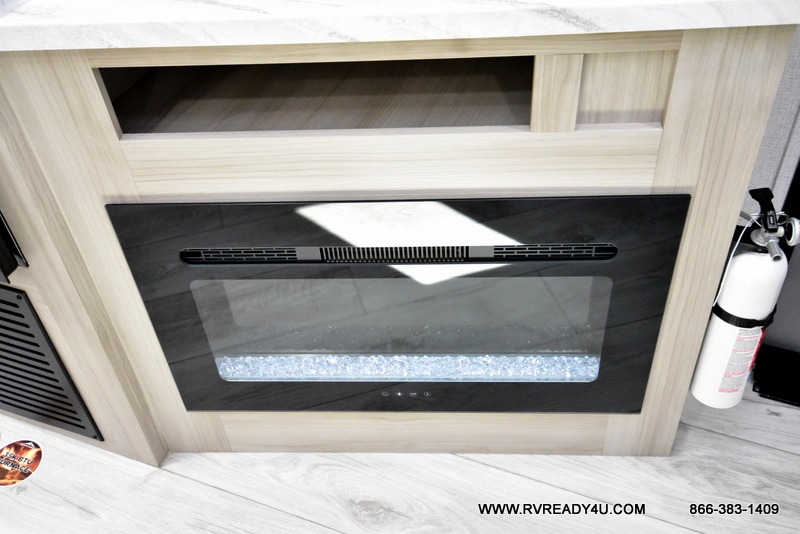 When you are wanting a little more interior space in your next travel trailer, take a look inside! This large slide out widens the main living space so you can easily make meals using full amenities without having to move for someone walking from the front bedroom and walk-through bath to the U-shaped dinette in the back. For sleeping, there is a king-size bed with storage on both sides at the very front of this unit giving you privacy from the rest, and even a private second entry/exit door from within the bedroom. You will find storage beneath the bed for larger items or extra blankets, plus a space saving sliding door. The U-shaped dinette and jackknife sofa offer comfortable seating as well as extra sleeping space for overnight guests, and the fireplace is just a nice feature to enjoy. On the outside, an 18' awning provides a large outdoor living area protected from the elements, and the oversized pass-through will house all of your exterior gear like lawn chairs, outdoor games and rugs, plus so much more!
