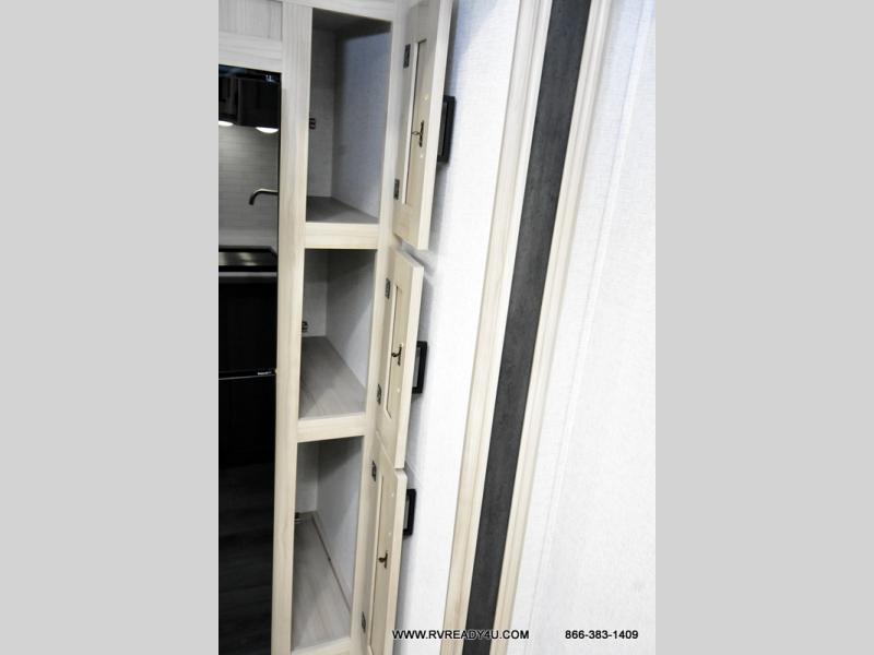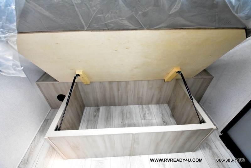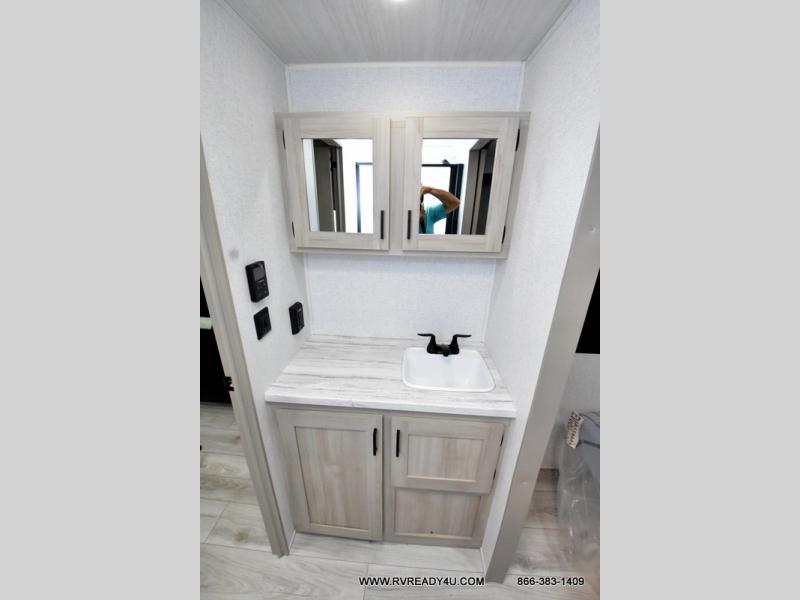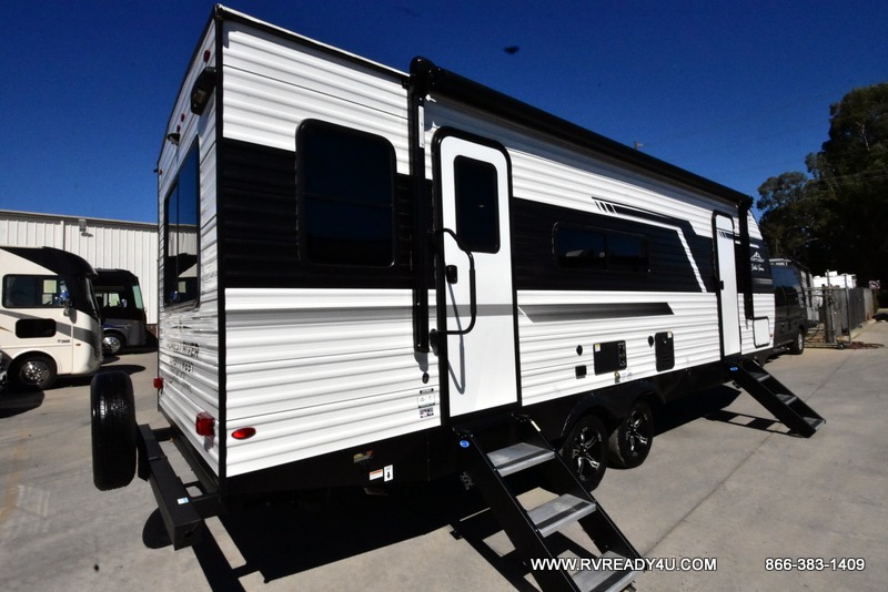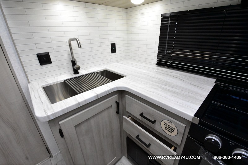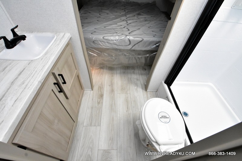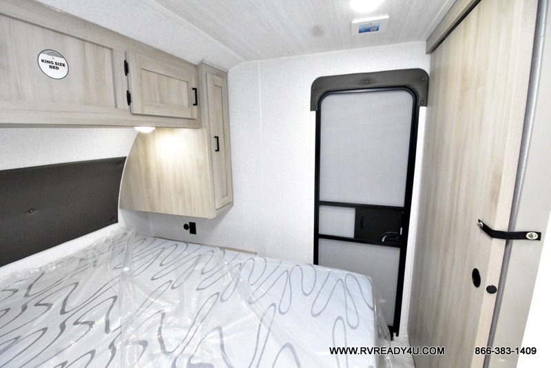 When you are wanting a little more interior space in your next travel trailer, take a look inside! This large slide out widens the main living space so you can easily make meals using full amenities without having to move for someone walking from the front bedroom and walk-through bath to the U-shaped dinette in the back. For sleeping, there is a king-size bed with storage on both sides at the very front of this unit giving you privacy from the rest, and even a private second entry/exit door from within the bedroom. You will find storage beneath the bed for larger items or extra blankets, plus a space saving sliding door. The U-shaped dinette and jackknife sofa offer comfortable seating as well as extra sleeping space for overnight guests, and the fireplace is just a nice feature to enjoy. On the outside, an 18' awning provides a large outdoor living area protected from the elements, and the oversized pass-through will house all of your exterior gear like lawn chairs, outdoor games and rugs, plus so much more!