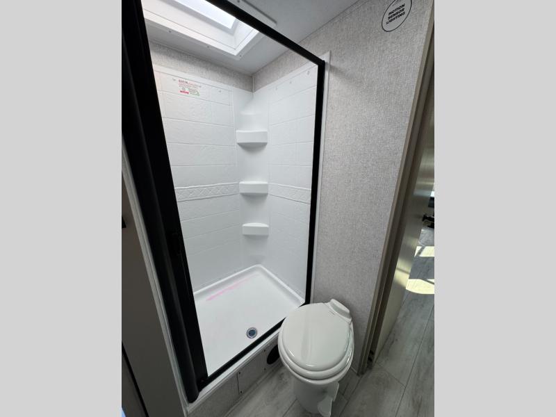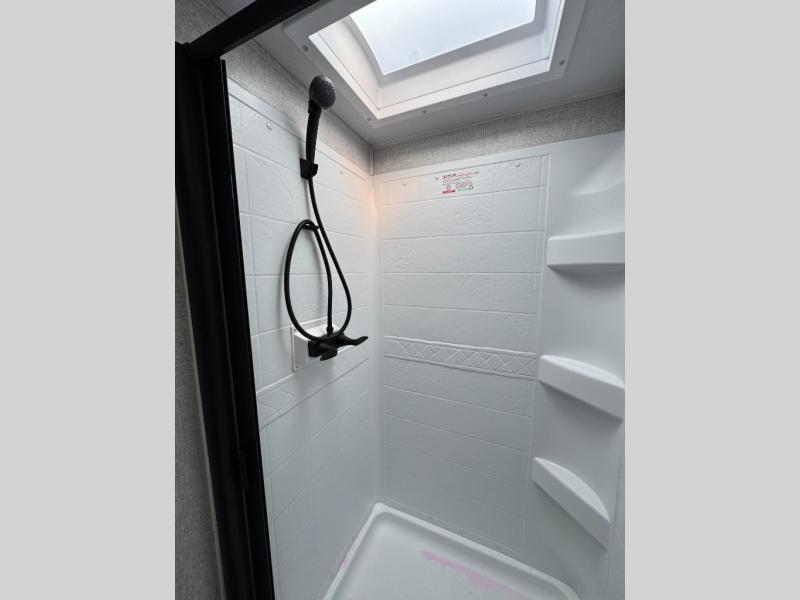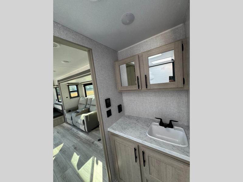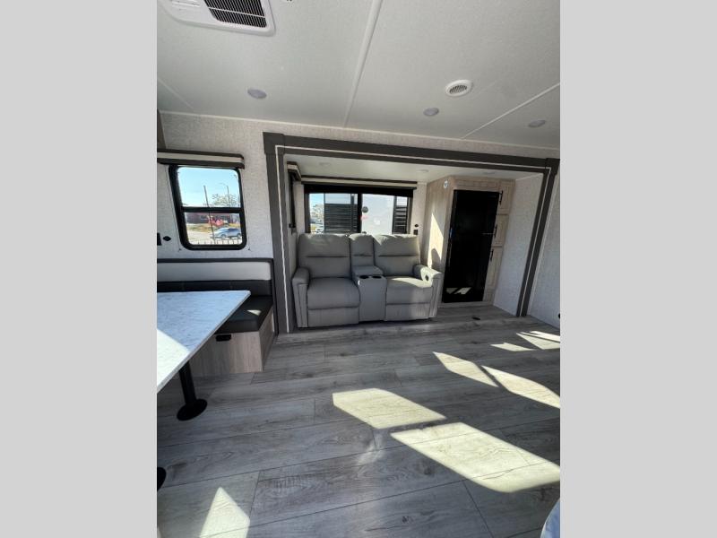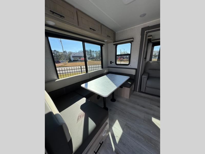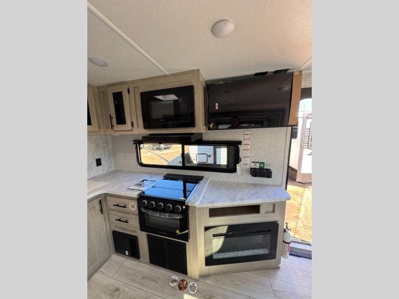 When you are wanting a little more interior space in your next travel trailer, take a look inside! This large slide out widens the main living space so you can easily make meals using full amenities without having to move for someone walking from the front bedroom and walk-through bath to the U-shaped dinette in the back. For sleeping, there is a king-size bed with storage on both sides at the very front of this unit giving you privacy from the rest, and even a private second entry/exit door from within the bedroom. You will find storage beneath the bed for larger items or extra blankets, plus a space saving sliding door. The U-shaped dinette and jackknife sofa offer comfortable seating as well as extra sleeping space for overnight guests, and the fireplace is just a nice feature to enjoy. On the outside, an 18' awning provides a large outdoor living area protected from the elements, and the oversized pass-through will house all of your exterior gear like lawn chairs, outdoor games and rugs, plus so much more!
