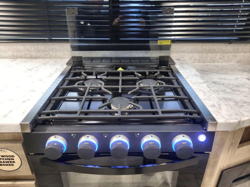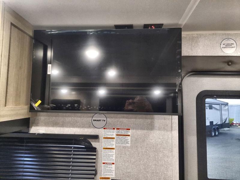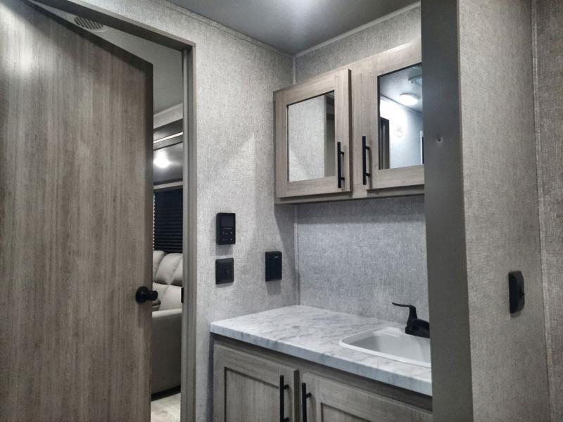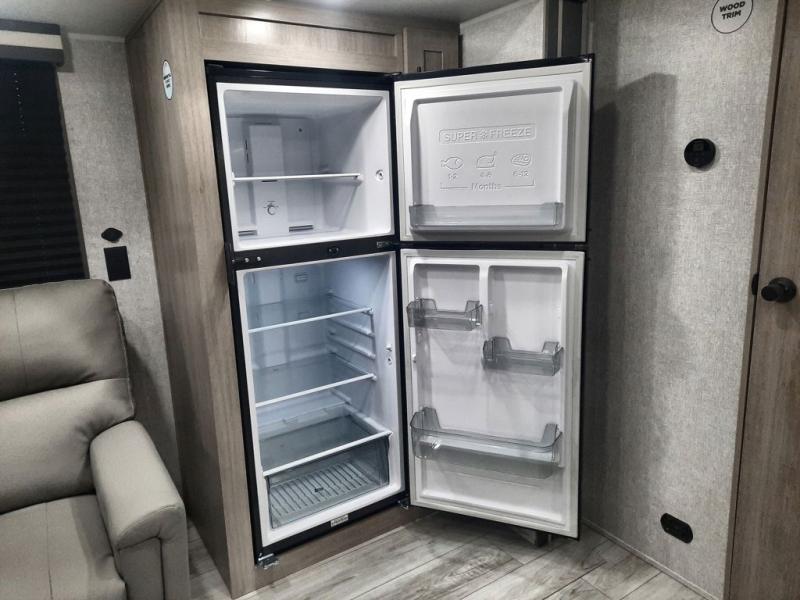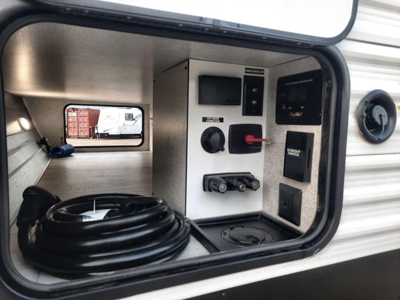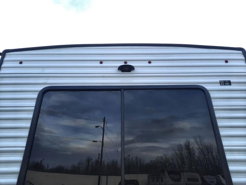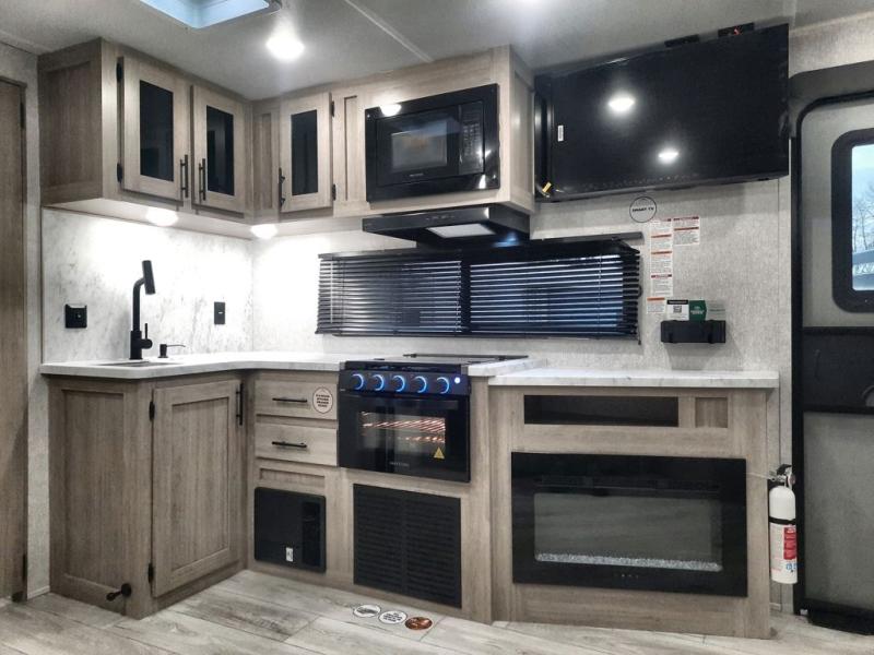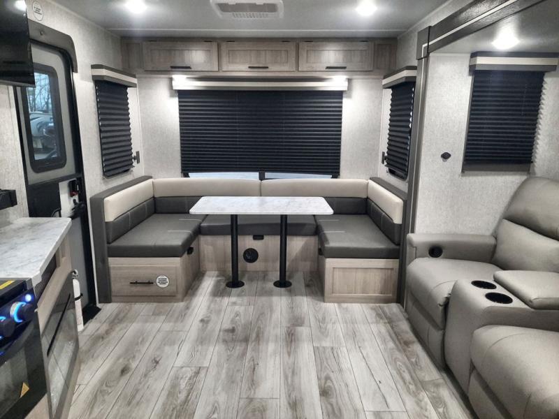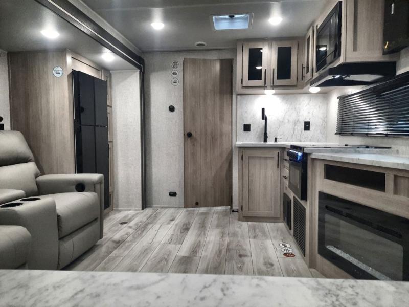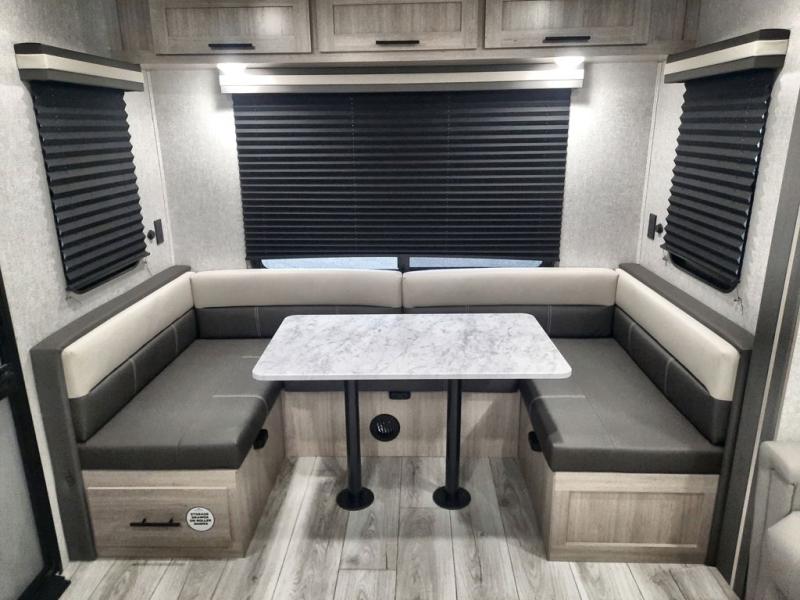 When you are wanting a little more interior space in your next travel trailer, take a look inside! This large slide out widens the main living space so you can easily make meals using full amenities without having to move for someone walking from the front bedroom and walk-through bath to the U-shaped dinette in the back. For sleeping, there is a king-size bed with storage on both sides at the very front of this unit giving you privacy from the rest, and even a private second entry/exit door from within the bedroom. You will find storage beneath the bed for larger items or extra blankets, plus a space saving sliding door. The U-shaped dinette and jackknife sofa offer comfortable seating as well as extra sleeping space for overnight guests, and the fireplace is just a nice feature to enjoy. On the outside, an 18' awning provides a large outdoor living area protected from the elements, and the oversized pass-through will house all of your exterior gear like lawn chairs, outdoor games and rugs, plus so much more!