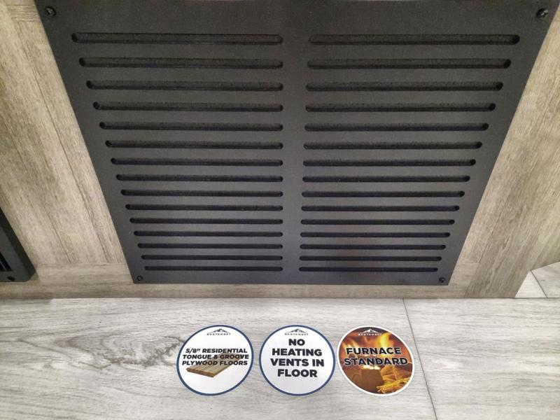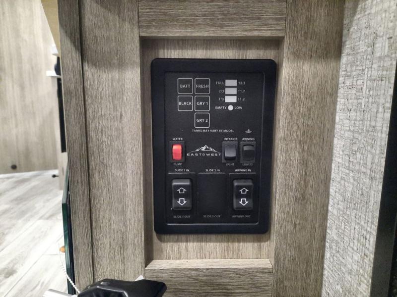 Each Della Terra travel trailer by EAST TO WEST is constructed with an enclosed and heated underbelly and enclosed holding tanks for added protection against the elements. There is also a power tongue jack with an LED light for easy set up and a power awning with LED lights you can rest under after you've unpacked. The Explore Comfort Package comes seamless pressed countertops, kitchen backsplash, window valance package with black night shades, and many more comforts. You will also appreciate the Adventure Outdoor Package with backup camera prep and solar prep, a tankless water heater, an RV grill quick disconnect, and a universal docking station with battery disconnect.