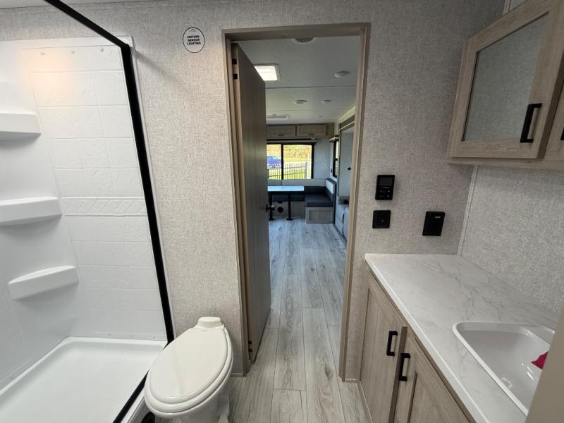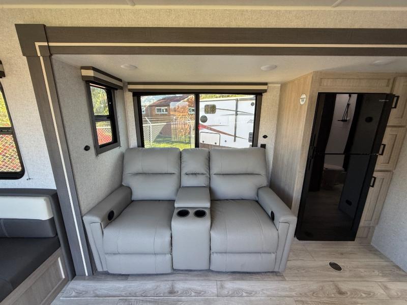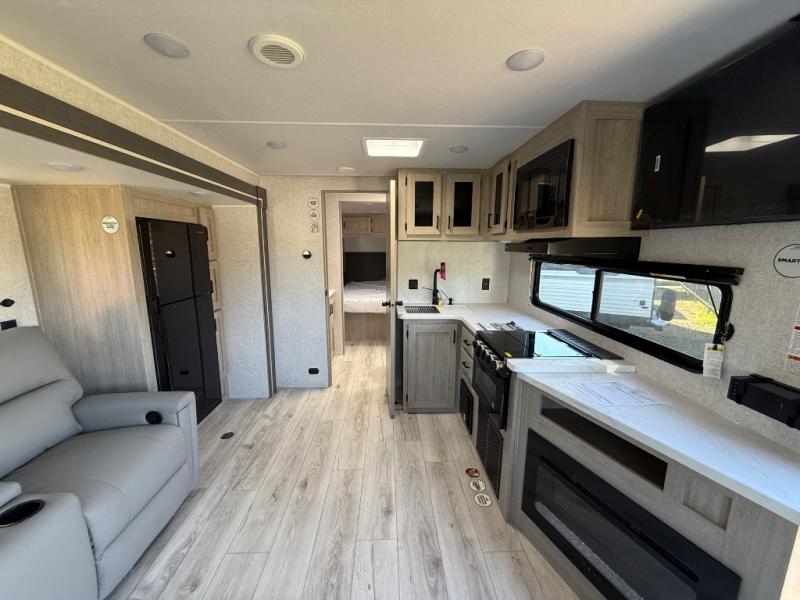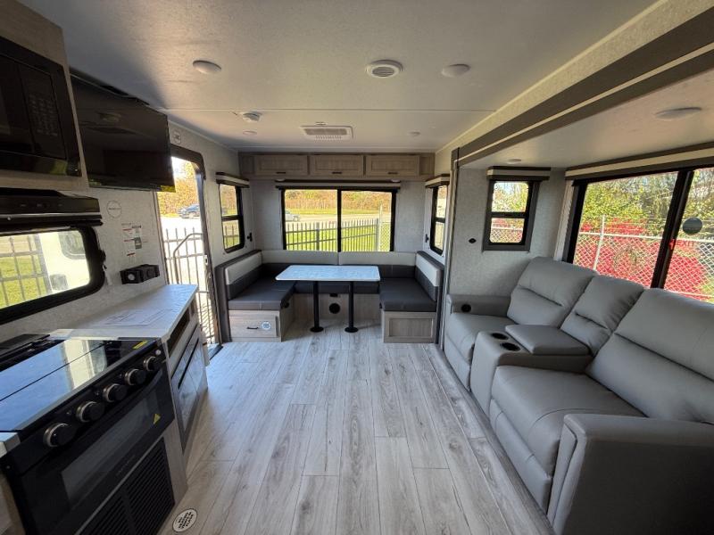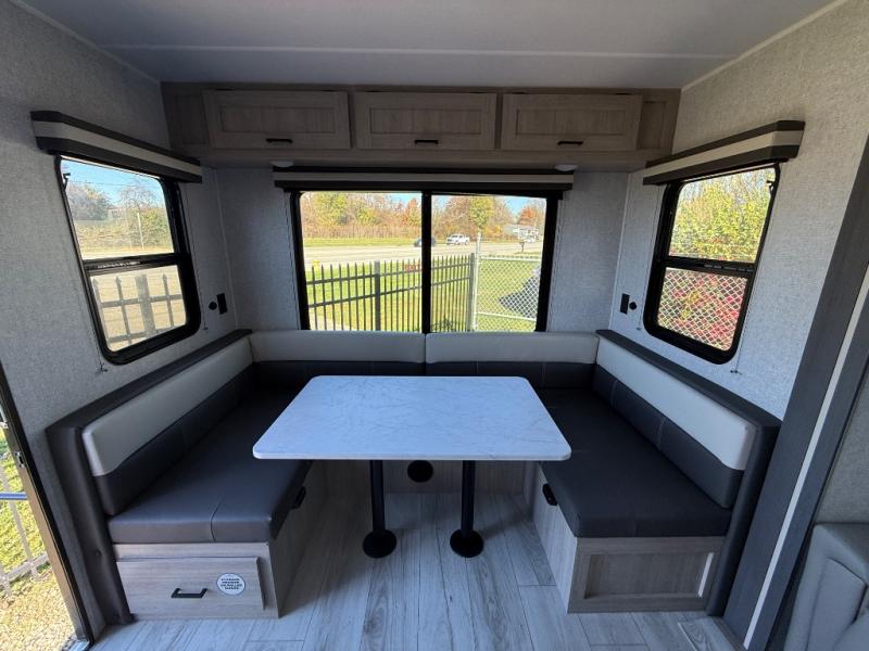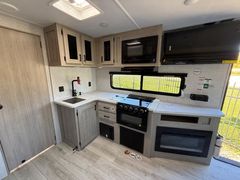 When you are wanting a little more interior space in your next travel trailer, take a look inside! This large slide out widens the main living space so you can easily make meals using full amenities without having to move for someone walking from the front bedroom and walk-through bath to the U-shaped dinette in the back. For sleeping, there is a king-size bed with storage on both sides at the very front of this unit giving you privacy from the rest, and even a private second entry/exit door from within the bedroom. You will find storage beneath the bed for larger items or extra blankets, plus a space saving sliding door. The U-shaped dinette and jackknife sofa offer comfortable seating as well as extra sleeping space for overnight guests, and the fireplace is just a nice feature to enjoy. On the outside, an 18' awning provides a large outdoor living area protected from the elements, and the oversized pass-through will house all of your exterior gear like lawn chairs, outdoor games and rugs, plus so much more!