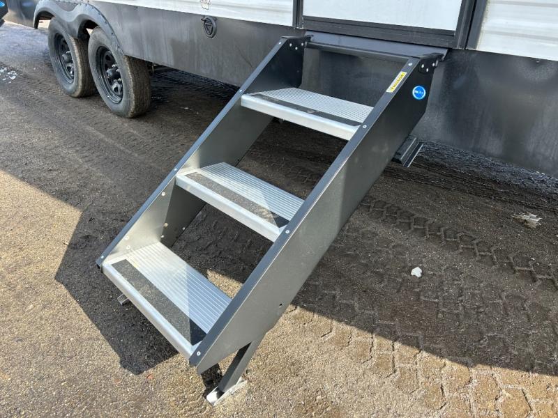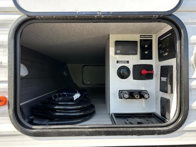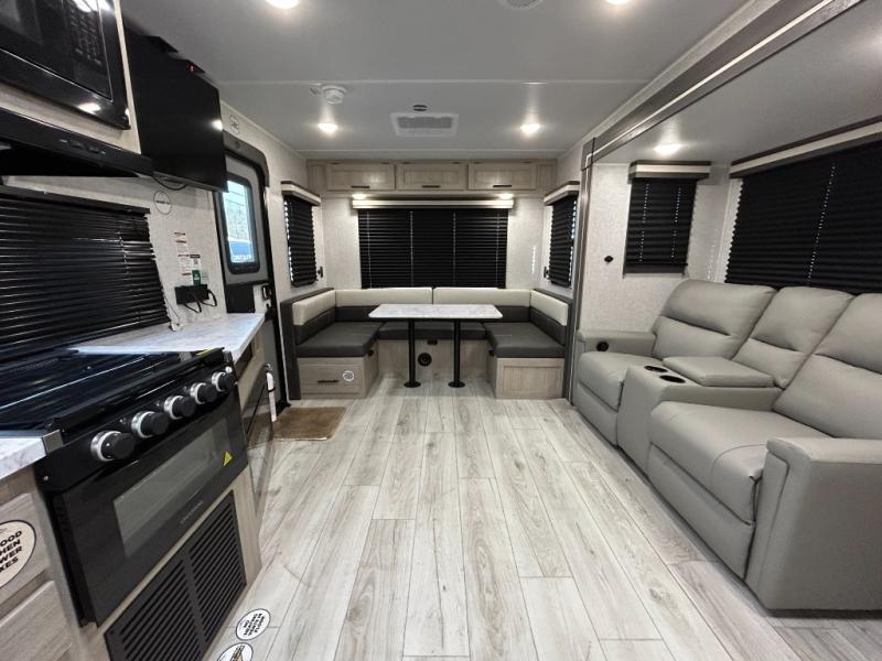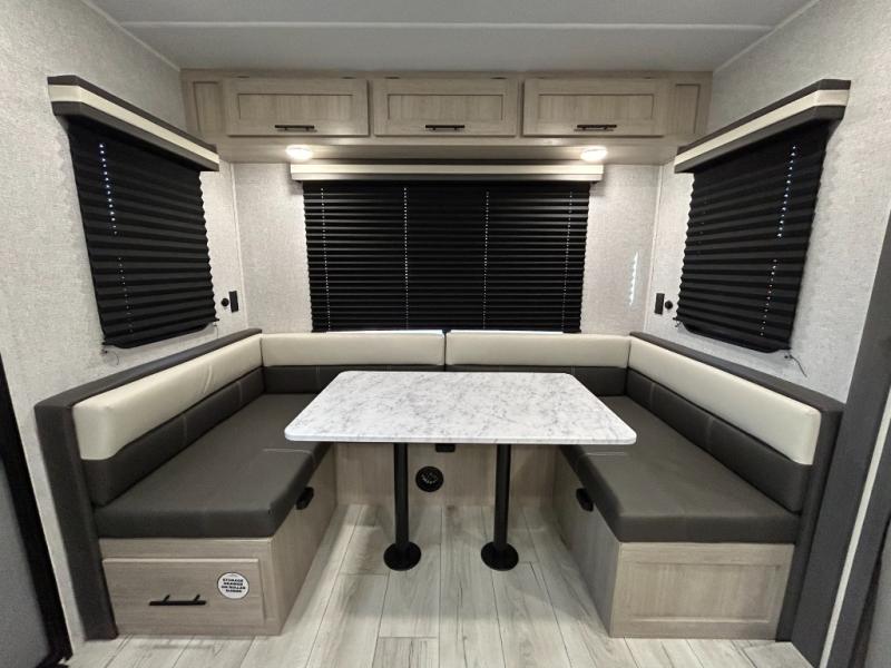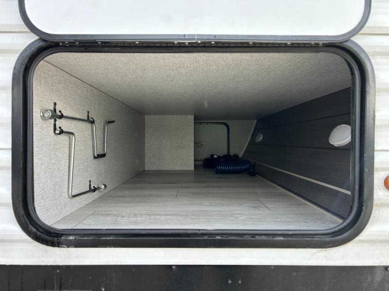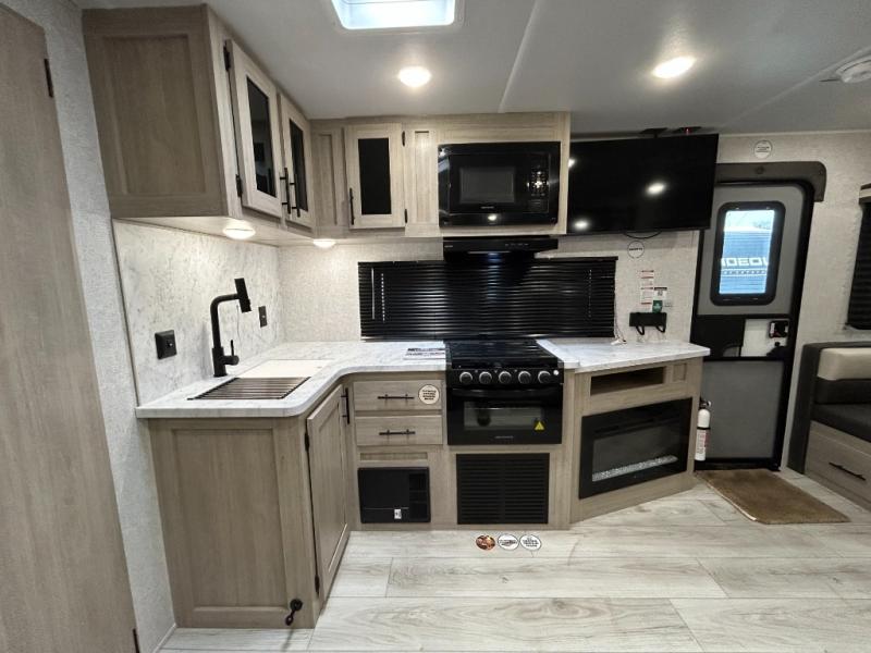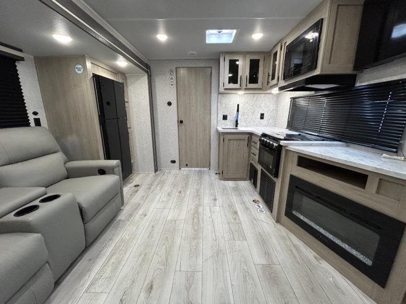 When you are wanting a little more interior space in your next travel trailer, take a look inside! This large slide out widens the main living space so you can easily make meals using full amenities without having to move for someone walking from the front bedroom and walk-through bath to the U-shaped dinette in the back. For sleeping, there is a king-size bed with storage on both sides at the very front of this unit giving you privacy from the rest, and even a private second entry/exit door from within the bedroom. You will find storage beneath the bed for larger items or extra blankets, plus a space saving sliding door. The U-shaped dinette and jackknife sofa offer comfortable seating as well as extra sleeping space for overnight guests, and the fireplace is just a nice feature to enjoy. On the outside, an 18' awning provides a large outdoor living area protected from the elements, and the oversized pass-through will house all of your exterior gear like lawn chairs, outdoor games and rugs, plus so much more!