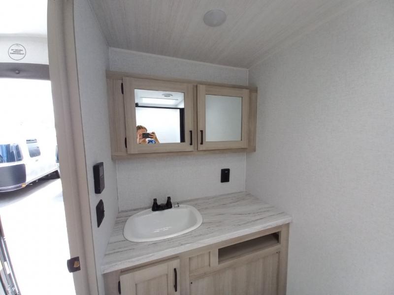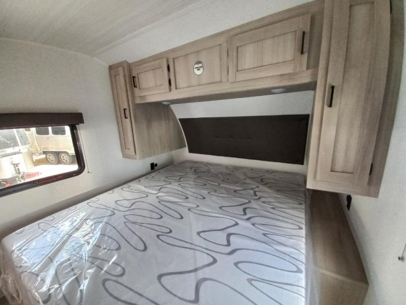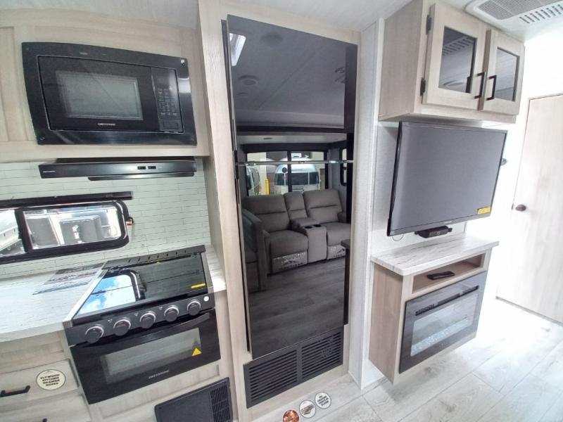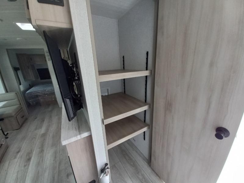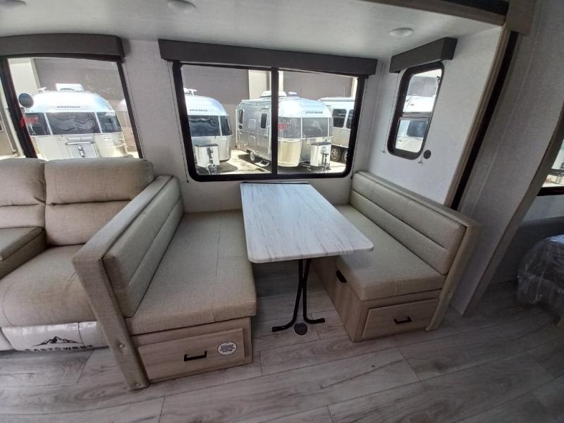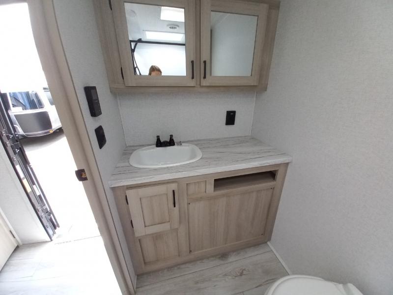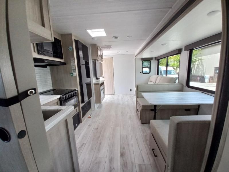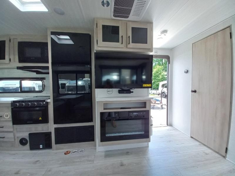 When you are wanting a little more interior space in your next travel trailer, take a look inside! This large slide out widens the center so you can easily make meals using full amenities without having to move for someone walking from the front private bedroom to the rear spacious bathroom. There is a king-size bed with storage on both sides, underneath and above, plus a space saving sliding door. The booth dinette and jiffy sofa offer comfortable seating as well as extra sleeping space for overnight guests. The fireplace is just a nice feature to enjoy, and the large pantry with washer/dryer prep gives you the option to make laundry day easier!