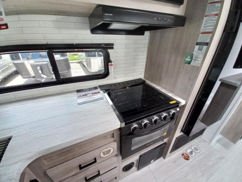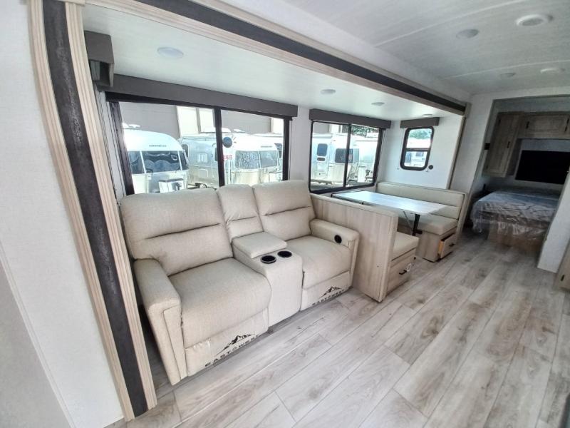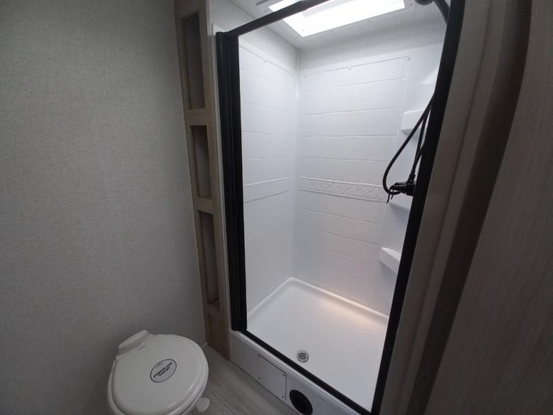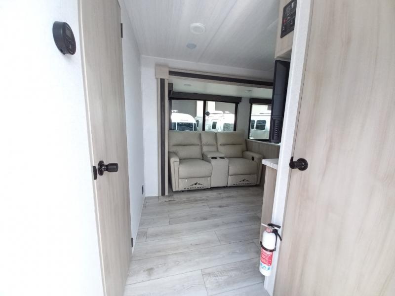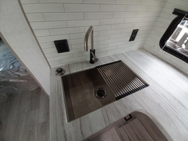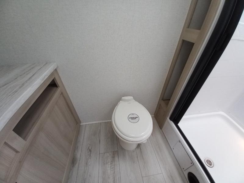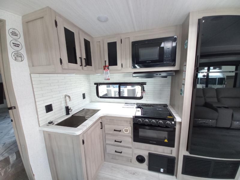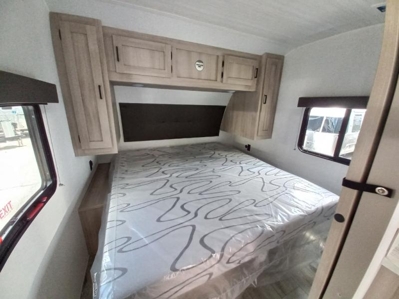 When you are wanting a little more interior space in your next travel trailer, take a look inside! This large slide out widens the center so you can easily make meals using full amenities without having to move for someone walking from the front private bedroom to the rear spacious bathroom. There is a king-size bed with storage on both sides, underneath and above, plus a space saving sliding door. The booth dinette and jiffy sofa offer comfortable seating as well as extra sleeping space for overnight guests. The fireplace is just a nice feature to enjoy, and the large pantry with washer/dryer prep gives you the option to make laundry day easier!