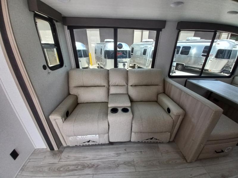 Each Della Terra travel trailer by EAST TO WEST is constructed with an enclosed and heated underbelly and enclosed holding tanks so you can camp all year long. There is also a power tongue jack with an LED light for easy set up and a power awning with LED lights you can rest under after you've unpacked. The Explore Comfort Package comes seamless pressed countertops, kitchen backsplash, window valance package with black night shades, and many more comforts. You will also appreciate the Adventure Outdoor Package with backup camera prep and solar prep, a tankless water heater, an RV grill quick disconnect, and a universal docking station with battery disconnect.