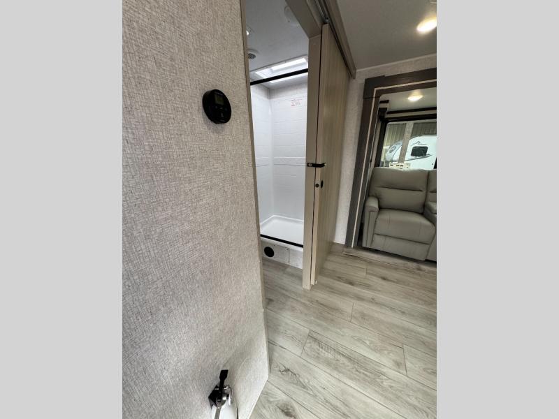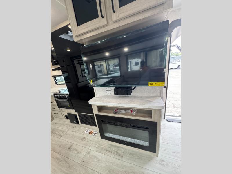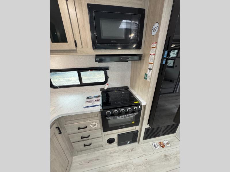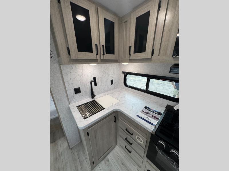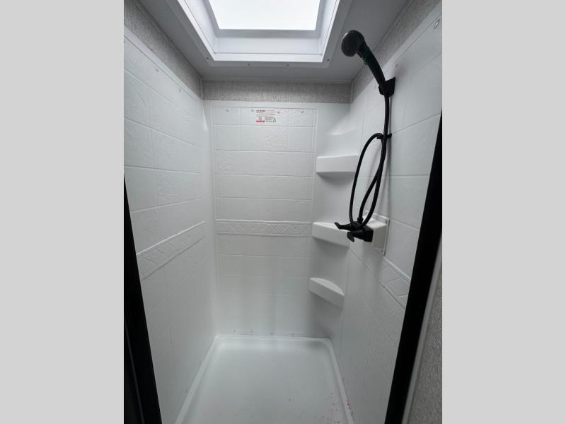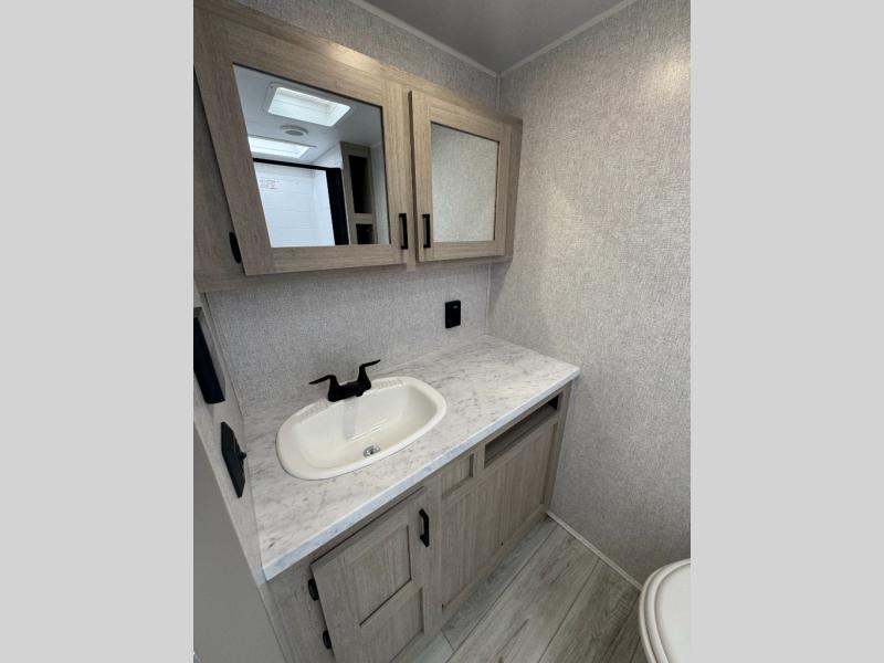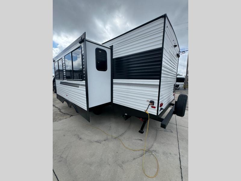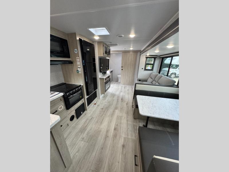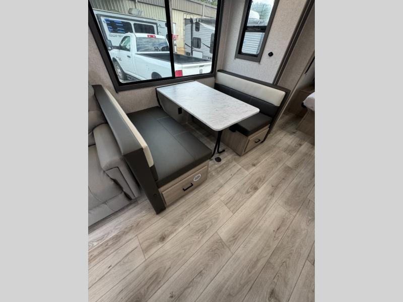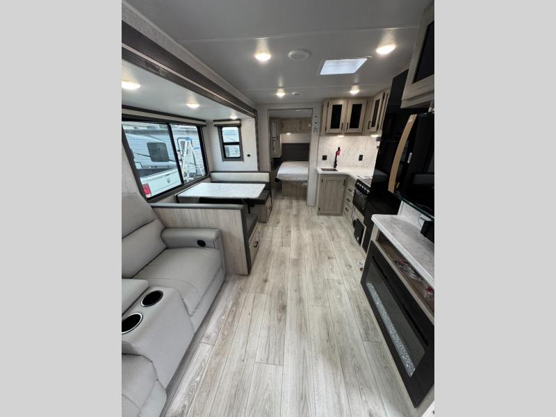 When you are wanting a little more interior space in your next travel trailer, take a look inside! This large slide out widens the center so you can easily make meals using full amenities without having to move for someone walking from the front private bedroom to the rear spacious bathroom. There is a king-size bed with storage on both sides, underneath and above, plus a space saving sliding door. The booth dinette and jiffy sofa offer comfortable seating as well as extra sleeping space for overnight guests. The fireplace is just a nice feature to enjoy, and the large pantry with washer/dryer prep gives you the option to make laundry day easier!