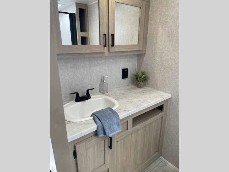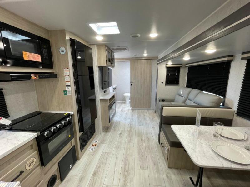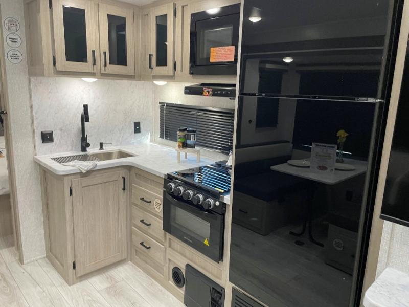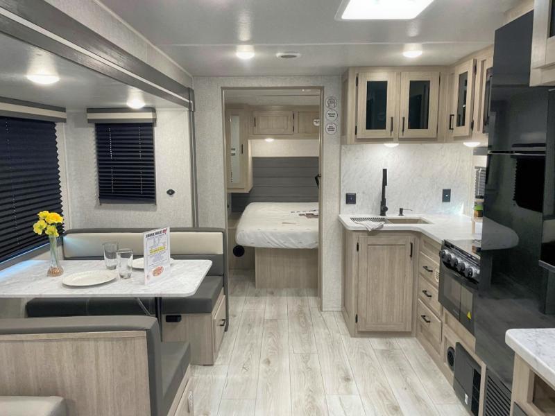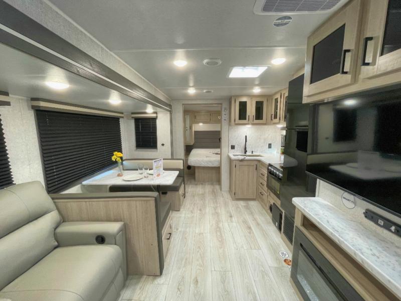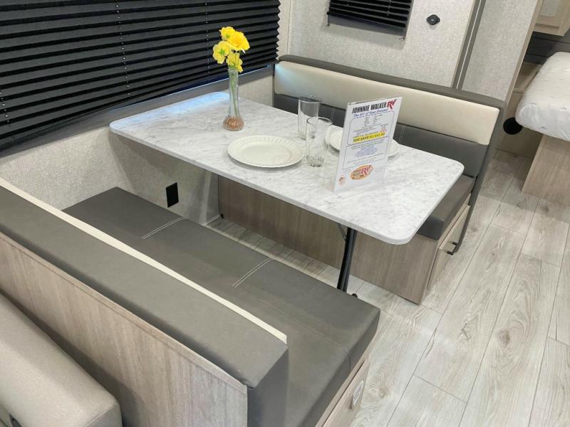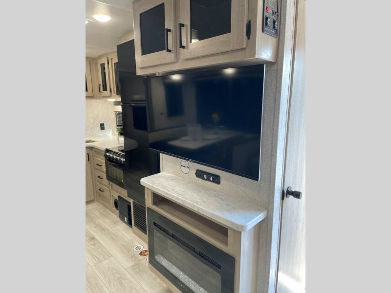 When you are wanting a little more interior space in your next travel trailer, take a look inside! This large slide out widens the center so you can easily make meals using full amenities without having to move for someone walking from the front private bedroom to the rear spacious bathroom. There is a king-size bed with storage on both sides, underneath and above, plus a space saving sliding door. The booth dinette and jiffy sofa offer comfortable seating as well as extra sleeping space for overnight guests. The fireplace is just a nice feature to enjoy, and the large pantry with washer/dryer prep gives you the option to make laundry day easier!